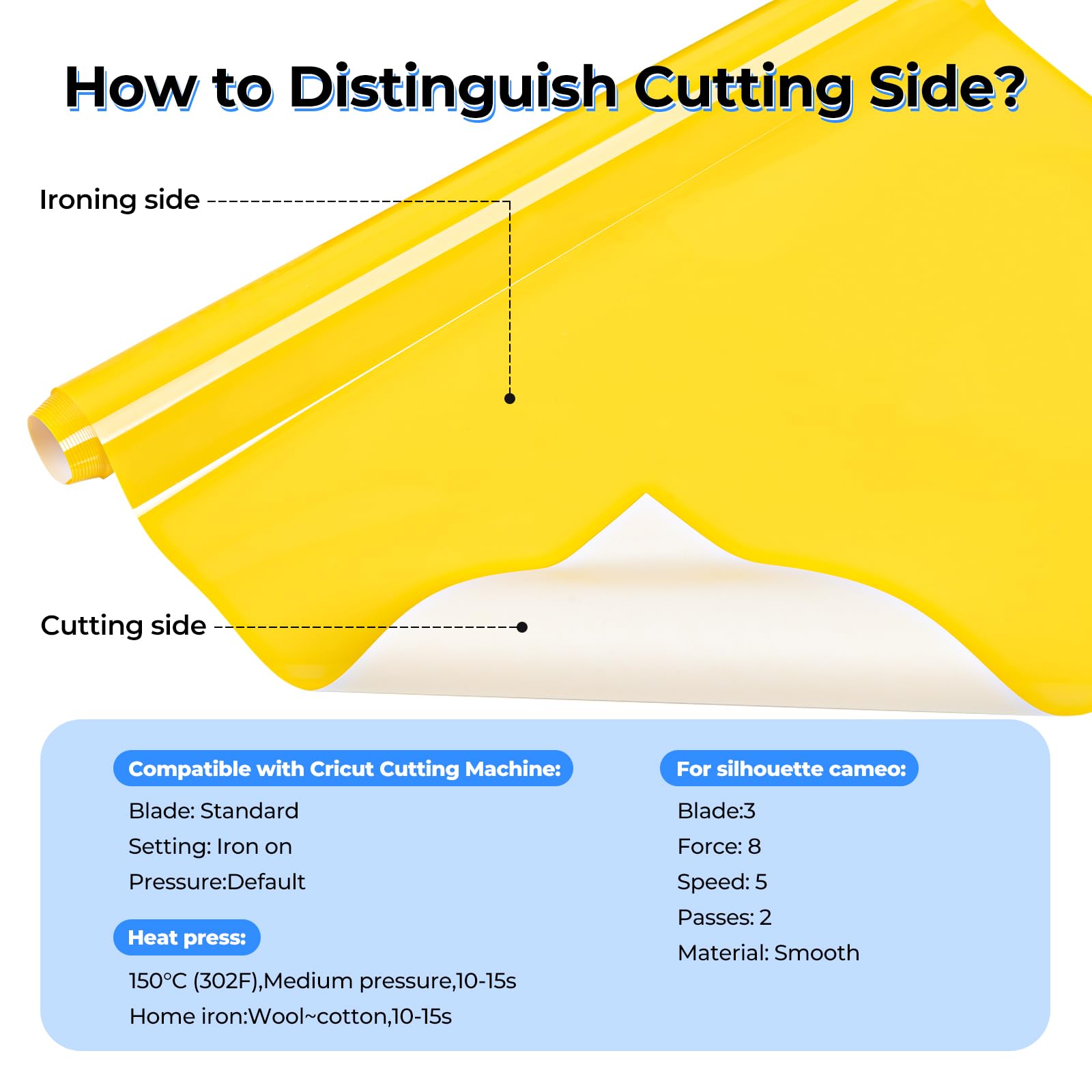 【EASY TO CUT & WEED & TRANSFER】Our high-quality yellow htv is easy to cut, weed and transfer. The yellow iron on vinyl will save your time on figuring out the cutting side and the image you cut, which is compatible with most cutting machines. You could follow the steps to set the parameters to achieve precise cutting, weeding and ironing. Our yellow htv vinyl is temperature, pressure sensitive and can be easily torn off once the design is transferred to the fabric
