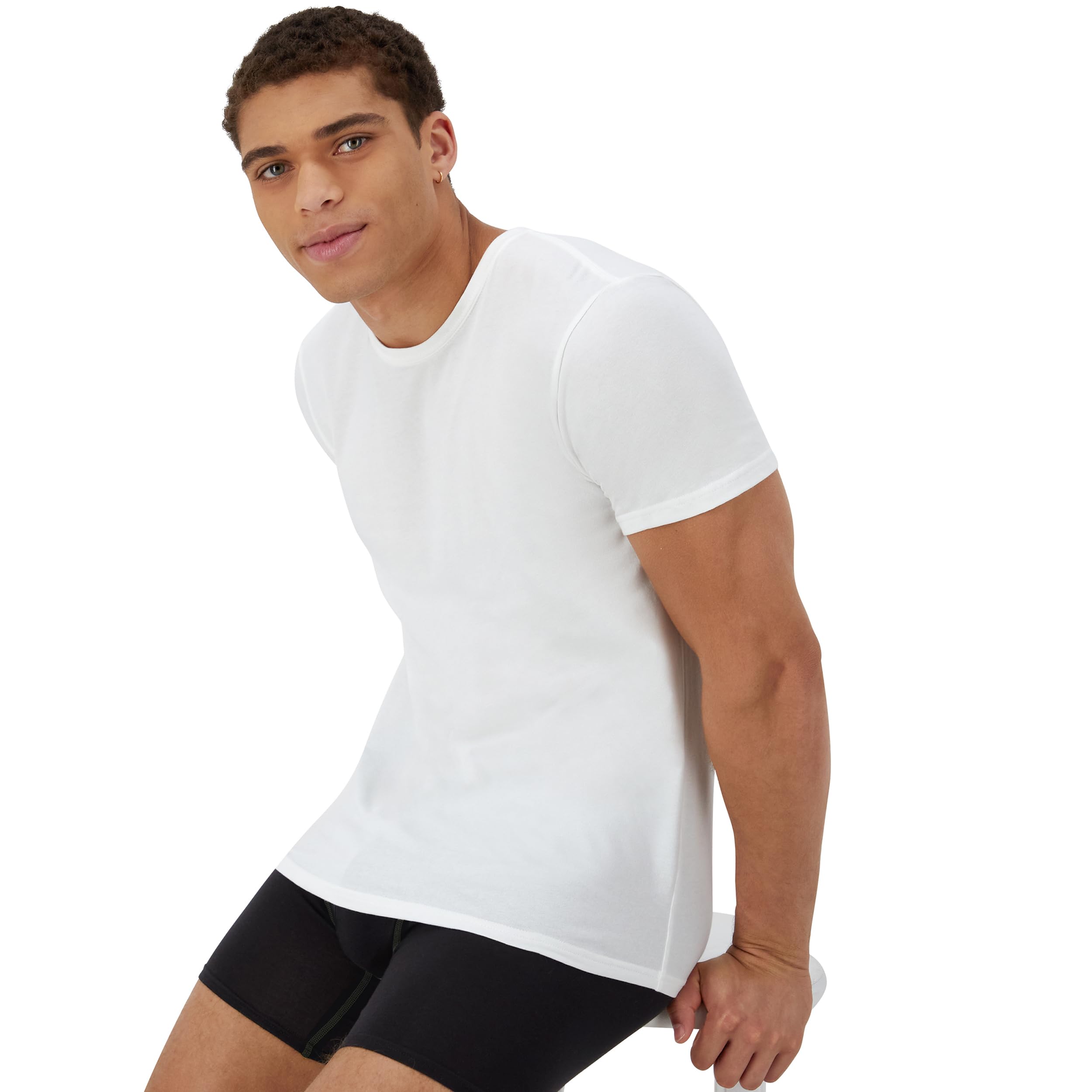 Description Hanes Ultimate® Comfort Fit stay-tucked t-shirts are crafted from lightweight, breathable ringspun cotton that includes just a touch of spandex for stretchy, move-with-you comfort. The moisture-wicking fabric features anti-odor technology, keeping you cooler and fresher all day long. The classic crewneck design stays tucked in for the perfect fit under shirts. No need to worry about irritating tags, thanks to the smooth Tagless® interior. This men’s undershirt comes in a convenient 4-pack, so you can always keep a fresh Hanes tee on hand.