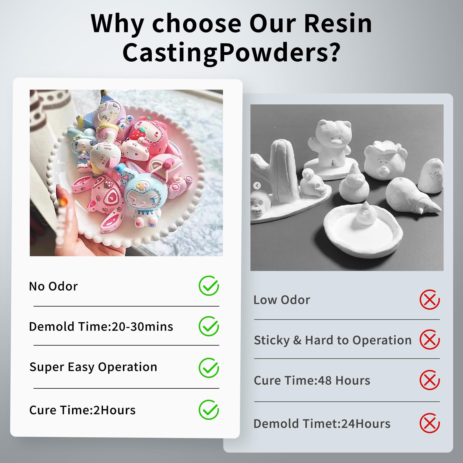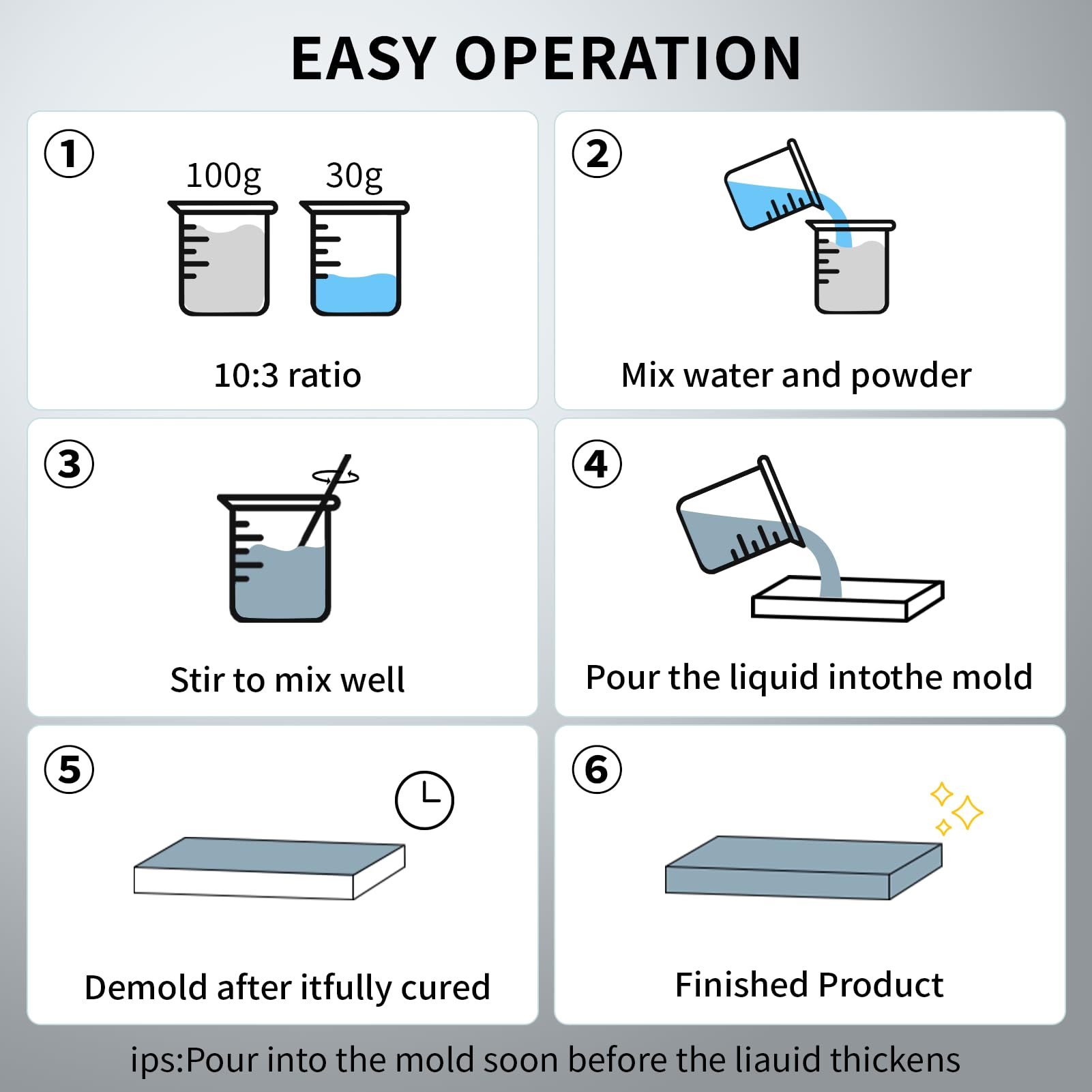 【Simple Steps for Reliable Results】 Follow an efficient process with included tools: 1. Measure with provided cups. 2. Mix powder and water at a 3:1 weight ratio using the stirring rod. 3. Pour into mold and demold in 20-30 minutes. The mixture self-levels and minimizes bubbles. 4. Polish with included sandpapers for a refined finish.