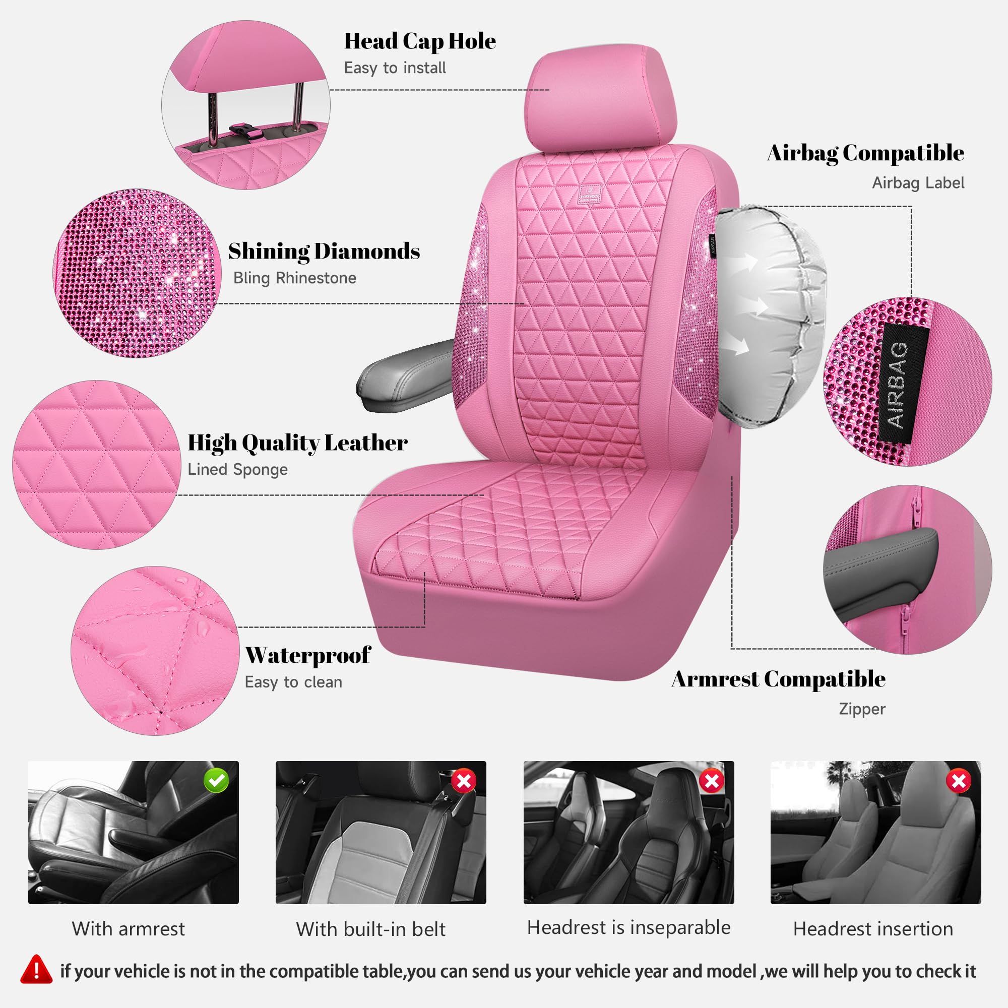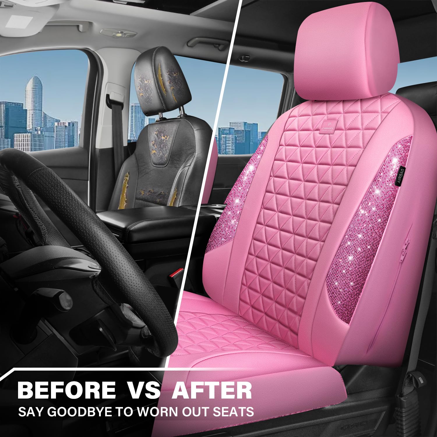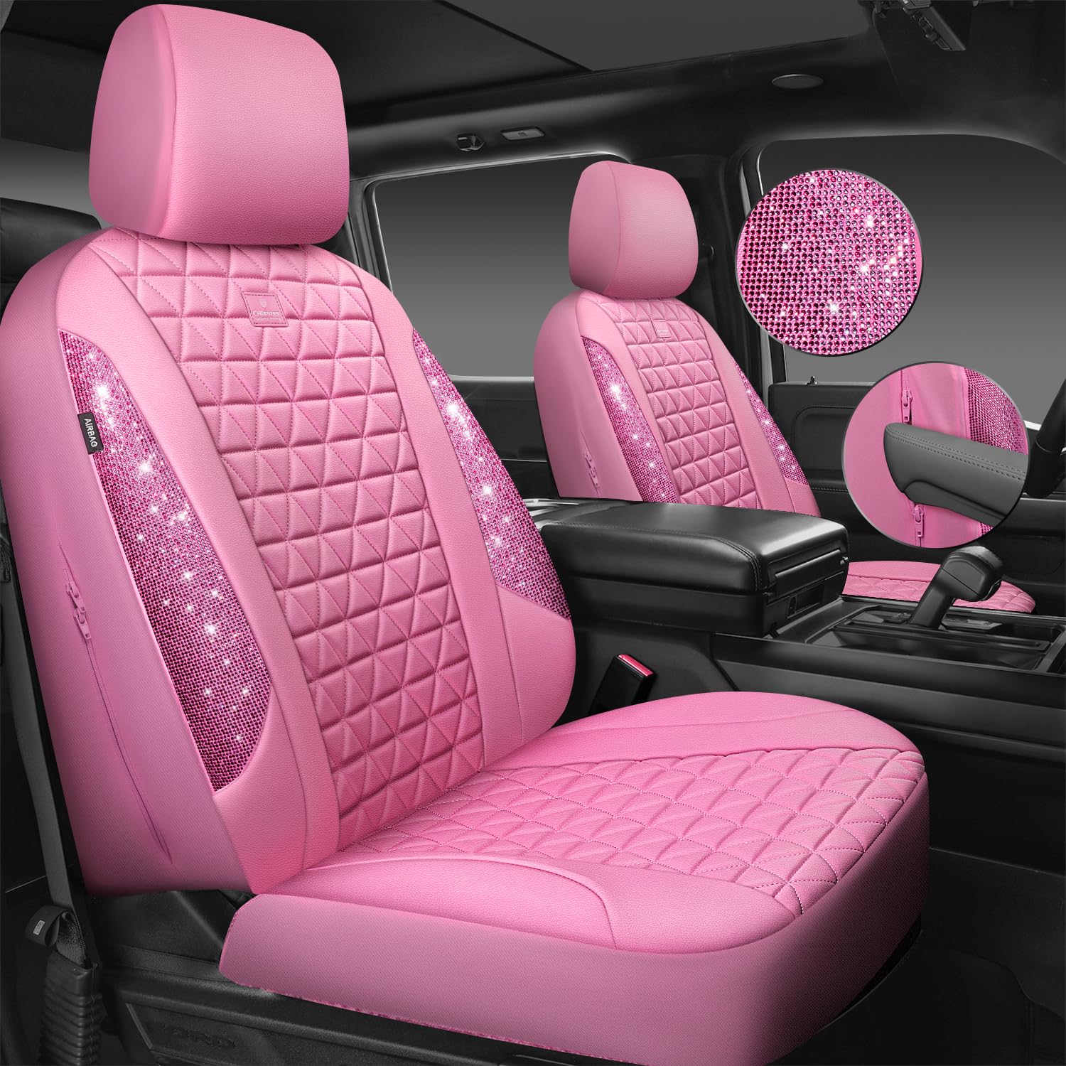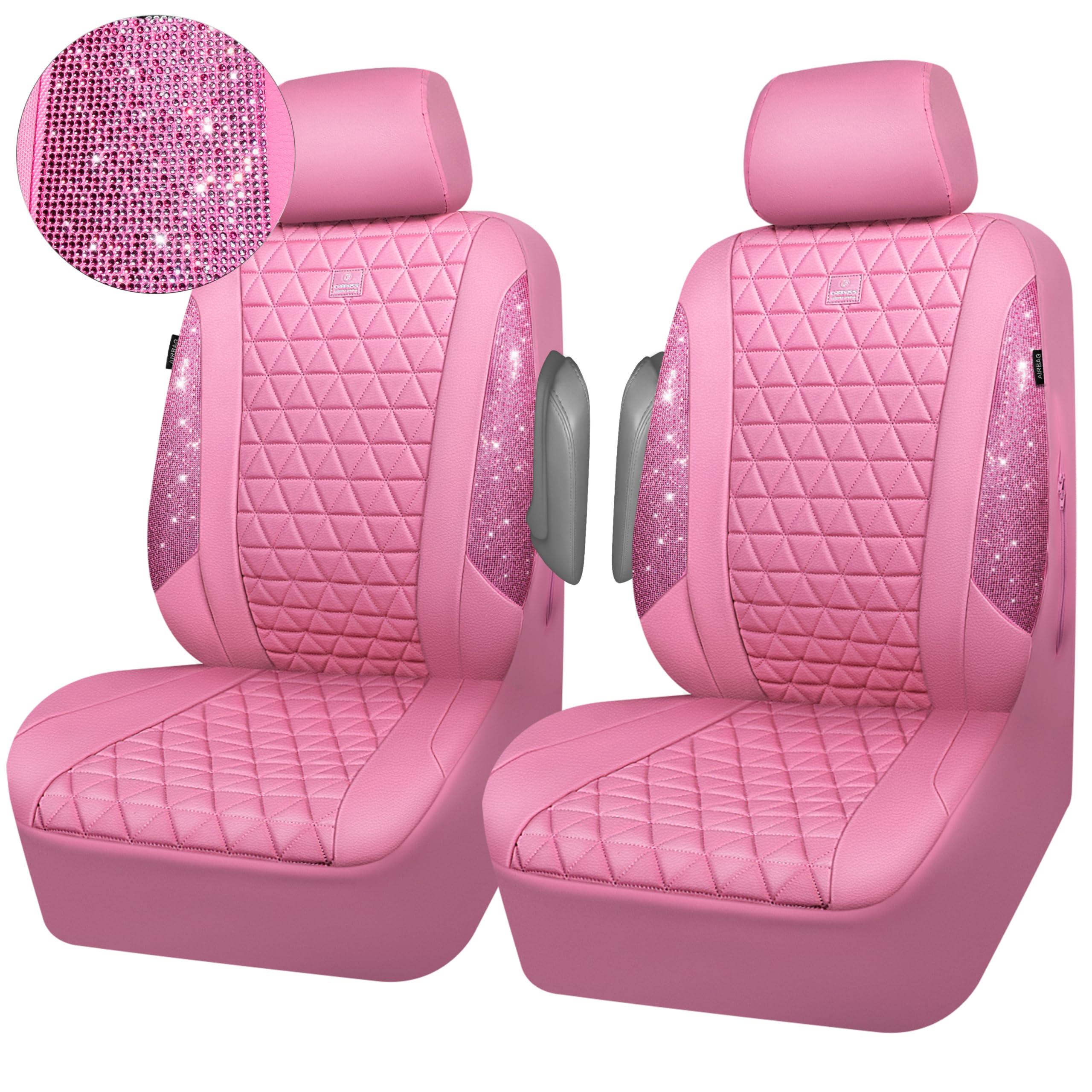 UNIVERSAL SPARKLY DIAMOND - Refresh your car if you install the bing bling crystal diamond leather seat covers, water resistant material. Surface rhombic texture design lined sponge soft and comfortable. Fit for most SUV Sedan Pickup coupe automobile vehicle seats with adjustable headrests. Can be installed with the detachable headrests. Easy to install, with installation manual, can be installed in 10 minutes