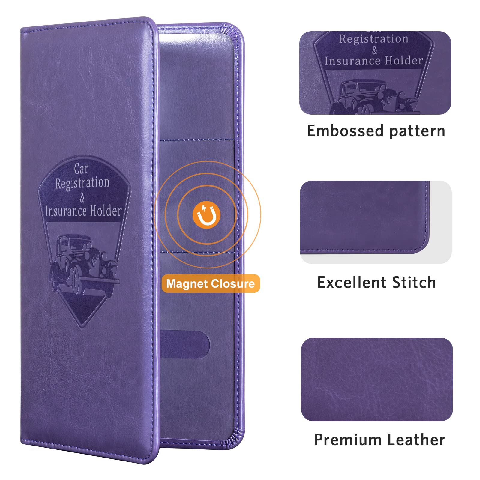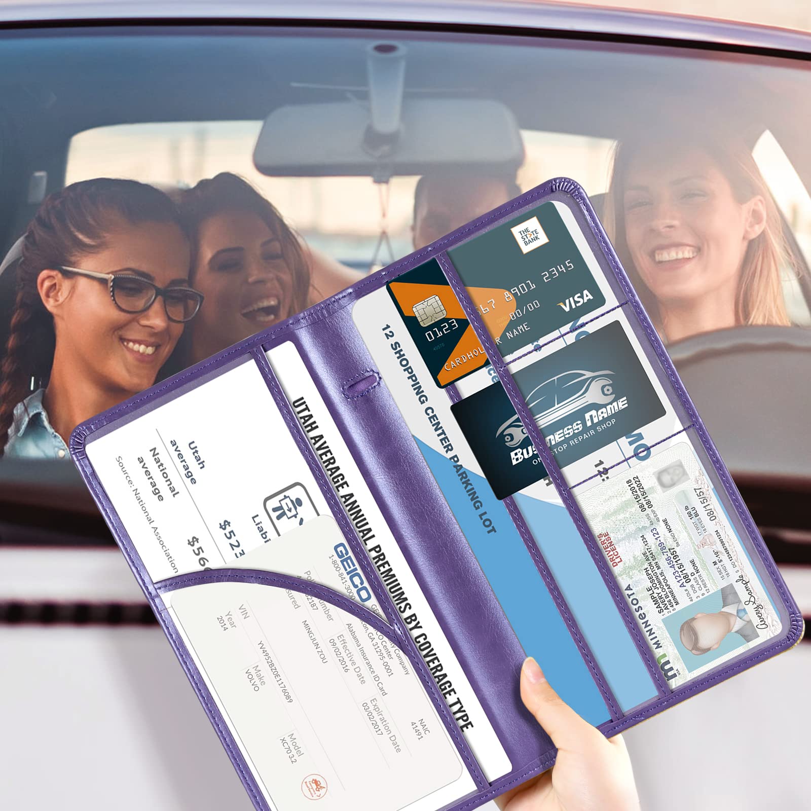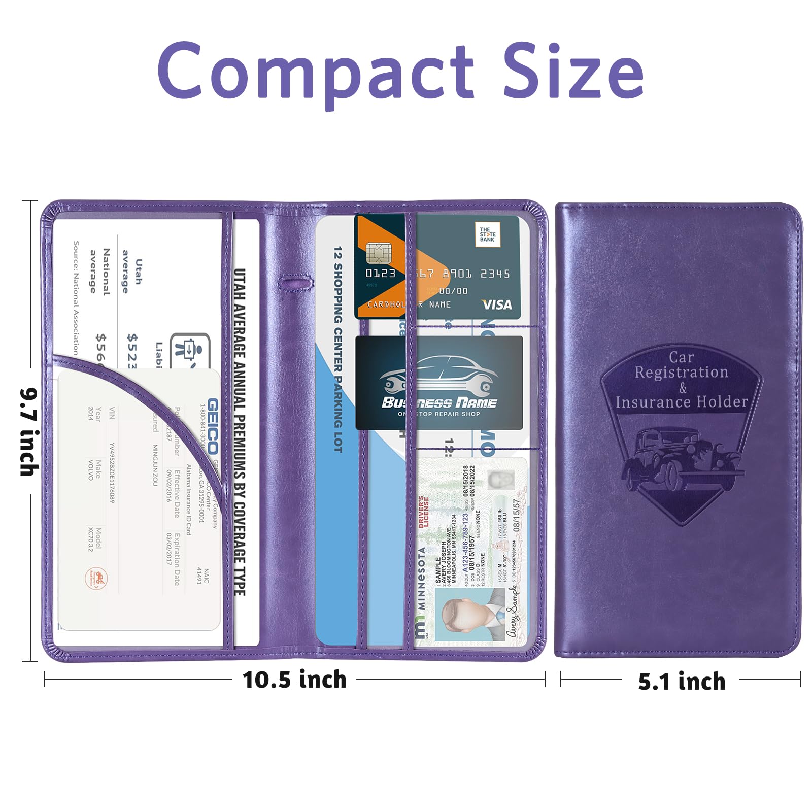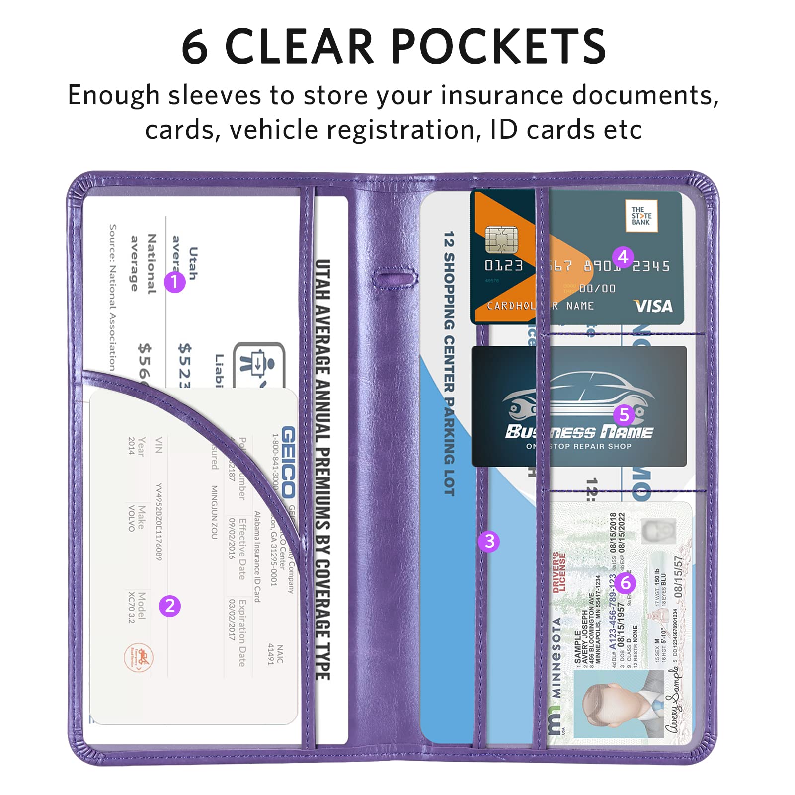 6 COMPARMENTS: Comes with 3 large pockets for insurance documents, vehicle registrations cards and other valueable information. And 3 small pocket for driver's license, ID cards, business cards, key contact information cards.