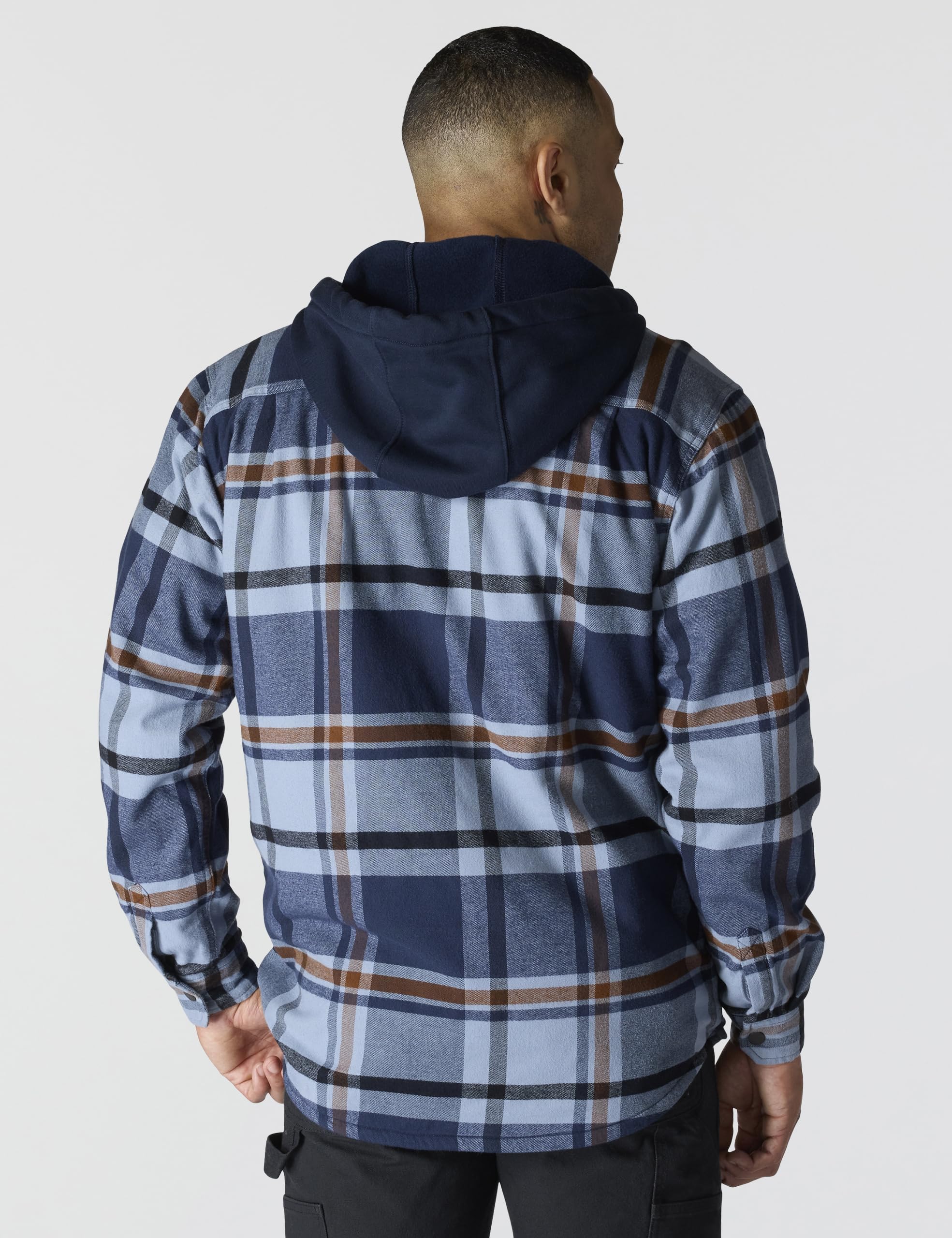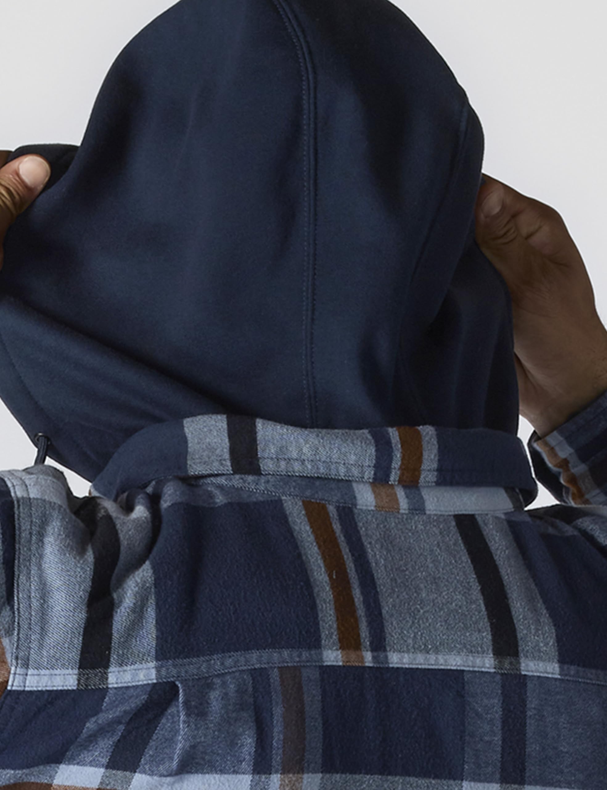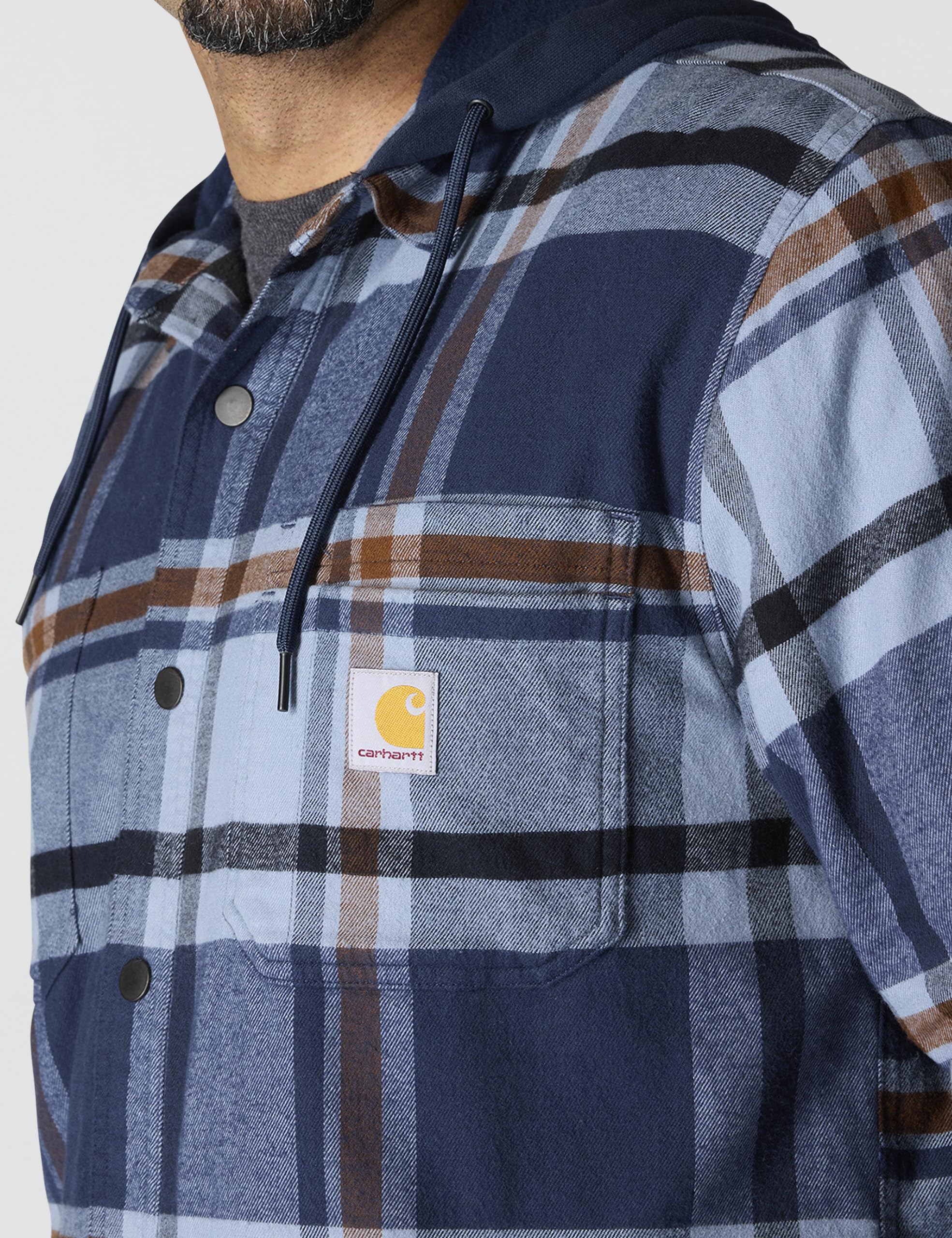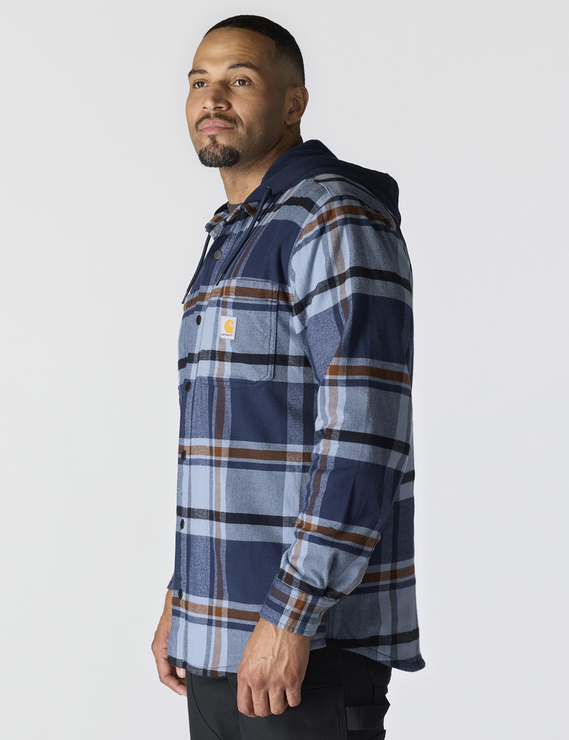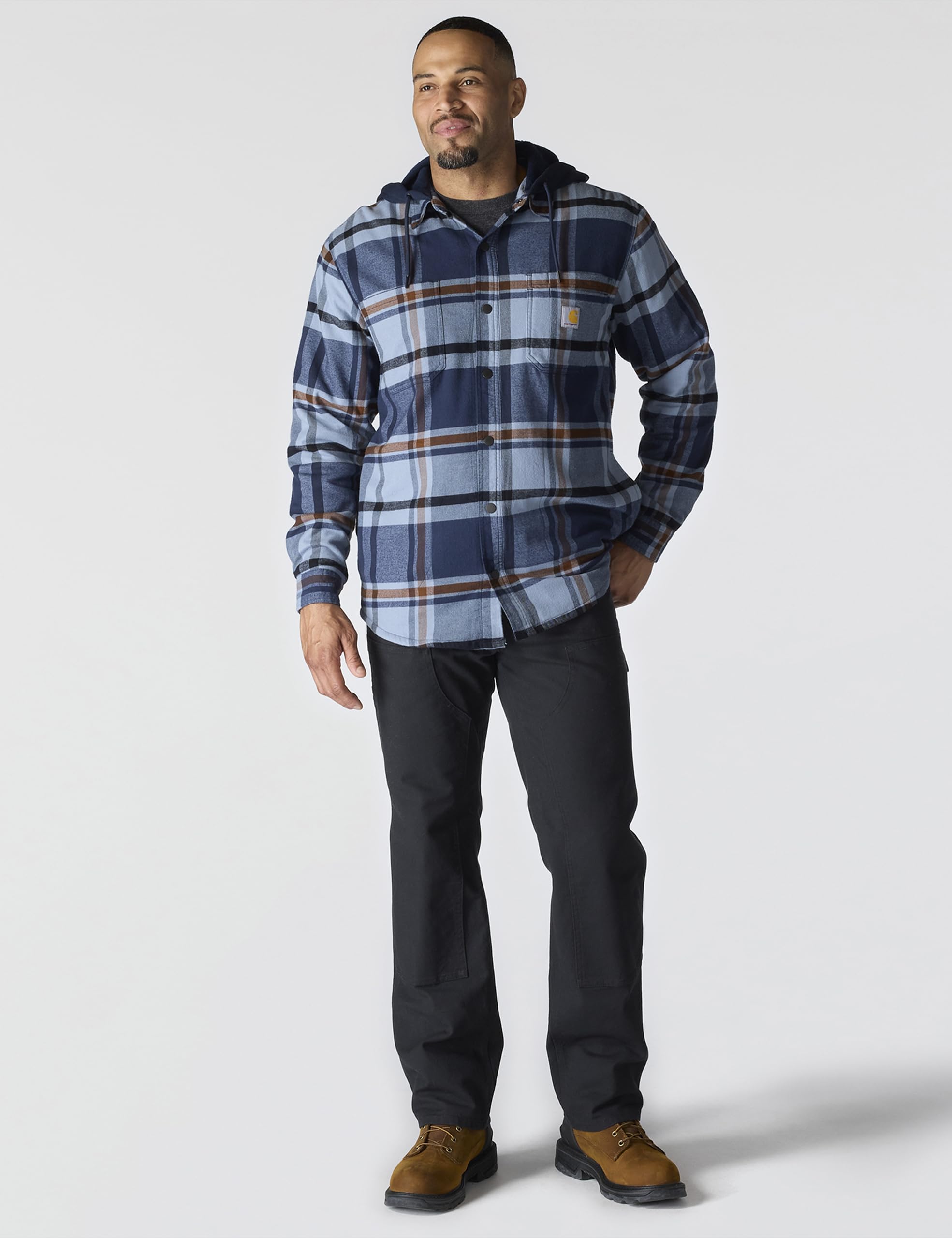 Description Made for work that requires a full range of motion, this men's Carhartt hooded flannel shirt jac is a versatile layer for cold shops and outdoor work. It's fleece-lined for warmth with built-in flex for an unrestricted range of motion. A relaxed fit offers a little extra room to bend and move.