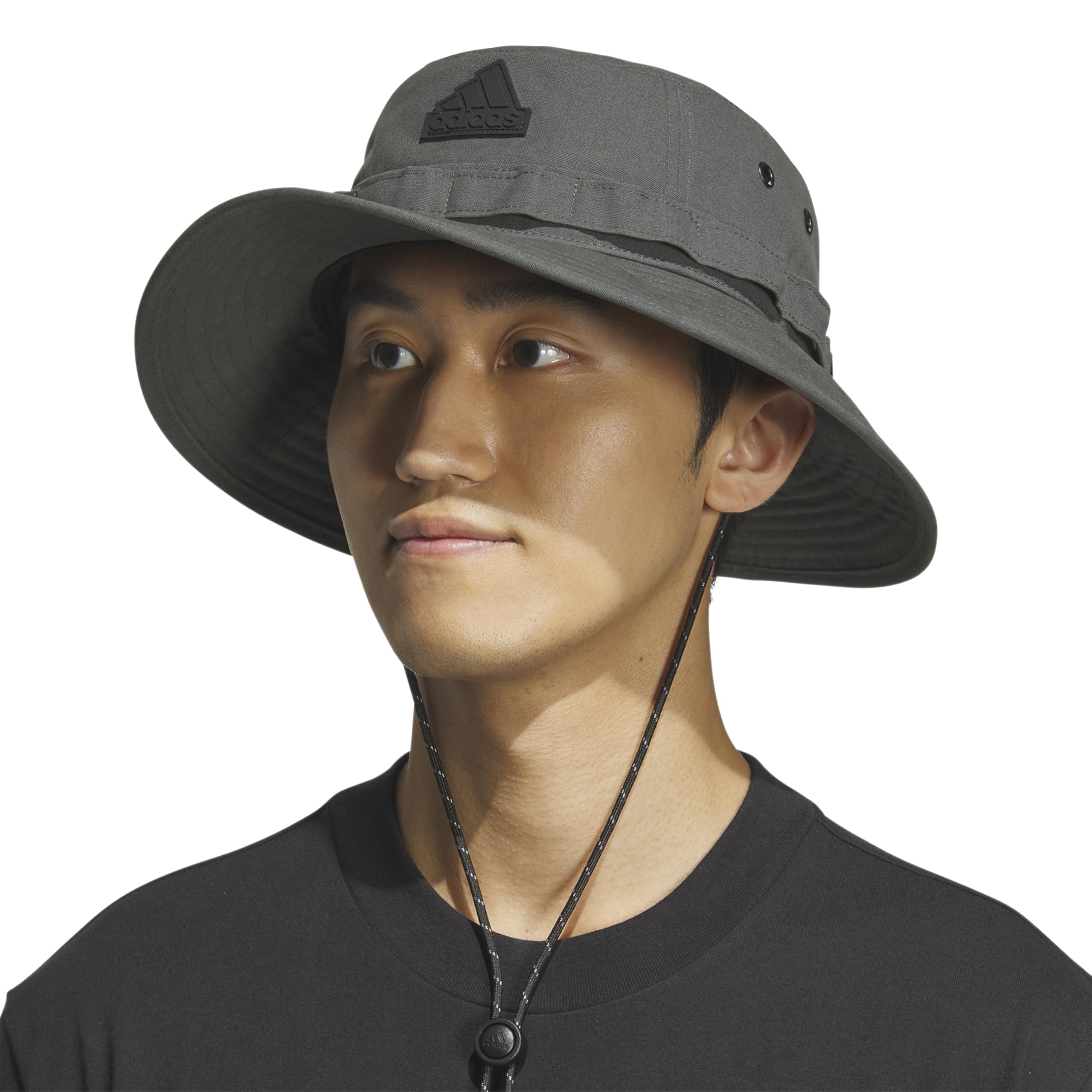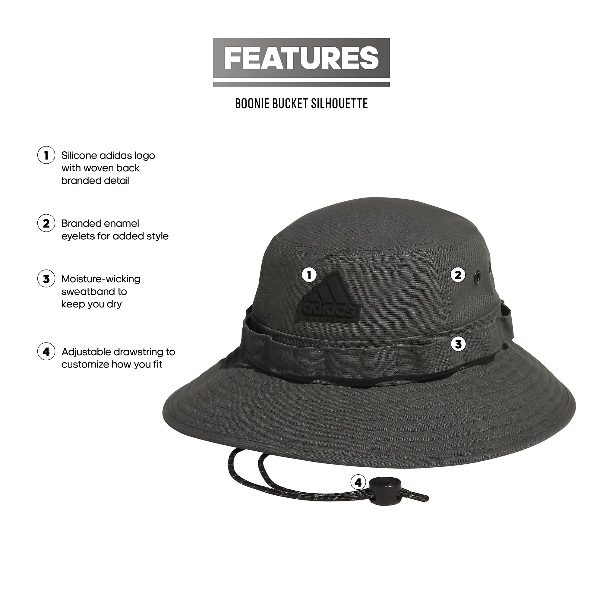 Description Look good and feel good all at once when you wear this adidas boonie hat. A simple, clean design elevates your everyday look. Cotton feels extra comfortable. Adjust the chin strap for the perfect fit. A silicone Badge of Sport logo adds texture and depth.
