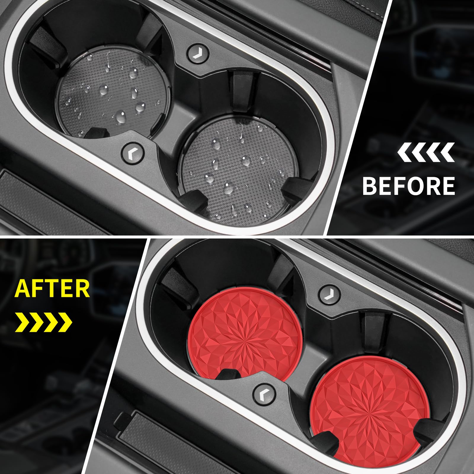 FIT MOST CAR CUP HOLDER SIZE: The thickening car cup coaster's thickness is 0.27'', the deep hem design can hold more overflow of water, juice and liquor from the cup. Diameter: 2.75'', which is suitable for most car cup holder applications. [ Please measure your car's cup slot size before purchasing, to avoid the size error to bring you trouble. ]