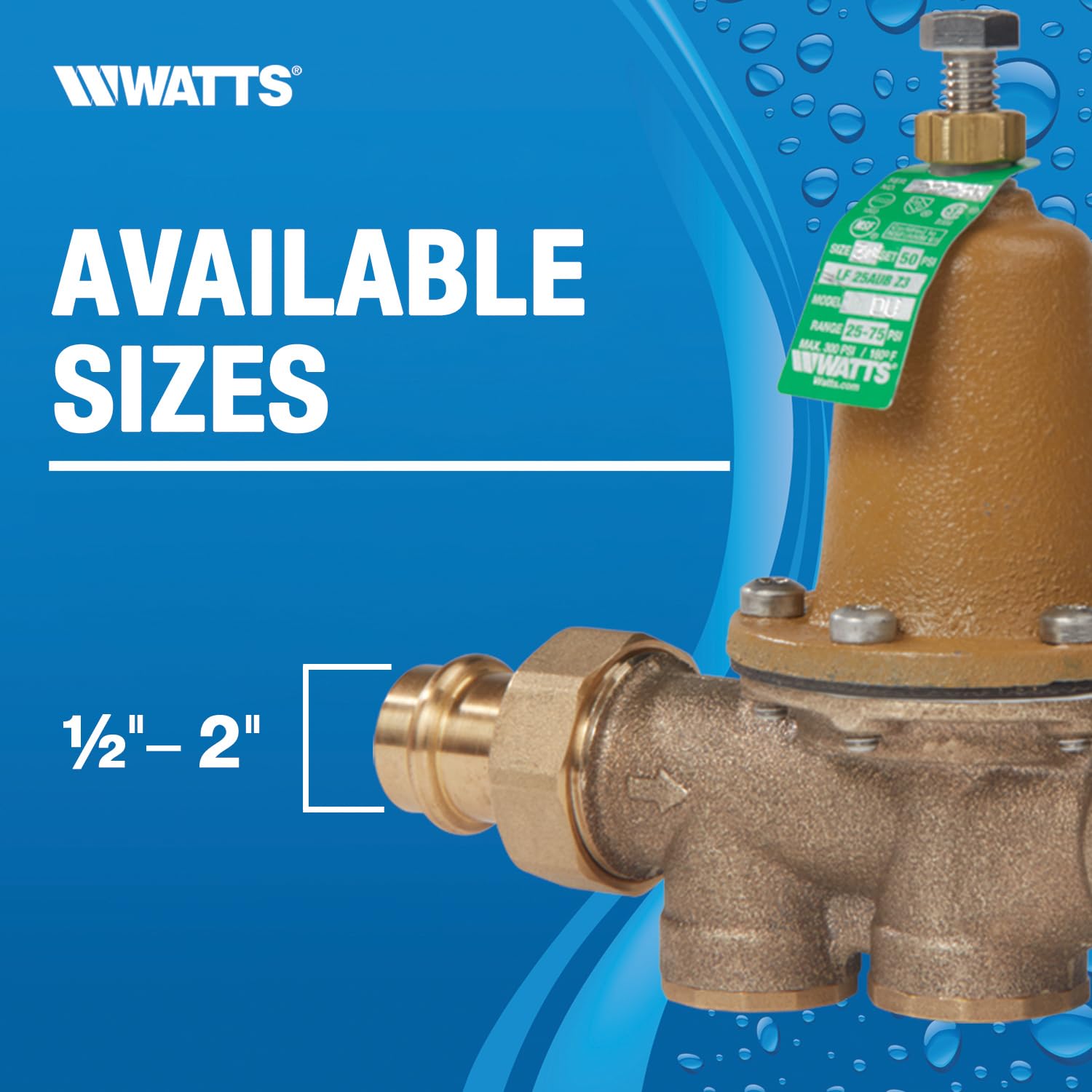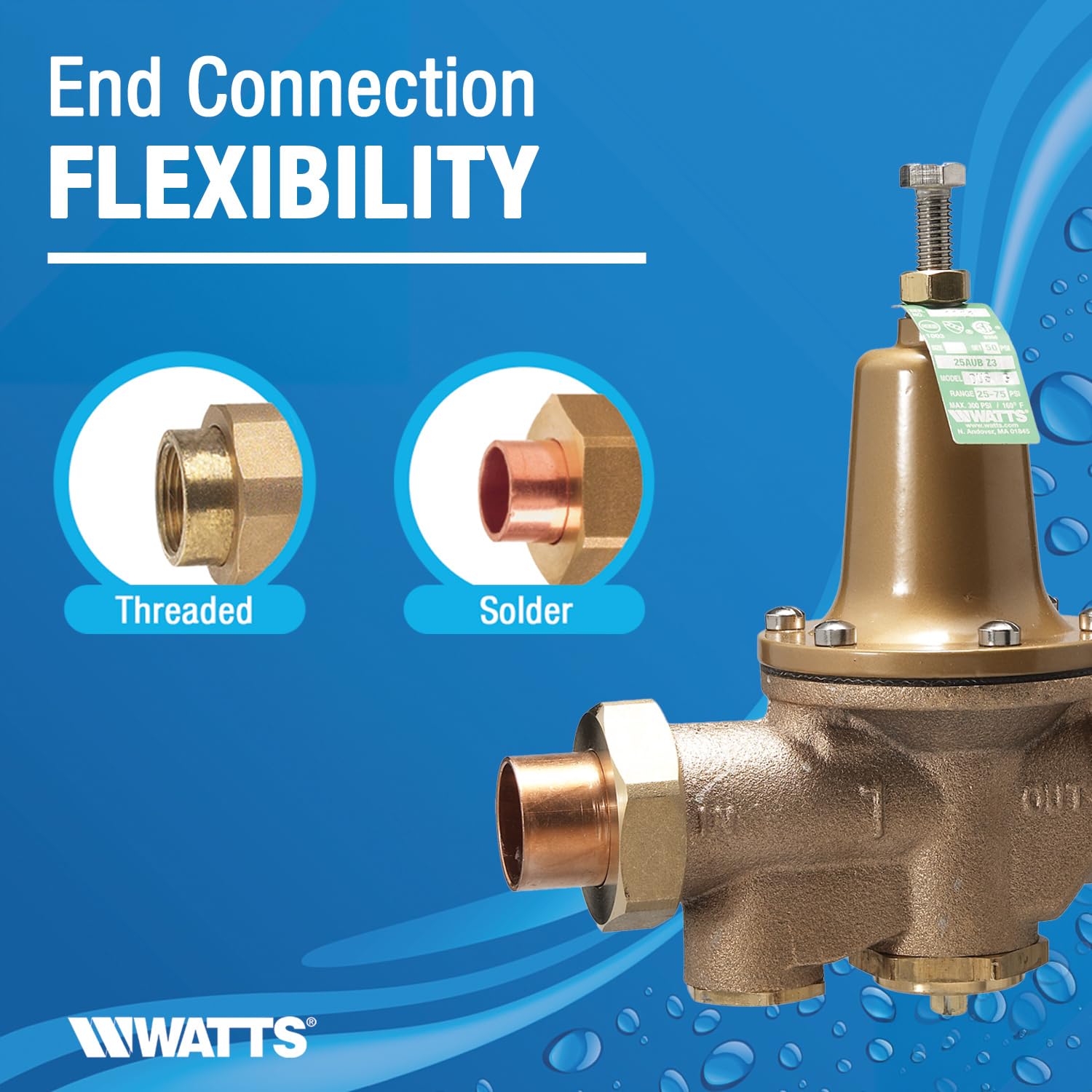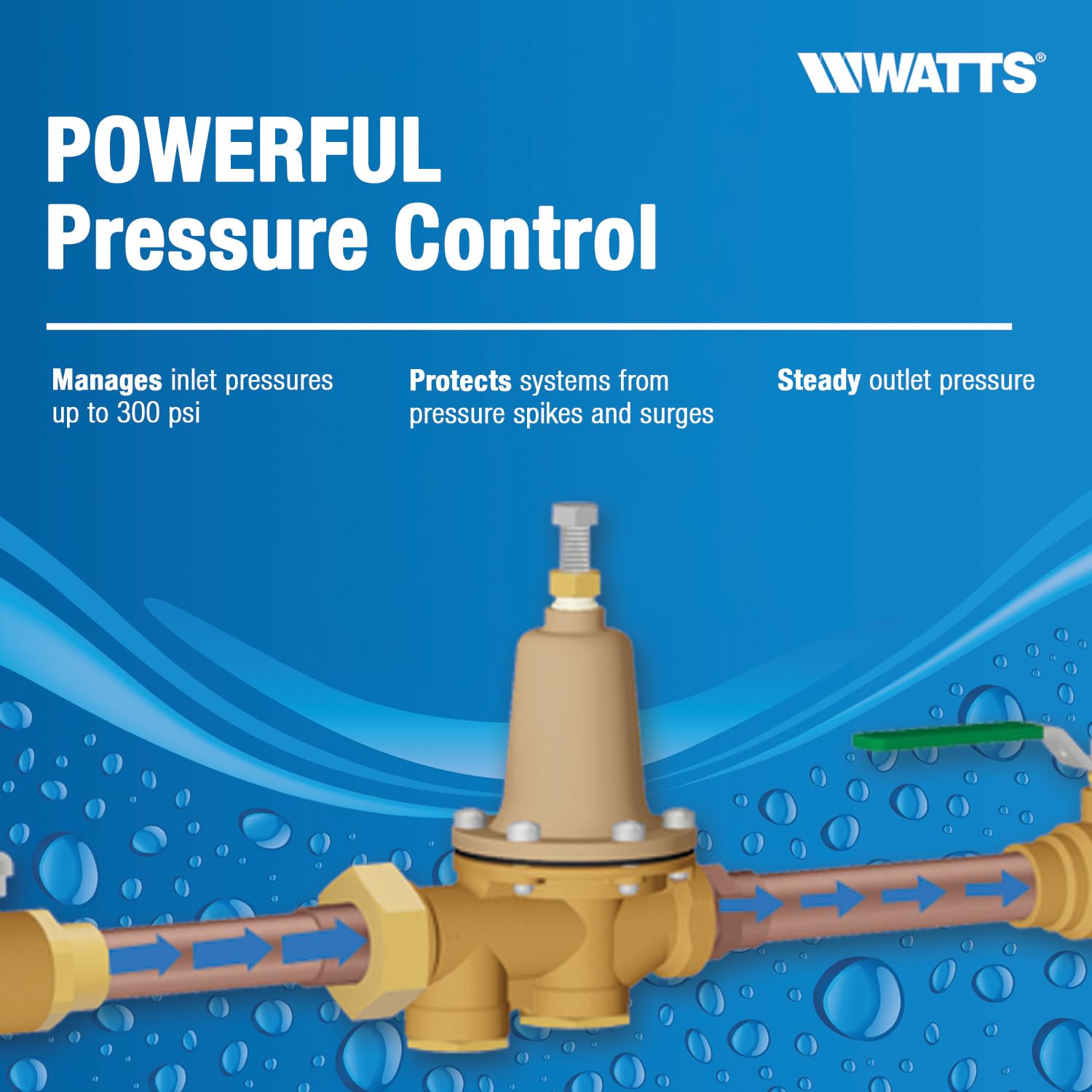 LEAD-FREE WATER PRESSURE REDUCTION: Ideal for low-pressure applications, the Watts 3/4" Lead-Free Water Pressure Reducing Valve reduces incoming water pressure to protect plumbing systems and reduce water consumption in commercial, industrial, and residential applications. This assembly includes a removable integral stainless steel strainer, replaceable seat module, thermal expansion bypass, high-temperature diaphragm, and a sealed spring case with stainless steel cage screws.
