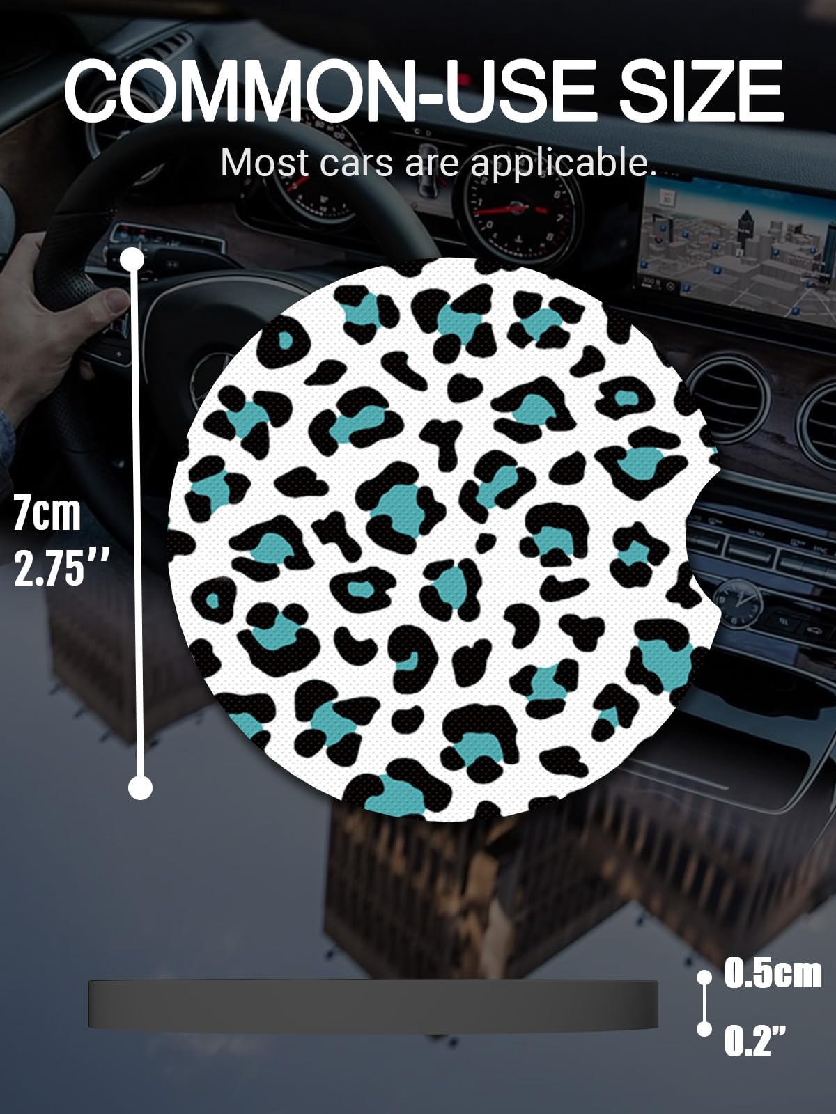 Diameter 2.75 inch, thick 0.2inch.These car cup holder coasters are general dimensions. We suggest that you measure your size to make sure it matches