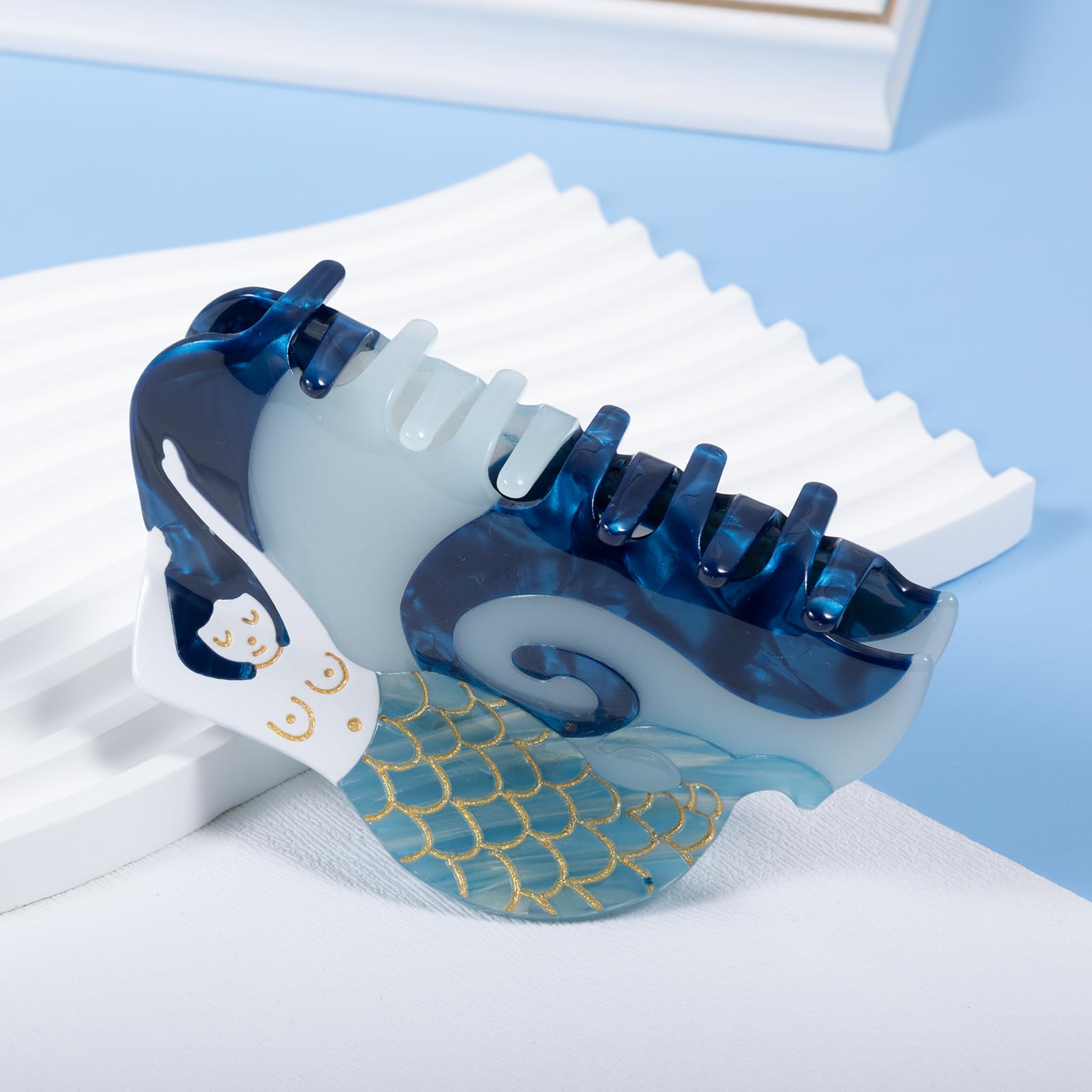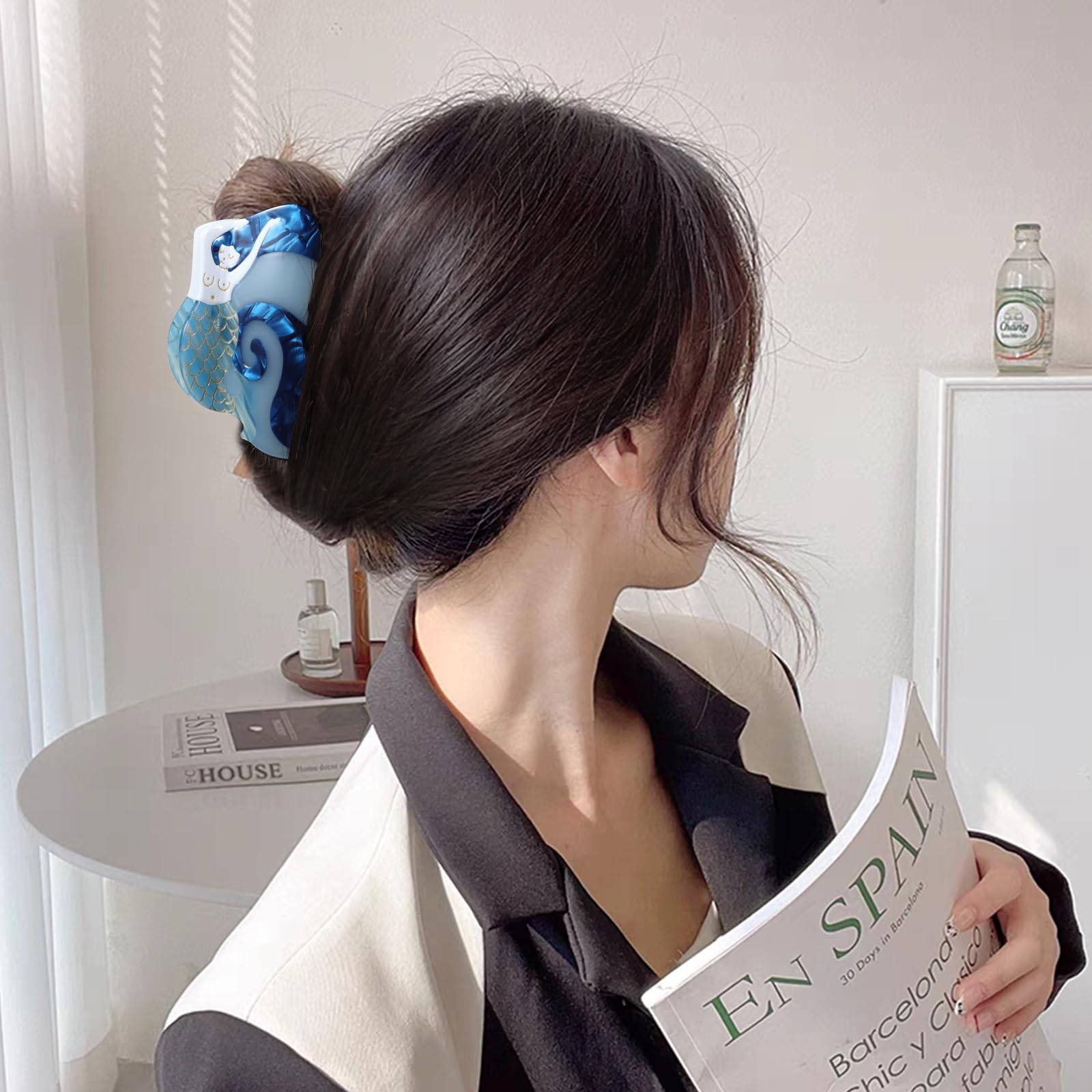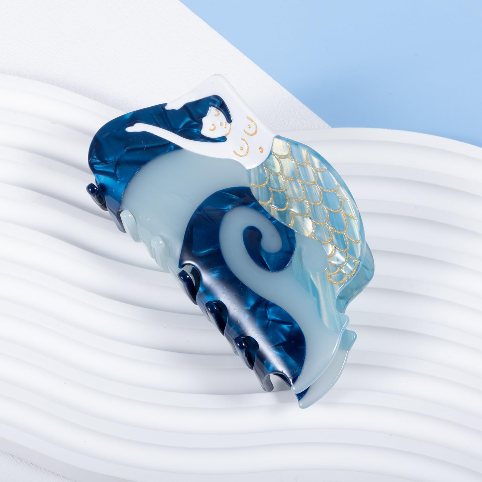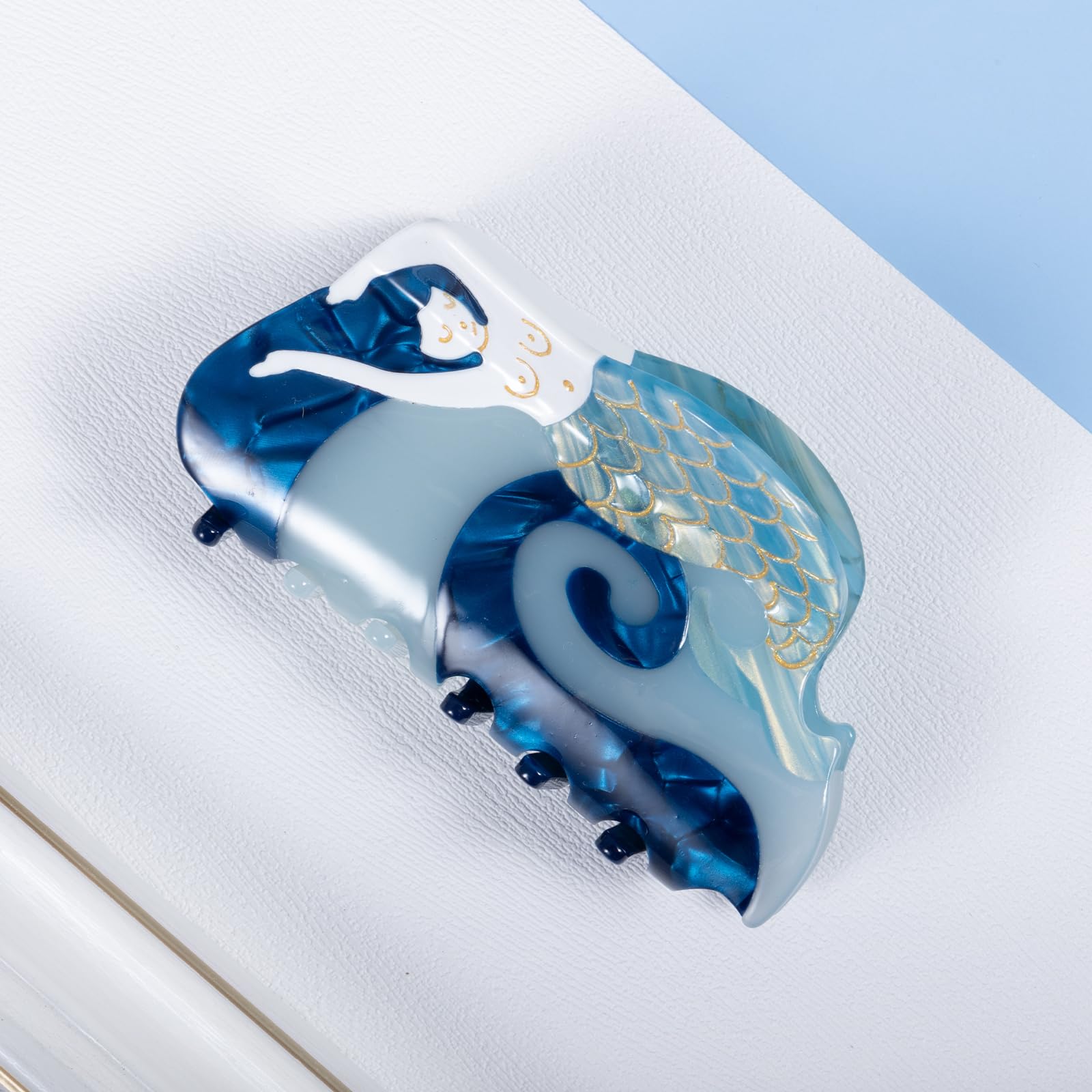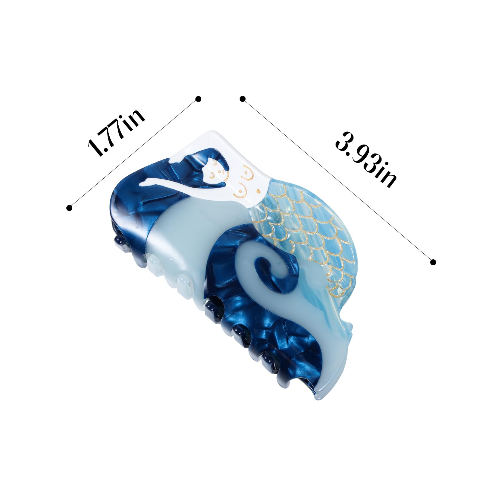 Mermaid Hair Claw Clip 3.74" For Women Girls Thin Fine Thick Curly Wavy Hair Styling Accessories, Large Non-Slip Metal Mermaid Strong Hold Hair Jaw Barrettes,Blue Acetate Big Fish Occean Hairpins, Cute Trendy Vintage Headwear, Retro Charm Mermaid Banana Clips,Birthday,Summer Beach Vacation,Christmas Holiday Gifts Vintage mermaid hair claws, styled with a new trendy look, are enough to catch the eye and will give your hair a lovely and stylish look. One size fits most hair types, strong hold both thick or thin hair,fine,curly, or straight hair. It is made from biodegradable acetate cellulose and high-quality alloys. Each piece is unique, due to the wonderful pattern of the material at large size 3.7x4x2.2 inch,strong hold hair claw can be used for both fine,thinner,thin,medium-thick,curly,wavy hair. Cute and vivid mermaid design,easy match almost your hair colors, summer mermaid outfits and hairstyles, making you charming and elegant.very pretty and dainty, definitely recommend them to anyone with thinner hair. Look exquisite and vivid, can add your hairstyle an extra elegance and delicacy, wearing it will make you look so charming and eye-catching, suitable for various occasions, such as dialy hair styling,shopping, partu, banquets, summer beach vacations and more. Mermaid print shaped hairpin claw clips are beautiful gifts for girls and ladies, your mom, wife, girlfriend, best friend on holidays like thanksgiving, Christmas, mother's day gift, valentine's day,mermaid theme birthday,graduation,summer beach vacation,holidays.