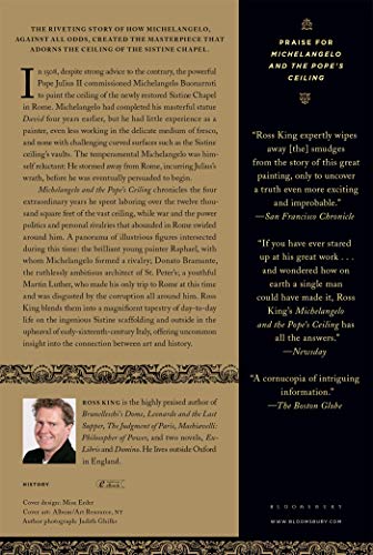 From the acclaimed author of Brunelleschi's Dome and Leonardo and the Last Supper, the riveting story of how Michelangelo, against all odds, created the masterpiece that has ever since adorned the ceiling of the Sistine Chapel. In 1508, despite strong advice to the contrary, the powerful Pope Julius II commissioned Michelangelo Buonarroti to paint the ceiling of the newly restored Sistine Chapel in Rome. Despite having completed his masterful statue David four years earlier, he had little experience as a painter, even less working in the delicate medium of fresco, and none with challenging curved surfaces such as the Sistine ceiling's vaults. The temperamental Michelangelo was himself reluctant: He stormed away from Rome, incurring Julius's wrath, before he was eventually persuaded to begin. Michelangelo and the Pope's Ceiling recounts the fascinating story of the four extraordinary years he spent laboring over the twelve thousand square feet of the vast ceiling, while war and the power politics and personal rivalries that abounded in Rome swirled around him. A panorama of illustrious figures intersected during this time-the brilliant young painter Raphael, with whom Michelangelo formed a rivalry; the fiery preacher Girolamo Savonarola and the great Dutch scholar Desiderius Erasmus; a youthful Martin Luther, who made his only trip to Rome at this time and was disgusted by the corruption all around him. Ross King blends these figures into a magnificent tapestry of day-to-day life on the ingenious Sistine scaffolding and outside in the upheaval of early-sixteenth-century Italy, while also offering uncommon insight into the connection between art and history.