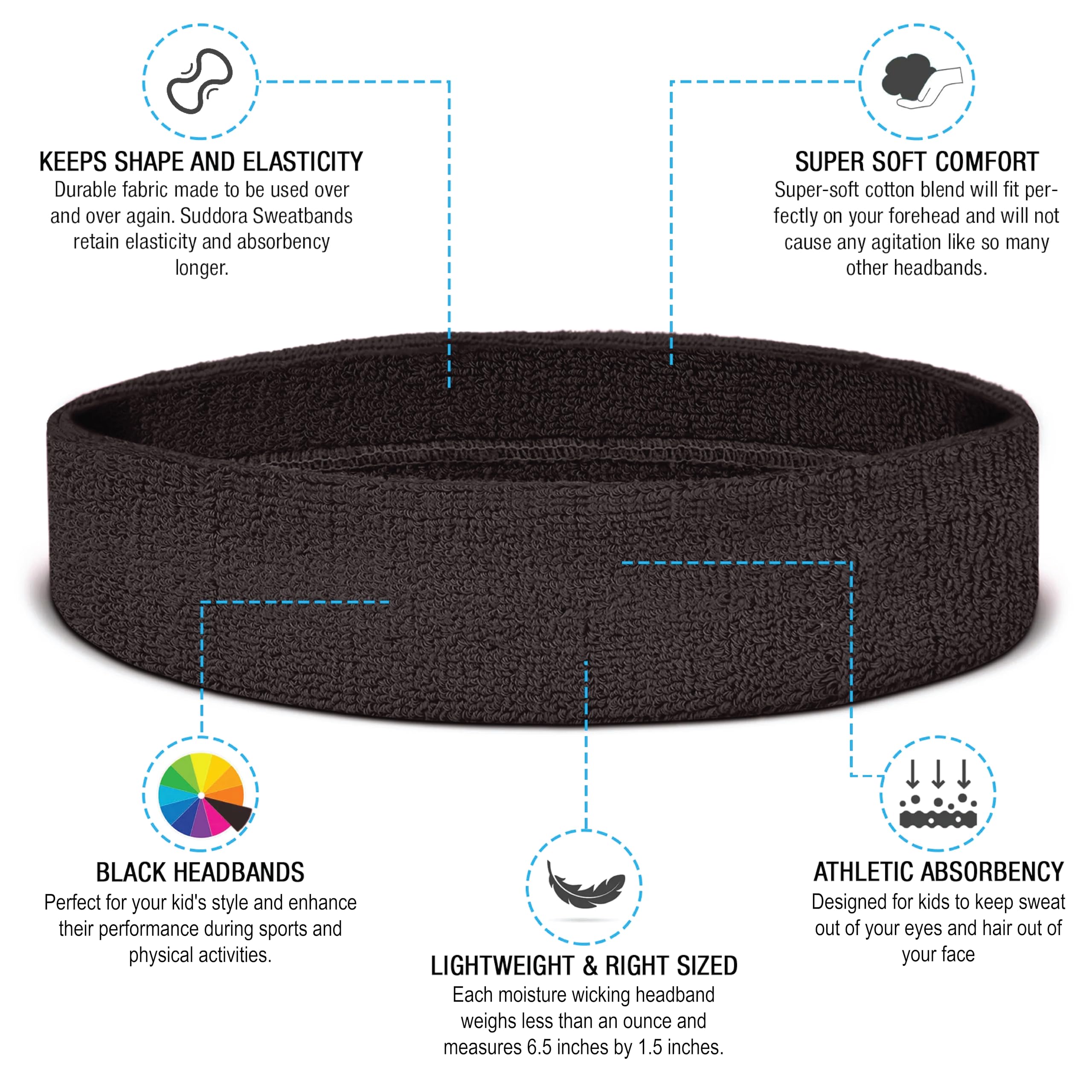 VERSATILE BANDS FOR A VARIETY OF USES: Our kids' headbands effectively keep hair off their faces and hands sweat-free, enabling them to maintain a solid grip on their racket, field hockey stick, bat, or ball. These head and wrist sweatbands are perfect for basketball, baseball, soccer, softball, and more. They also complement costumes and team uniforms splendidly.