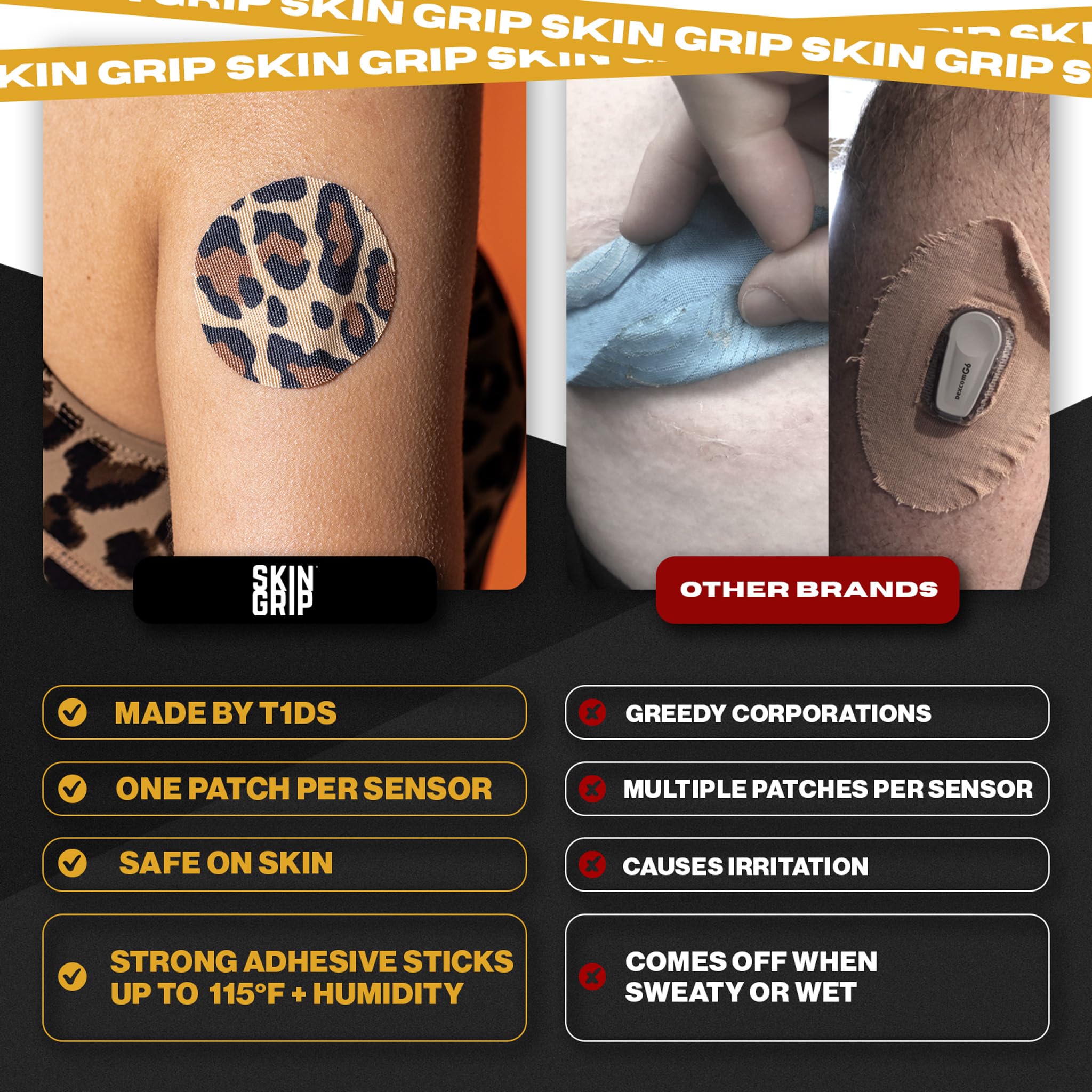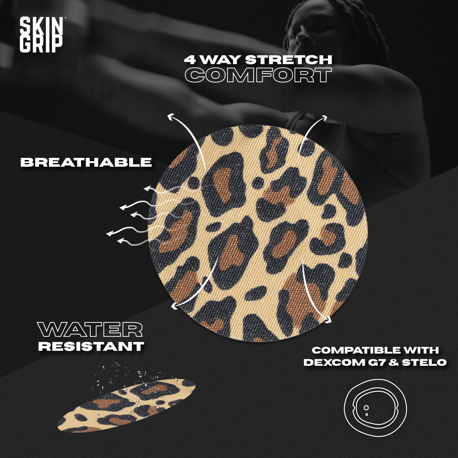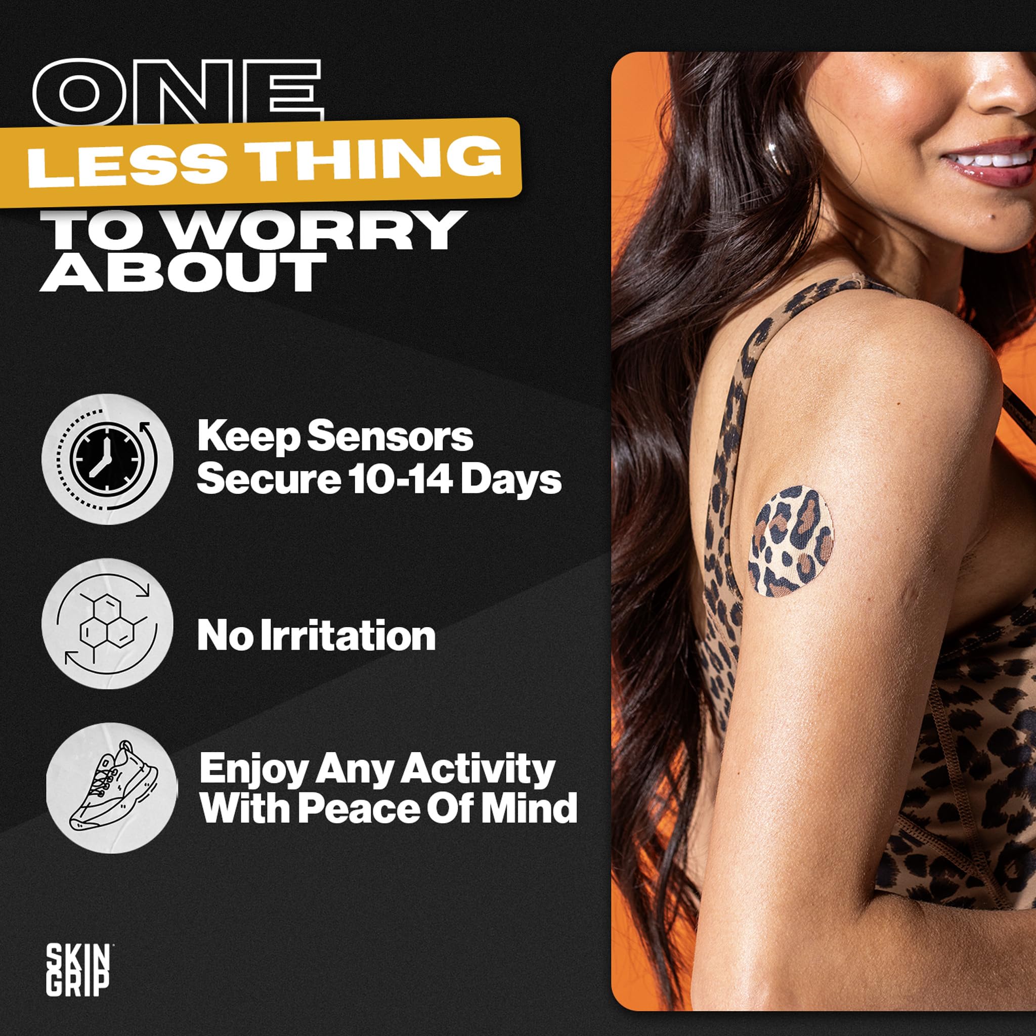 Individuals living with diabetes struggle to keep their glucose monitors inserted in their skin while living active lifestyles. Skin Grip makes strong adhesive tapes to keep monitors secured to the skin so that people with diabetes can participate in their favorite activities with peace of mind. Diabetes doesn't hold you back, and we believe that your CGM (continuous glucose monitor) shouldn't either. Skin Grip glucose monitor CGM adhesive patches hold your device firmly to your skin for 10 to 14 days. They work even while swimming, showering or exercising regularly. These premium diabetic overpatches are made from 100% medical-grade rayon that is latex-free, zinc oxide-free, and hypoallergenic. Equipped with quick-dry technology, the CGM sensor patches are both waterproof and sweatproof, keeping your sensor free from moisture damage. The soft patch is comfortable & breathable which makes it suitable for all skin types with zero irritation, itching or discomfort. our diabetic patch covers are produced in a high-quality facility. Skin Grip gives you the confidence to push the limits a little further because "diabetic" doesn't define you. We secure your sensors in the pool, shower, ocean, rain, through exercise, sweat, and all your other favorite activities because we believe that when individuals with diabetes feel fearless, they can accomplish the extraordinary.