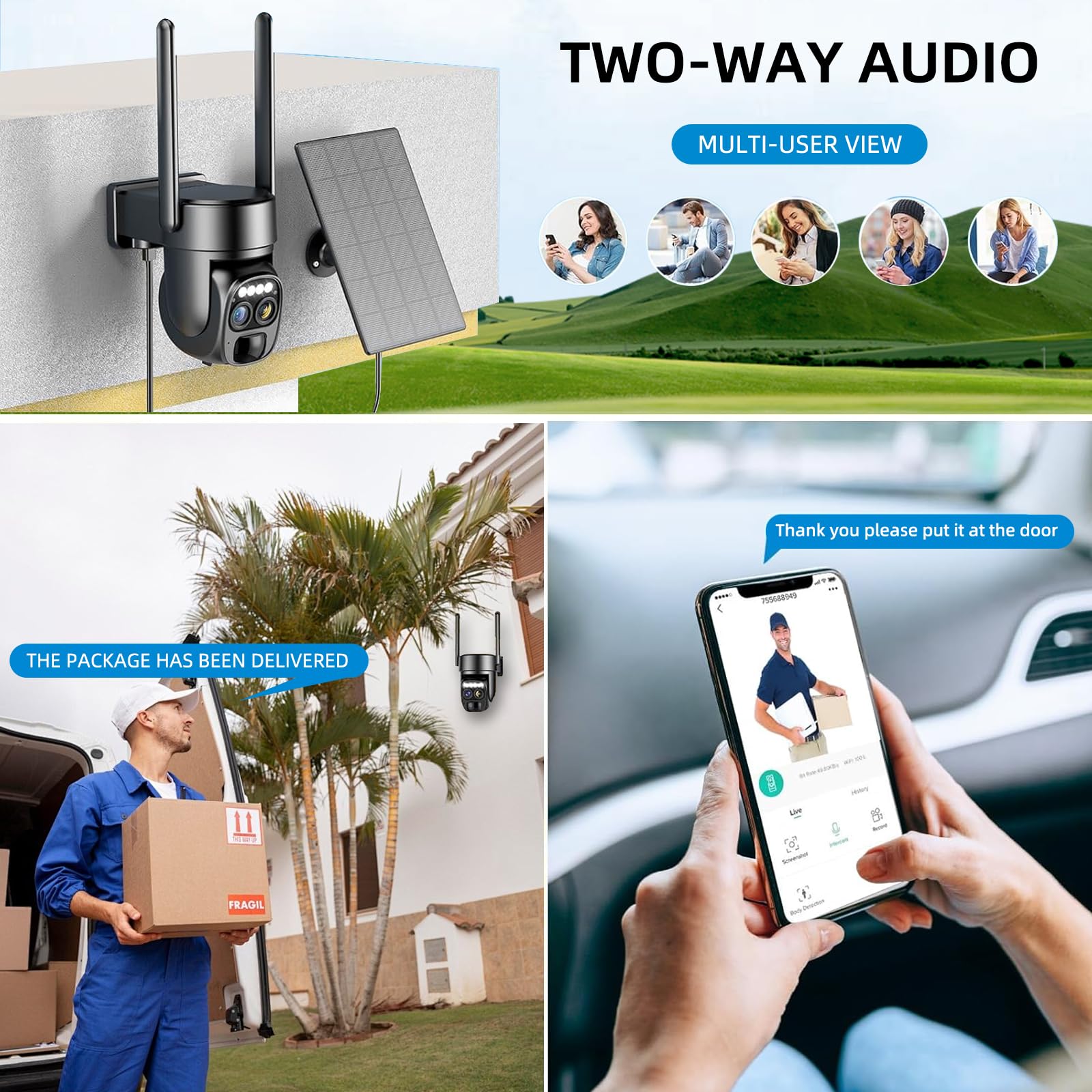 Wireless connectivity and solar power Please note: Be sure to place the solar panel in an east-west orientation or it may not stay charged. It supports 2.4GHz/5G dual-band WiFi connectivity and is continuously powered by a high-conversion solar panel. Equipped with a 10000mAh ultra-large capacity battery, it provides long-lasting power on every charge without worrying about weather changes.