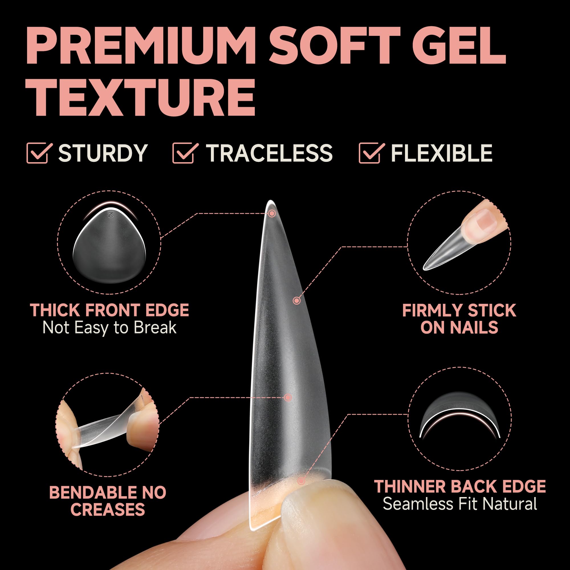 ULTRA NATURAL FIT: Our stiletto gel nail tips are made of high quality soft gel material, flexible, tracelss and comfortable. No matter how pinched, the false nail tips will quickly return to its original shape without leaving any creases. Upgraded with "thick front, ultra thin back" design, the front edge is break-resistant and better fit nails. Give you salon-level nail art enjoyment.