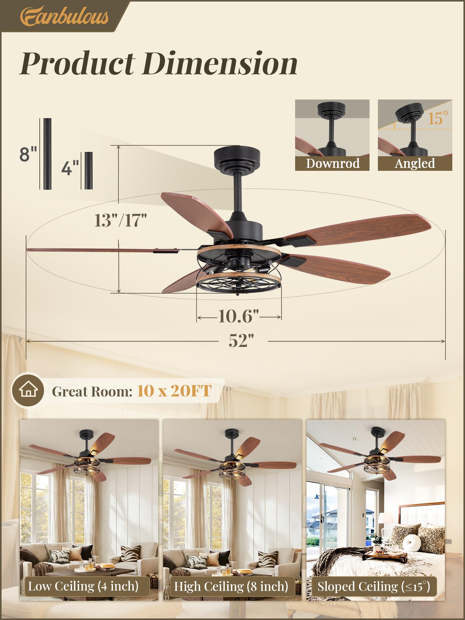 Multiple Installation Options: The living room ceiling fan comes with two down rods of different lengths (4 inches and 8 inches), which can adapt to various ceiling heights and can be installed on ceilings with inclinations up to 15°. In addition, we provide clear and concise installation instructions and accessories, which greatly improves installation efficiency. Rest assured, we are here to help you solve any problems every step of the way