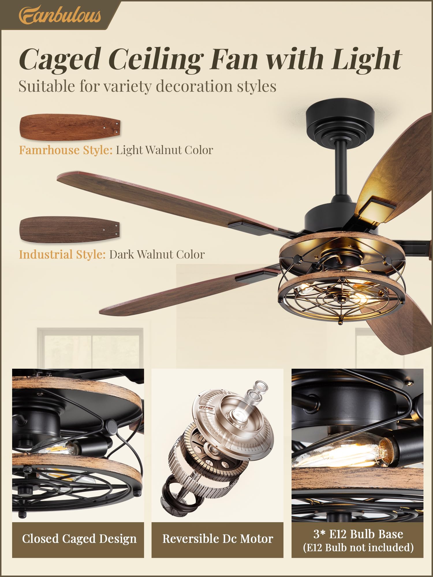Sleek & Modern Design: This 52 inch farmhouse ceiling fan with light seamlessly blends a classic 5-blade design with a decorative cage fixture. In addition, this rustic ceiling fan includes 3*E12 bulb bases, allowing you to customize your lighting choices (bulbs not included). The light effects of the closed hood allow you to create a unique farmhouse aesthetic while also enjoying an industrial rustic charm, making it ideal for a living room, bedroom, kitchen or outdoor covered patio
