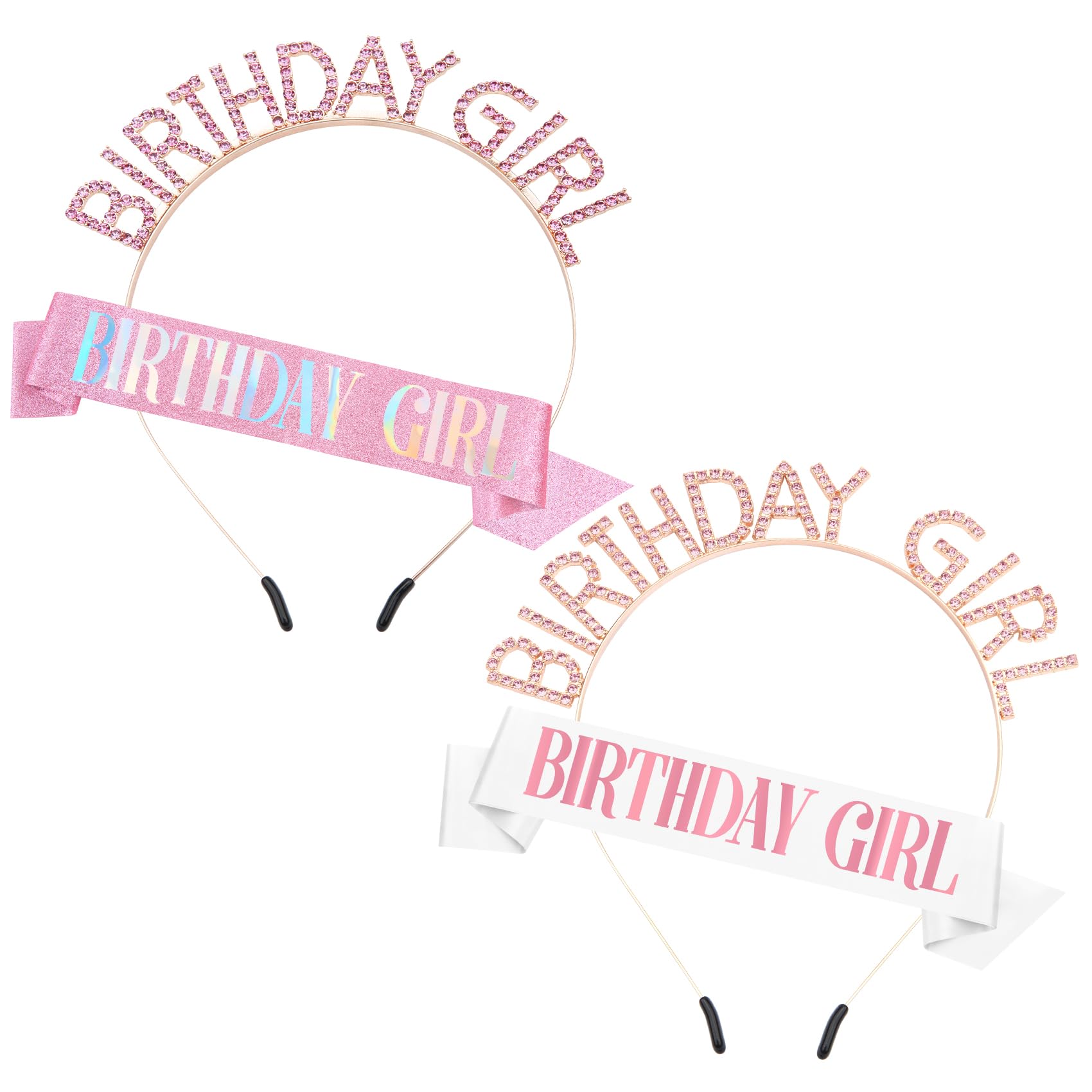 2Pcs Birthday Sash for Women White and Pink Birthday Girl Sash Birthday Sash and Tiara for Women Birthday Crowns for Women Happy Birthday Decorations Accessories Rhinestone Birthday Girl Headband