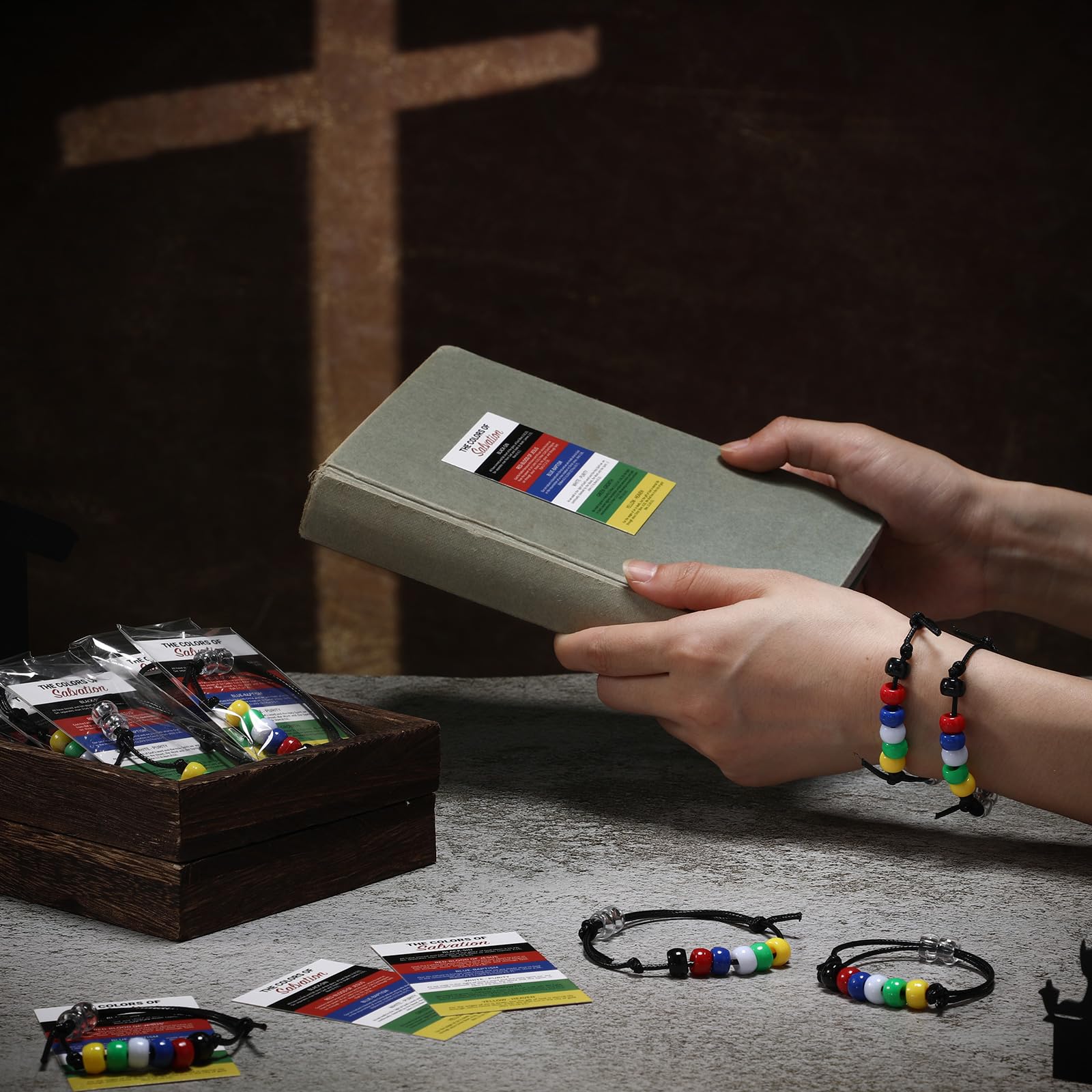 Plan of Salvation Bracelets Sets: the plan of salvation bracelets sets are comprehensive packages designed to meet your needs; It comes with 100 bracelets and 100 cards, with 100 bags for individual packing; This thoughtful inclusivity ensures that you have what you need for each teaching session or distribution event