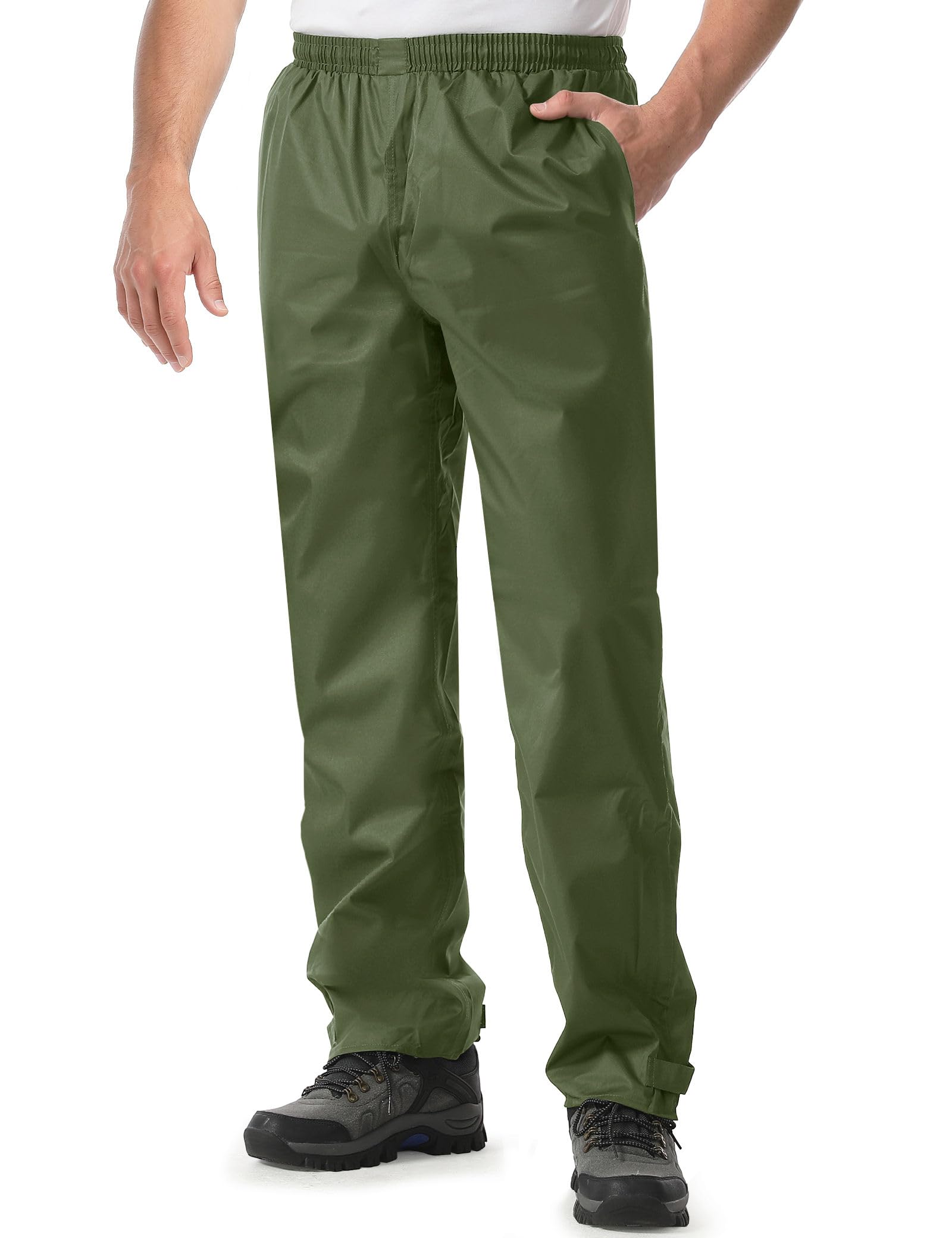 Comfortable Fit: The rain pants are designed with zipper openings on the legs to easily put on and take off boots and shoes. The hook and loop on the legs is adjustable. There's a soft mesh layer in the lining, comfortable and breathable