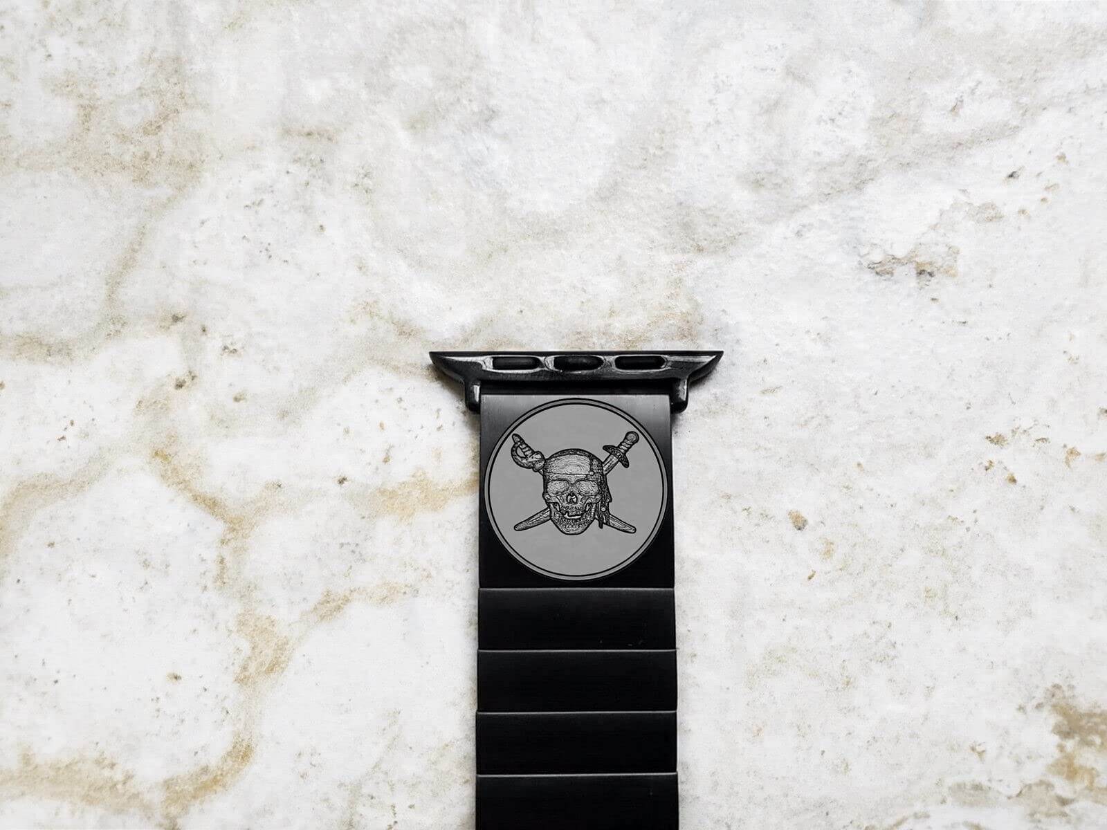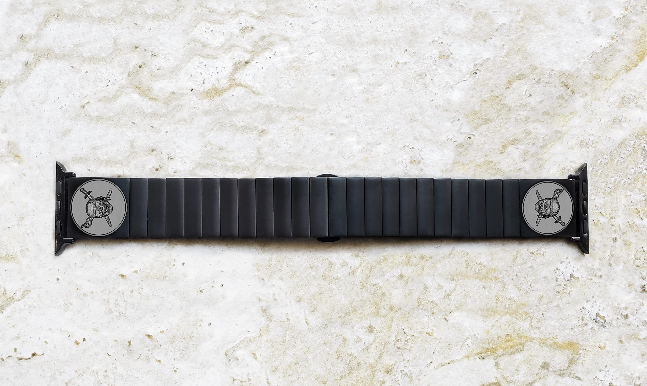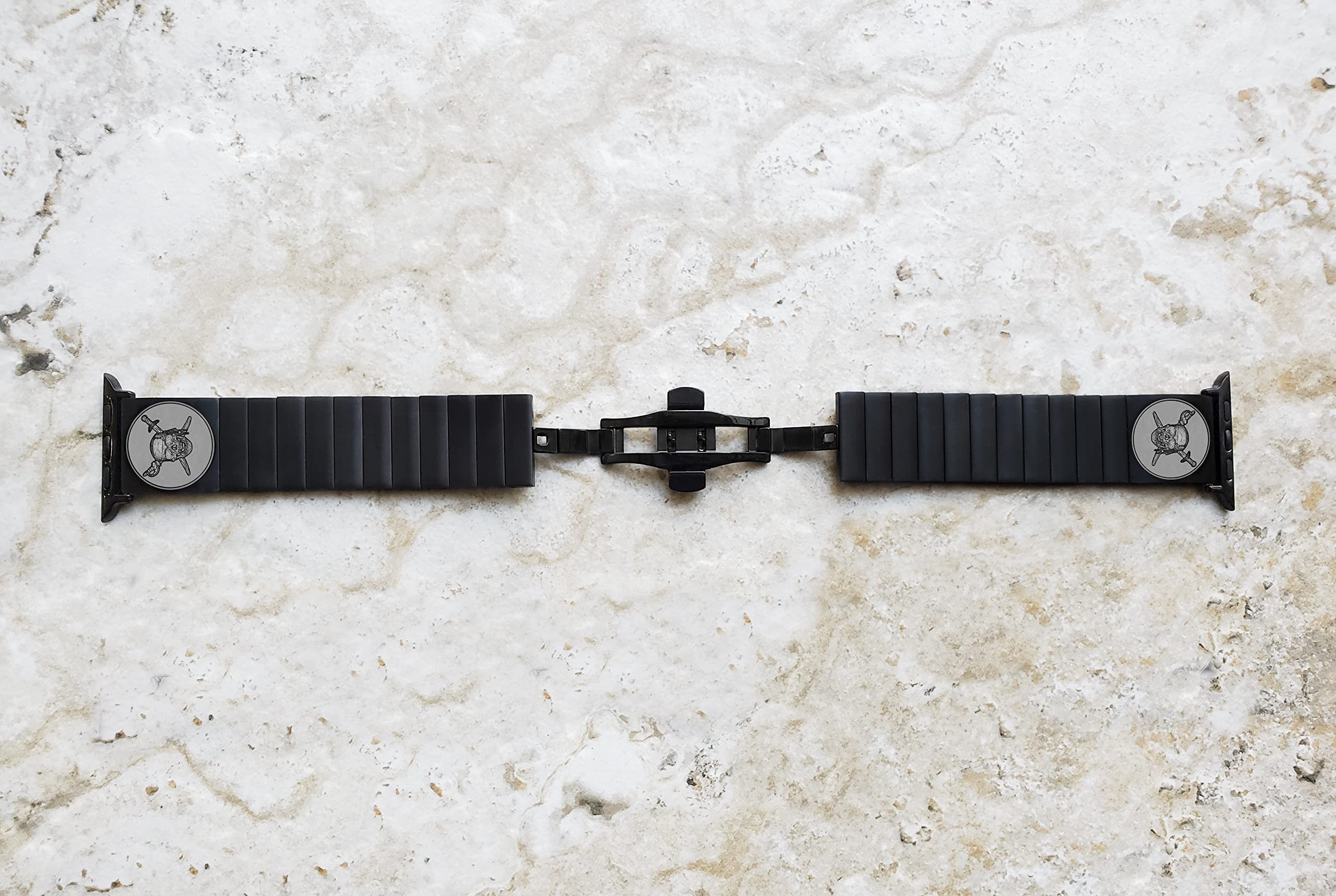 Description Product Description:<><> -Stainless Steel Watch Band - Watch is Not Included, Band Only! -Engraving is made with a special micro engraving-pen and different shaped diamond beads into the Metal Band. -Also a magnifying glass is used to create more detailed and precise work. Other Tools Used: Metal Compass, Caliper, Micro Chisels for Metal, Files, Drills - Micro and Normal Size, Cutting Discs, Polishing Beads. -Results are impressive and will stay forever on the watch band! -Add Style, Accent and Character with this modern accessory. -Crafted from Quality Materials. -Unique Design which transforms your Smart Watch into a Modern Accessory. -Enhances and completes your look, style, class and character. -Perfect Gift for every occasion. -Get Instant Fashion Gratification with this Black Color Stainless Steel Adjustable Bracelet Watch Band. -This Trendy, Bracelet Watch Band piece feature an Engraved Motif on Black Stainless Steel, Butterfly Clasp, and Quick Release Adapters Black Stainless Steel for a rocking look. -Enjoy fresh new looks with your accessories and let time go by in style!<><> Dimensions and Materials:<><> -All Stainless Steel. -Bracelet Watch Band / 22mm - Black Stainless Steel. -1x Butterfly Clasp / 25mm x 40mm/70mm (with Double Lock Buttons) - Black Stainless Steel. -2x Attachment / Connectors (Quick Release Adapters) - Black Stainless Steel. -3.0oz (85 grams) - For Wrist Size 7" Inches Example.