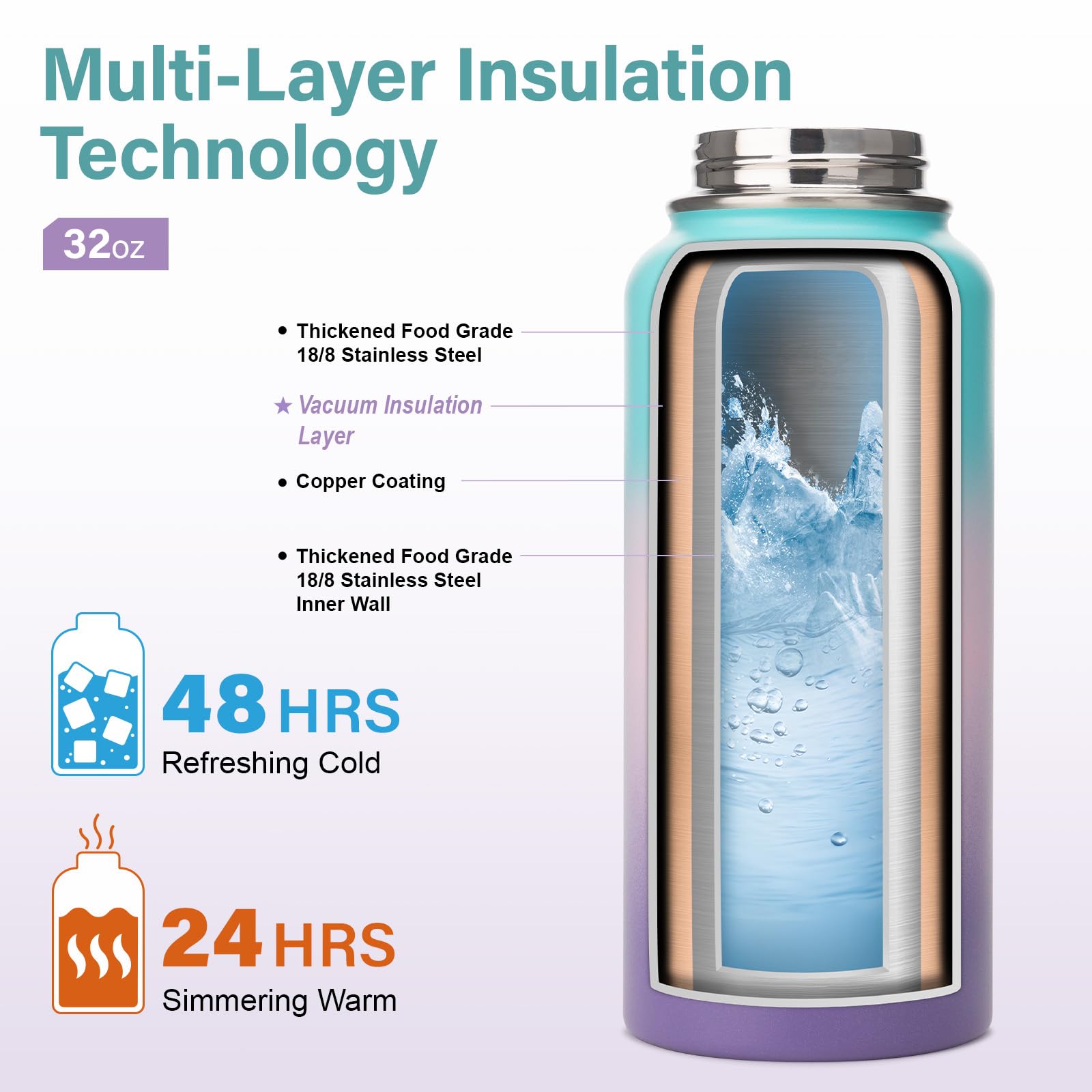 THE MULTI-LAYER INSULATION TECHNOLOGY FEATURES: the first layer is a thick food-grade 18/8 stainless steel inner wall; the second layer has a copper plating that reduces heat transfer; the third layer is a vacuum layer that prevents heat loss. As a result, you can enjoy an insulated water bottle that keeps beverages cold for up to 48 hours and hot for up to 24 hours, making it perfect for any adventure, whether it's a long hike or a busy workday.