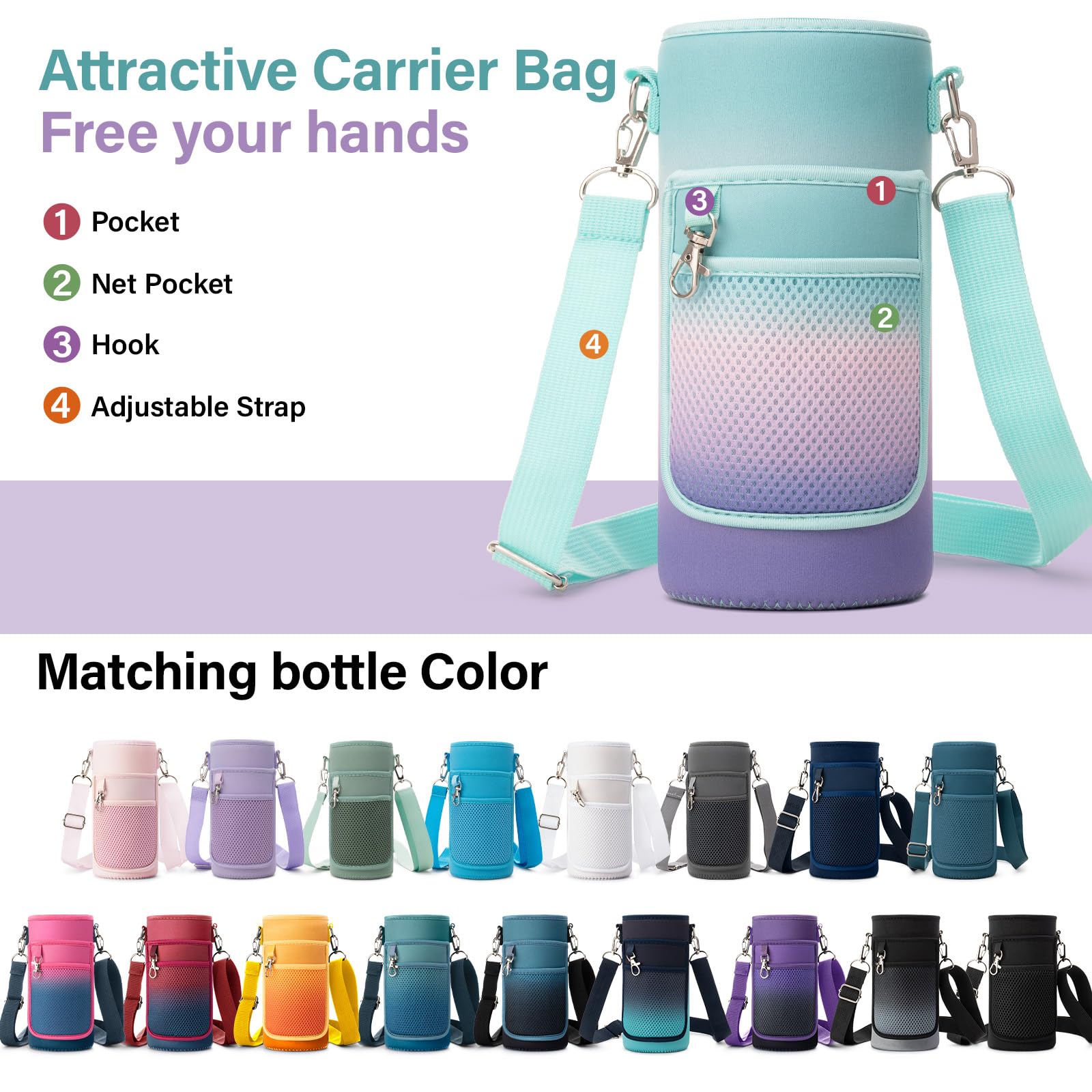 VERSATILE AND STYLISH CARRIER BAG:The colorful water bottle carrier bag is designed to match the bottle's body, adding a touch of flair while providing practical functionality. The shoulder strap and carabiner make it easy to carry and hang, whether you're out on a hike or running errands. Plus, the small storage bag for your phone and a hook for keys make this bottle even more versatile.