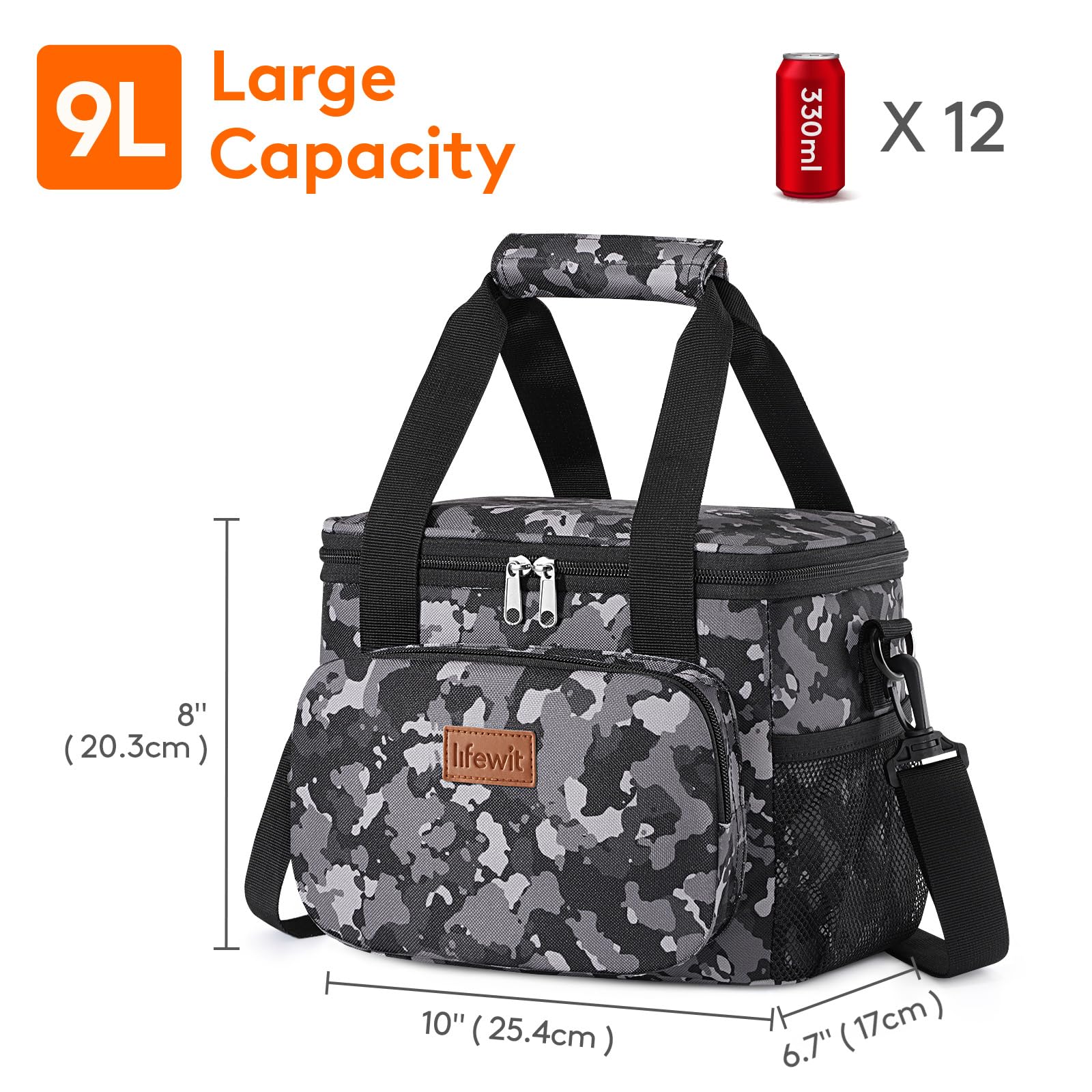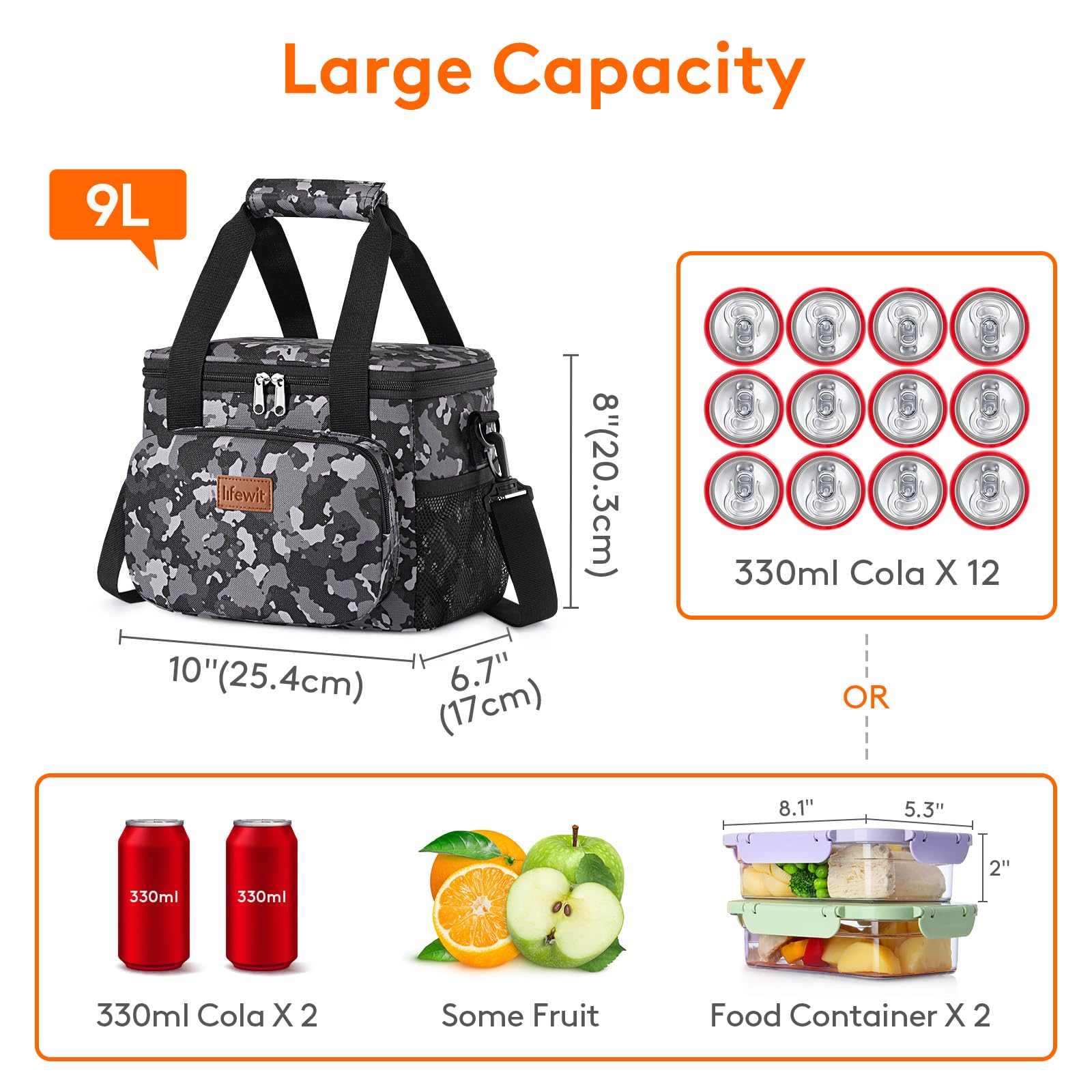 Large Capacity: Dimensions - 10" ( 25.4cm ) × 6.7" ( 17cm ) × 8" ( 20.3cm ). The maximum capacity of lunchbox for adults is 9L, and is spacious enough to store 12 cans of coke (330ml), or your lunch such as sandwiches, salad, snacks, drinks and fruits and so on. It is suitable for office, for work, picnic, beach, trip.