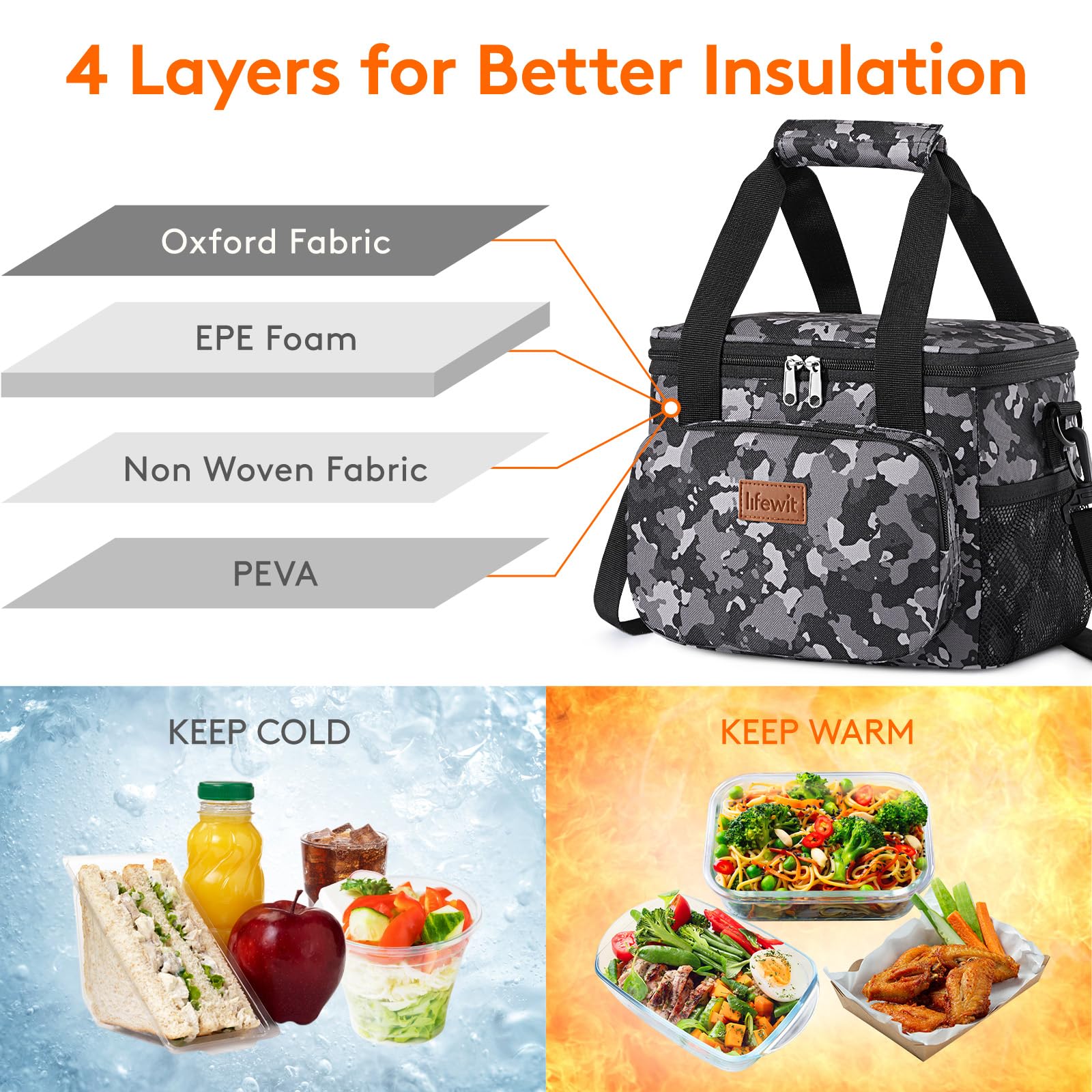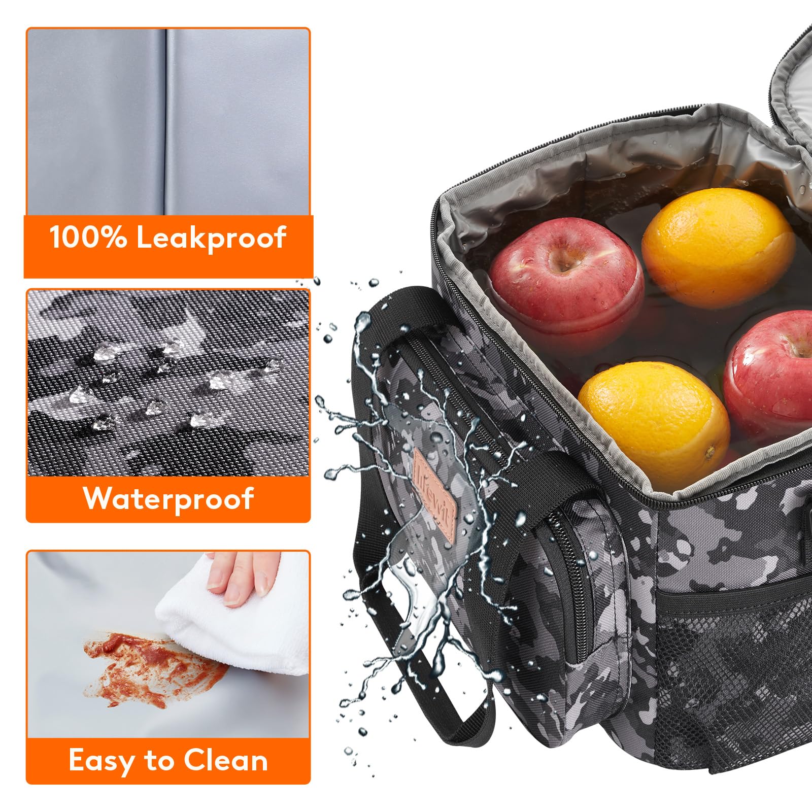 Leakproof & Waterproof: The exterior of lunch box for men is constructed out of 600D water-resistant dirt-proof Oxford fabric for durability and water proofing and easy cleaning. Even when full with water and ice, it holds fruits and drinks well, will not leak at all.