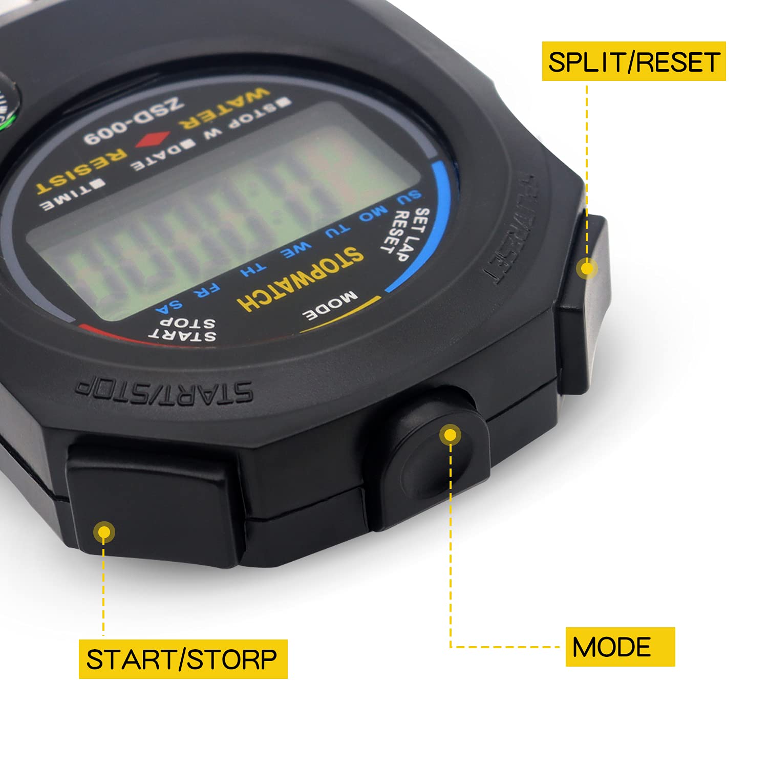 1/100 Second Split Timing, Measure time at an accuracy of one hundredth of a second. Use the split time feature to precisely measure multiple events.