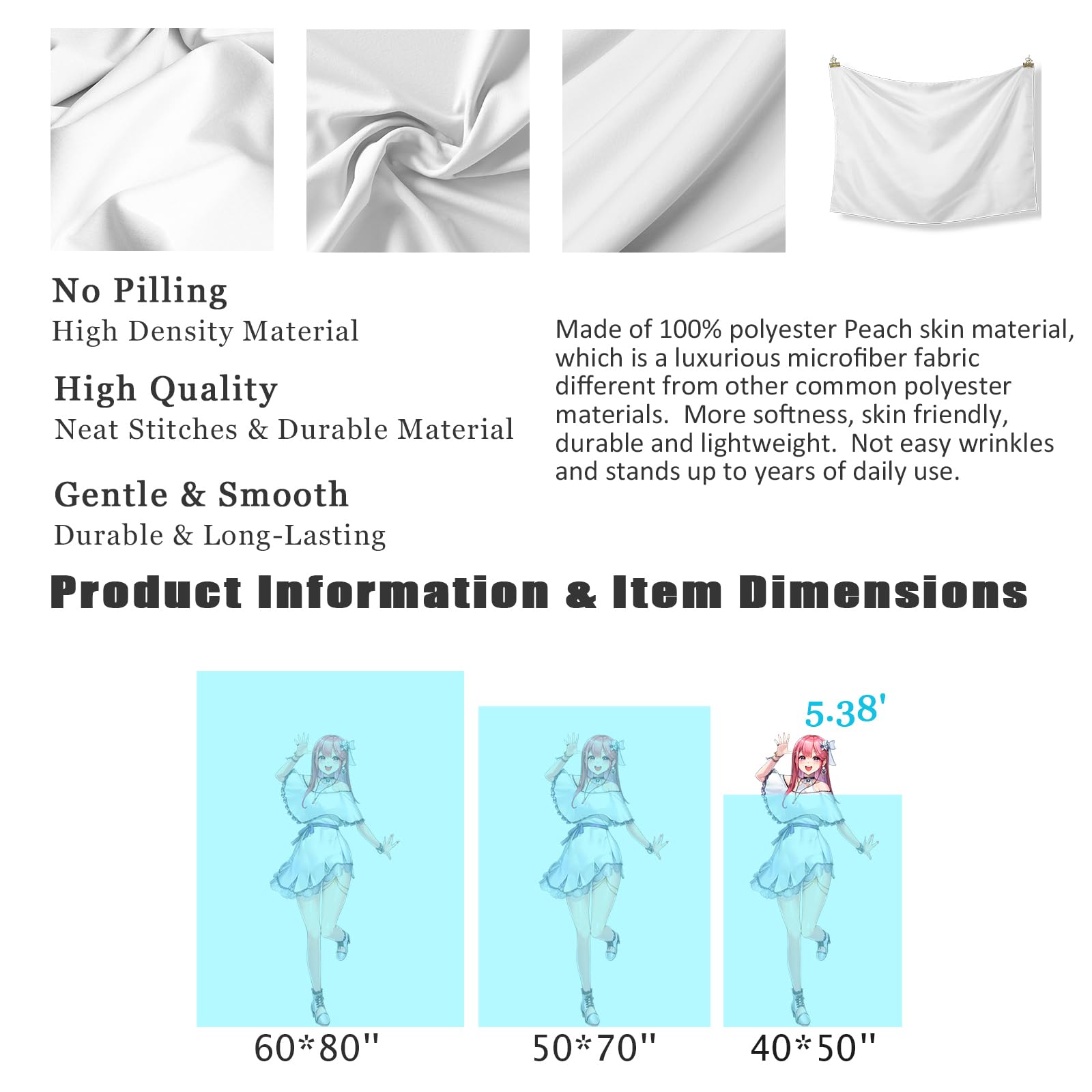 The thickened tapestries made of Peach Skin Fabric/Short Pile Fabric (180 GSM) material, which is a luxurious microfiber fabric different from other common polyester materials. More softness, skin friendly, durable and lightweight. Not easy wrinkles and stands up to years of daily use.
