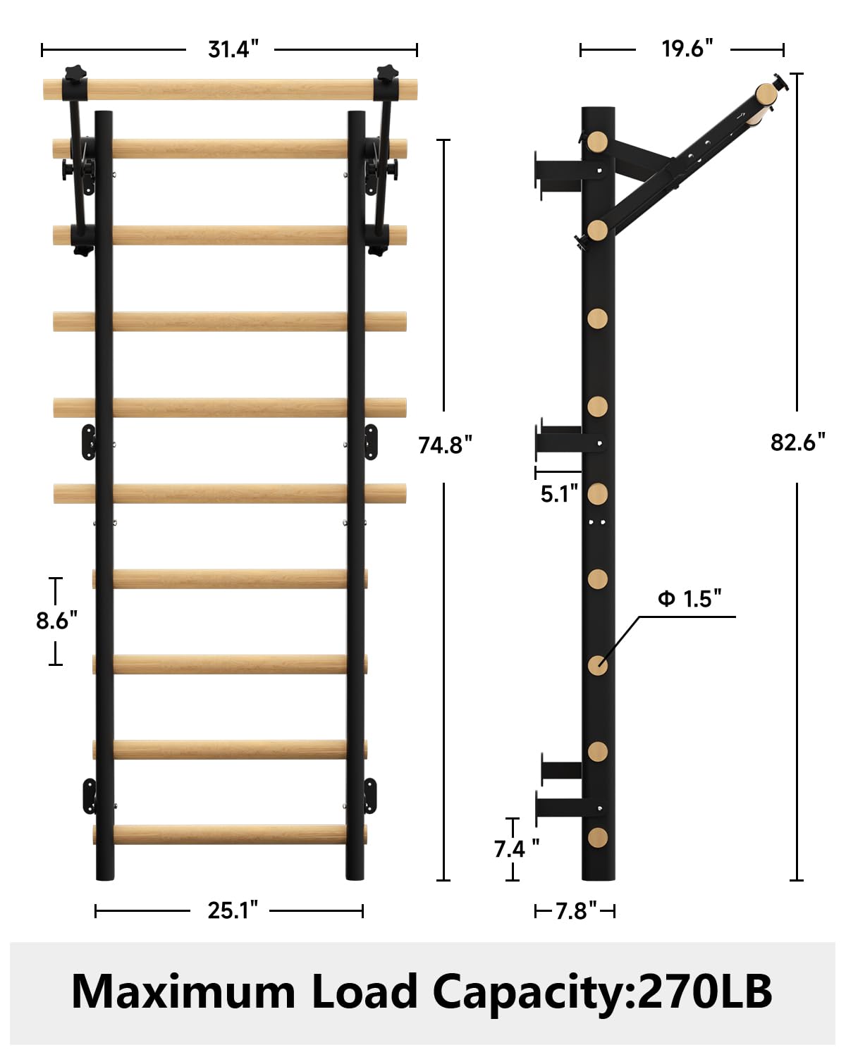 Heavy-Duty Pine Frame: Built from premium-grade solid pine, this stall bar combines clean aesthetics with serious durability. This Swedish ladder features 9 solid wood grips, ranging from a lowest rung of 5.1’’ to a highest rung of 74.8’’. The smooth, splinter-free grips are easy on the hands, even during extended use. With a tested load capacity of 270 lbs, it supports rigorous body-weight training and stretching routines with confidence—perfect for athletes, and home gym users seeking both form and function