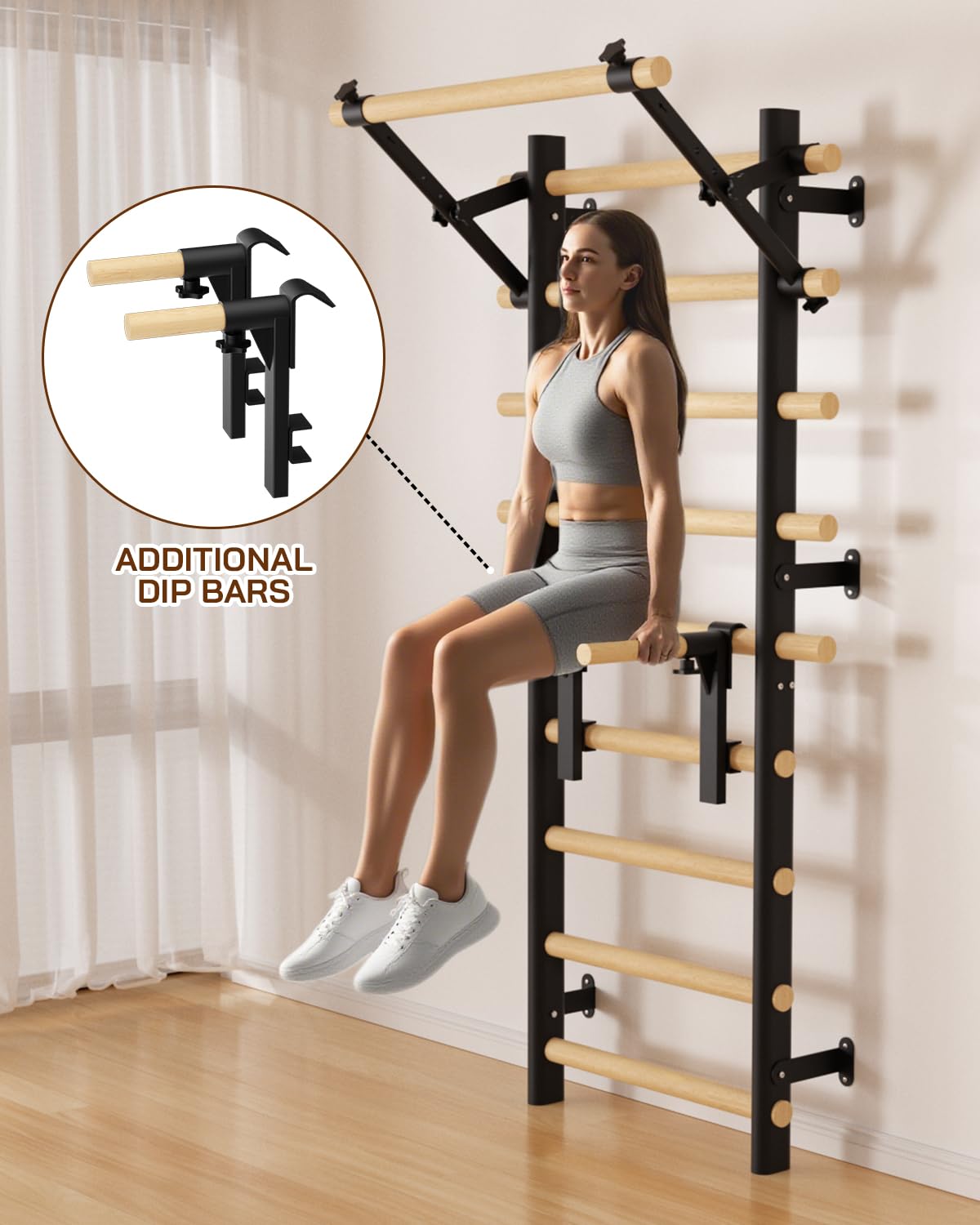 Dip Bars & Exercise Straps for Full-Body Training: Expand your training capabilities with the included dip bars and straps. The removable dip bars attach securely at any rung height and support compound upper body exercises like dips, L-sits, and leg raises. The exercise straps enable body-weight workouts including rows, push-ups, and core training. Together, these accessories turn your wall-mounted ladder into a complete, floor-free functional training station—ideal for building strength, stability, and muscular endurance at home