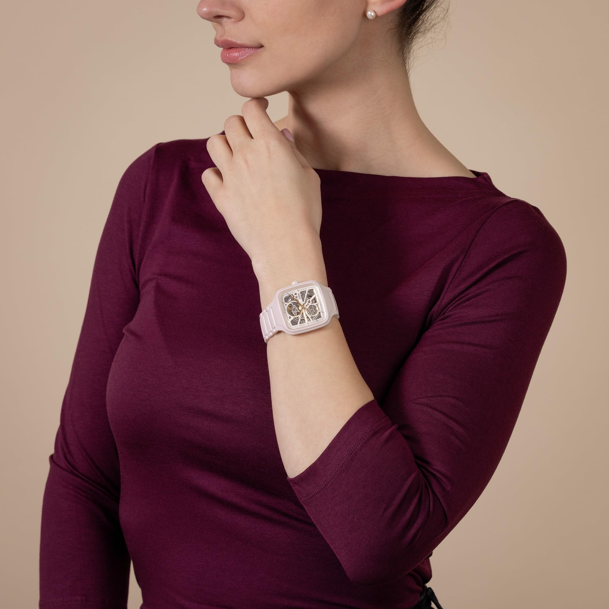 Description Experience the perfect fusion of artistry and precision with the Rado True Square Automatic Open Heart watch. This remarkable timepiece showcases a captivating open-heart design, allowing you to admire the intricate movements of the automatic Rado calibre R734, with its 80-hour power reserve. With a 38 mm case size, the pink high-tech ceramic case and crown exude a sleek and contemporary allure. The flat sapphire crystal, with anti-reflective coating on both sides, offers exceptional clarity. The pink dial is accentuated by gold-coloured bevels. The rose gold-coloured hands, enhanced with white veneer and white Super-LumiNova®, ensure excellent visibility, while adding a subtle touch of elegance. Completing the ensemble is the polished pink high-tech ceramic bracelet, offering both comfort and durability.