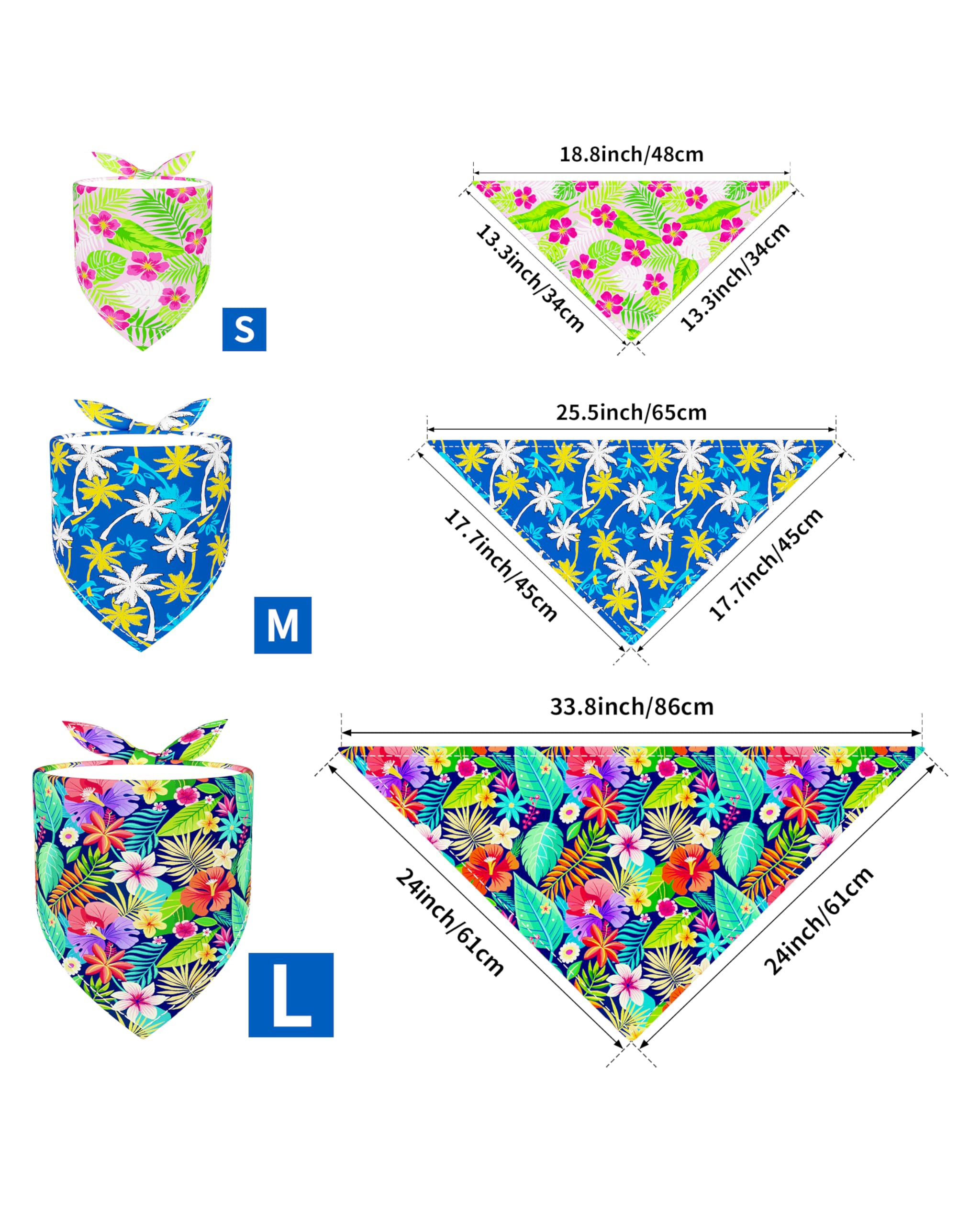 Cute gift:You can gift these Hawaii dog bandanas different sizes on various occasions to your family, friends, relatives, colleagues and neighbors who have pets, to express your love and care. They will be delighted to receive such cute and functional pet accessories. Material: polyester, light weight and soft. Color: as shown in pictures. Size: S: approx. 18.9x13.4x13.4 inch; M: approx. 25.6x17.7x17.7 inch; L: approx. 33.8x24x24 inch. Package includes: 50 x Hawaii Dog Bandanas Bulk. Notes:1. Manual measurement, please allow slight errors on size. 2. The color may exist a slight difference due to different screen displays.