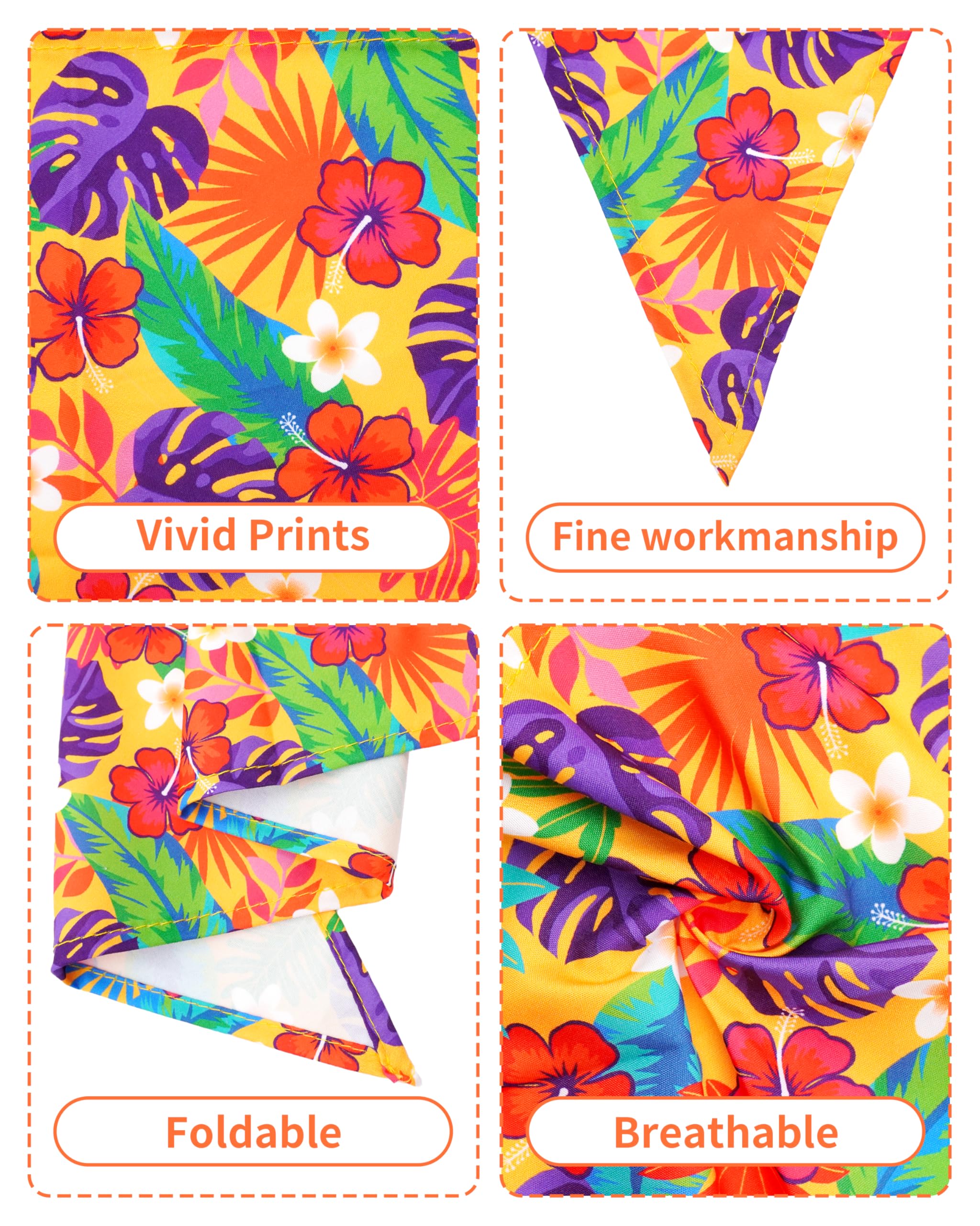 Hawaii Design: The dog bandanas feature classic Hawaii elements such as fusarium flowers, coconut trees, pineapple, turtle shell leaves, sheeptooth grass etc, tropical plants etc, adding a warm festive touch to your pet's outfit. Whether at summer gatherings or themed parties, your puppy will surely become the center of attention
