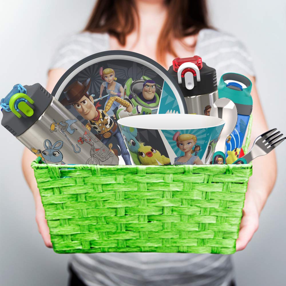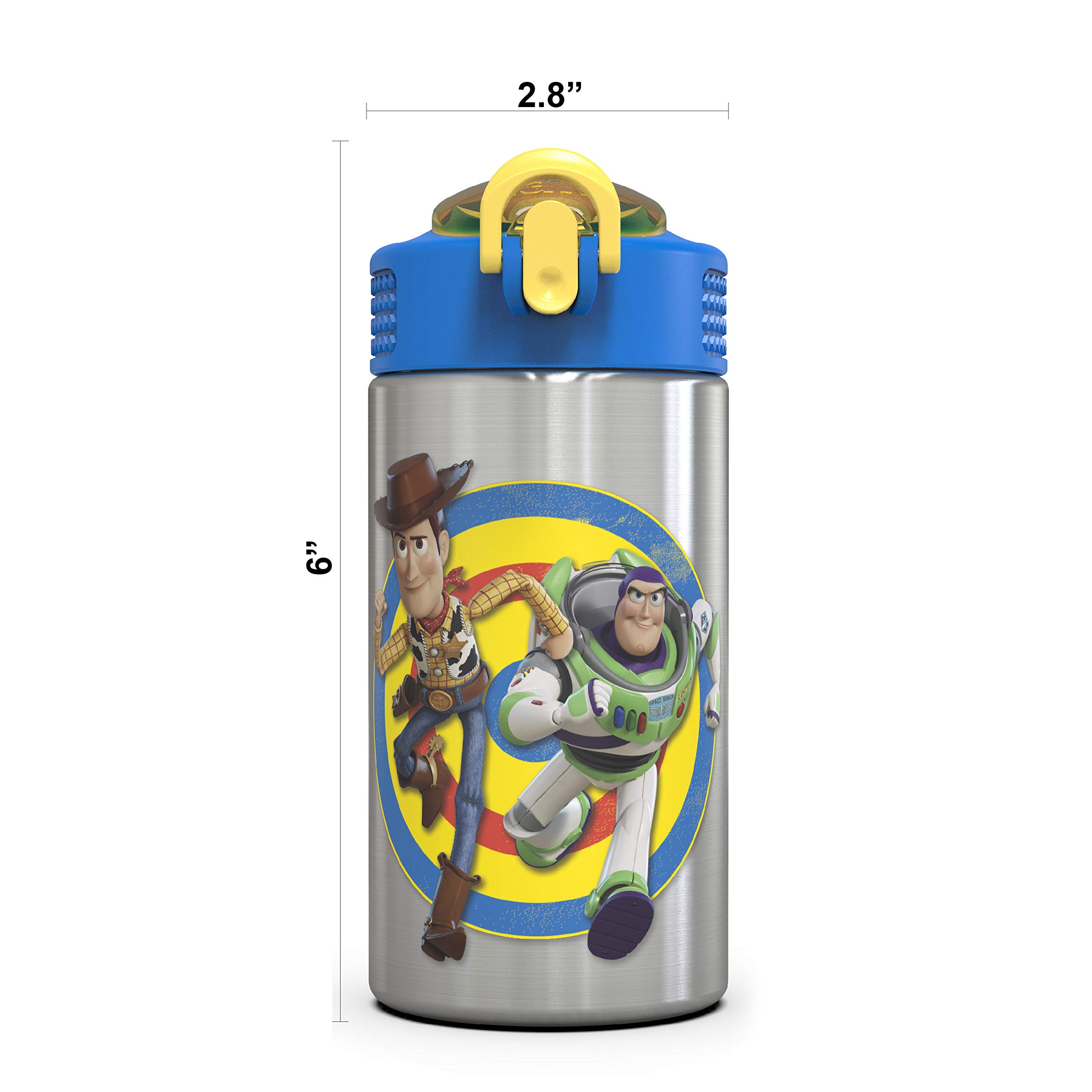 The reusable Palouse water bottle from Zak Designs makes hydration fun for any Toy Story 4 fan! Durable Stainless Steel The 15.5-ounce water bottle is made from single-wall, 18/8 stainless steel, which is food grade quality as well as durable and break-resistant. Hygienic Spout Cover & Action Lid The screw-on lid has a silicone spout with a cover to keep it clean, and a flip-up lock to make sure the cover stays closed. The lid is leakproof when the spout cover is closed and locked, but can be easily opened one-handed with the push of a button. On the Go The carrying loop built into the lid makes the bottle easy to carry, and you can put it in a bag or backpack without worrying about spills. The bottle also fits in most car cup holders. Spec. 15.5 oz capacity. Made of durable 18/8 stainless steel. Hand washing recommended, do not microwave. Length: 4.3-inch, Width: 2.8-inch, Height: 6-inch. Character: Sheriff Woody and Buzz Lightyear (Disney and Pixar's Toy Story 4).