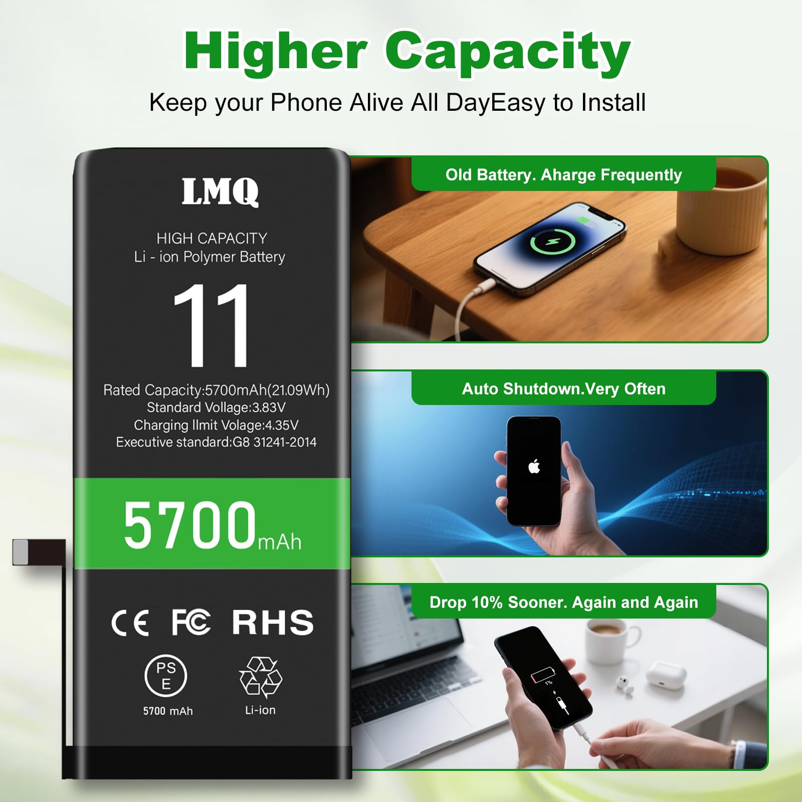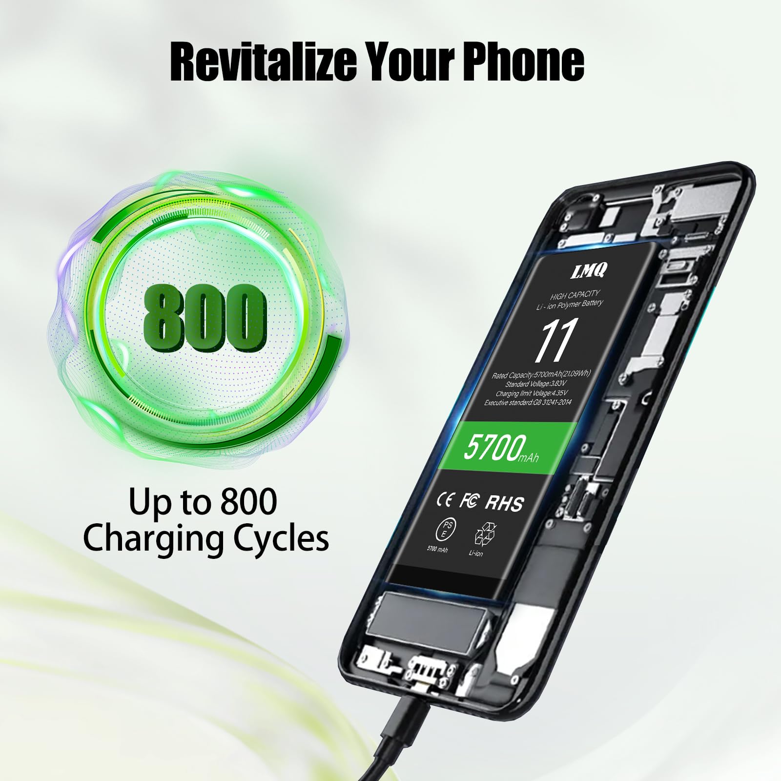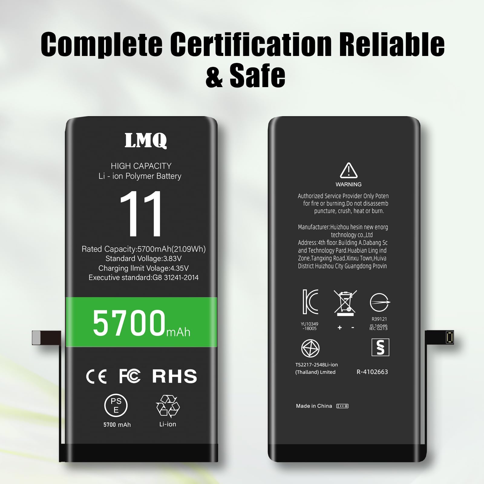 【Safe and Quality】LMQ 11 Replacement Battery is made of A+ grade high quality batteries. Built-in smart chip to prevent over charging, over discharging and overheating protection, short circuit protection, high safety performance, long service life.Meanwhile, the iPhone 11 batteries are tested by third party security, such as FCC, CE, ISO9001/14001 and ROHS Certificated. You can buy it with confidence.