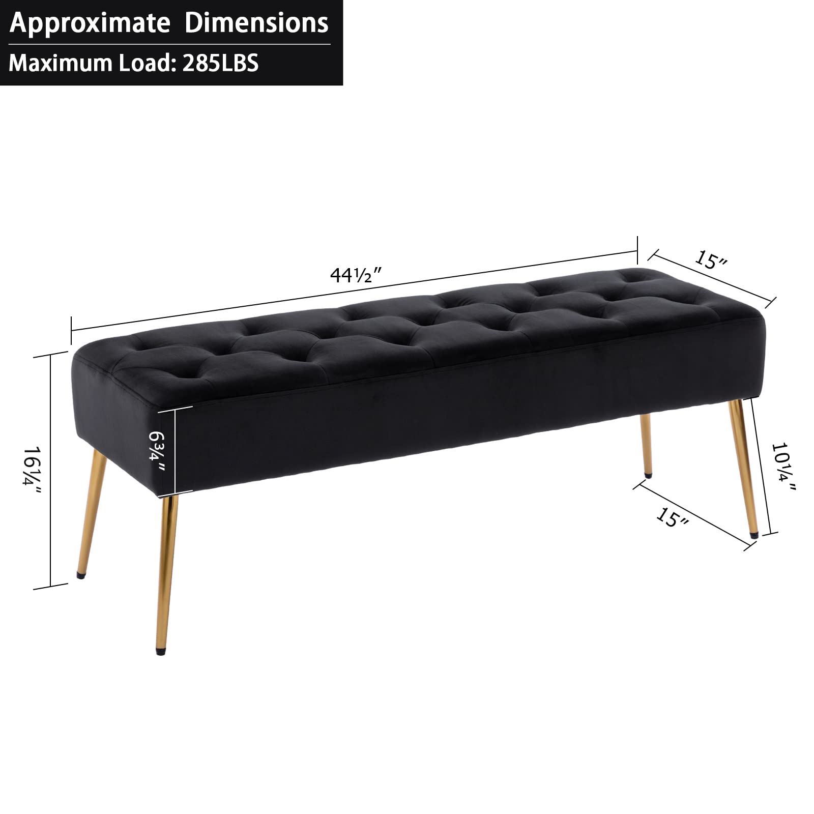 Dimension and Assemble: Seat height: 16.9", Seat Length x Width: 44.5" x 15", Seat thickness: 6.7"; Maximum weight capacity: 285 LBS. Easy Assemble the ottoman bench with a simple tool