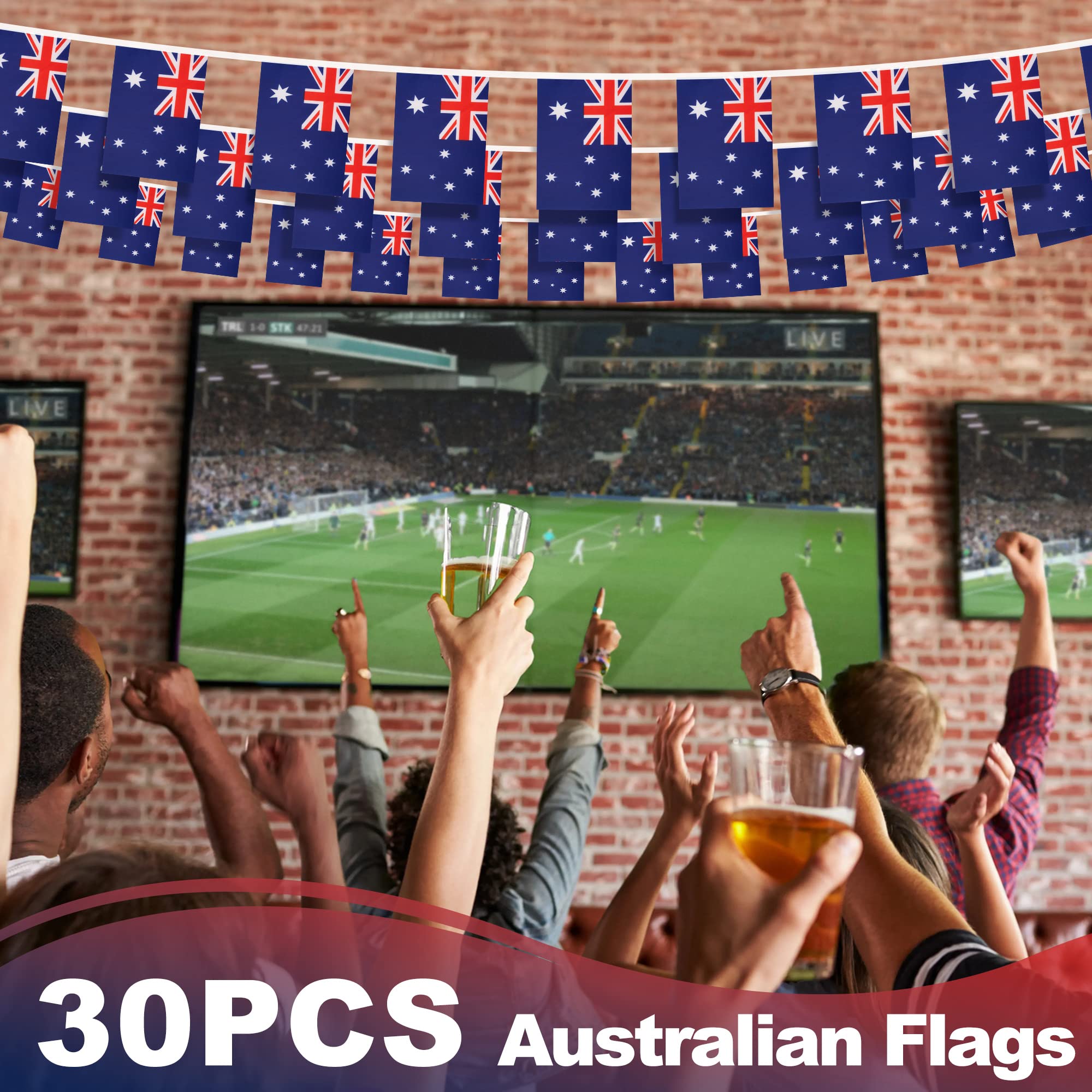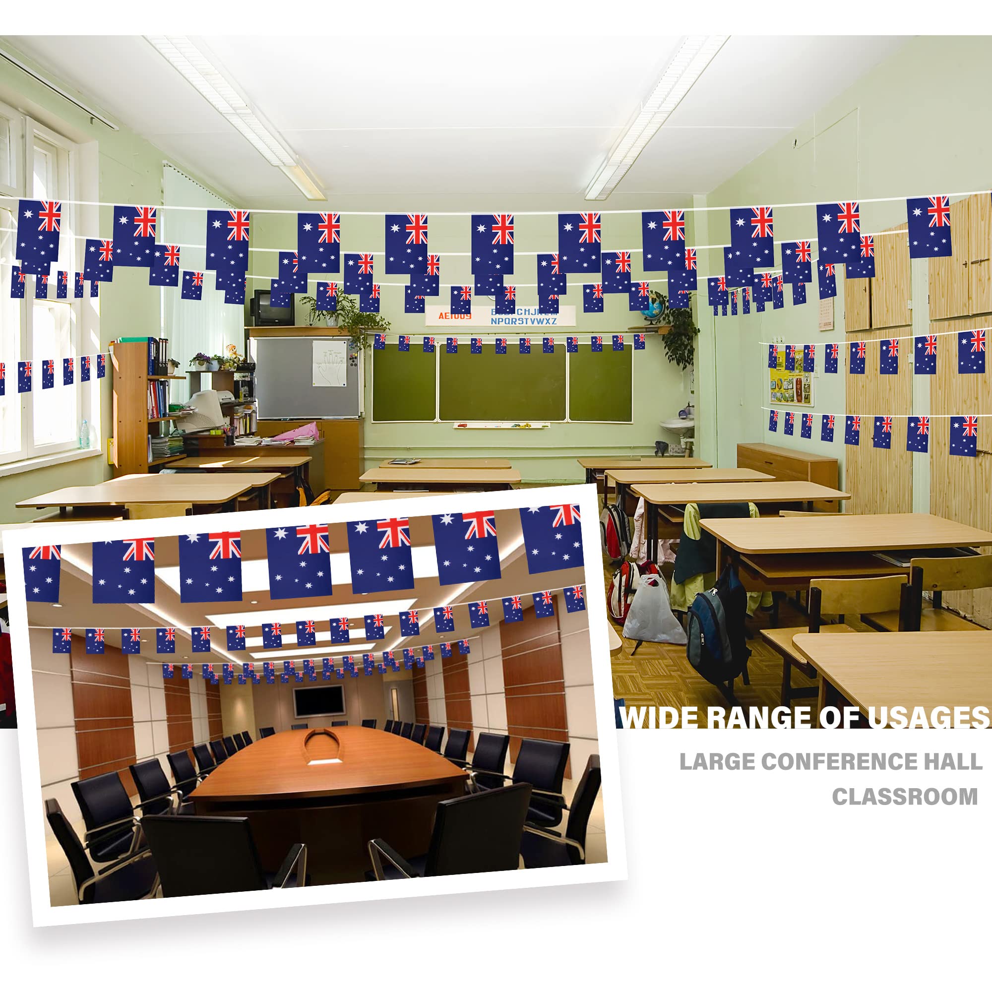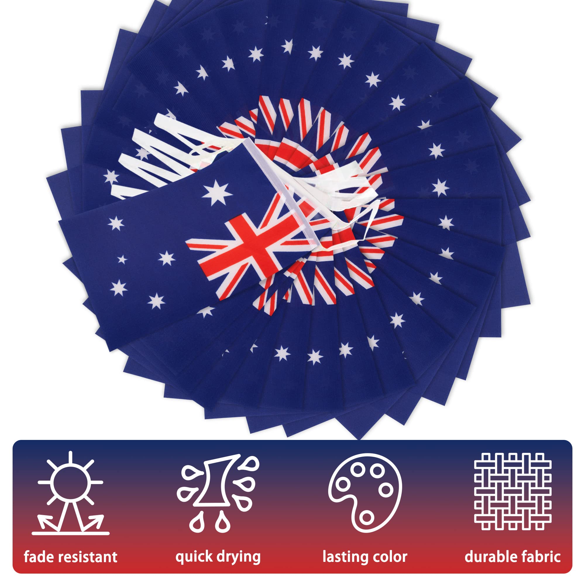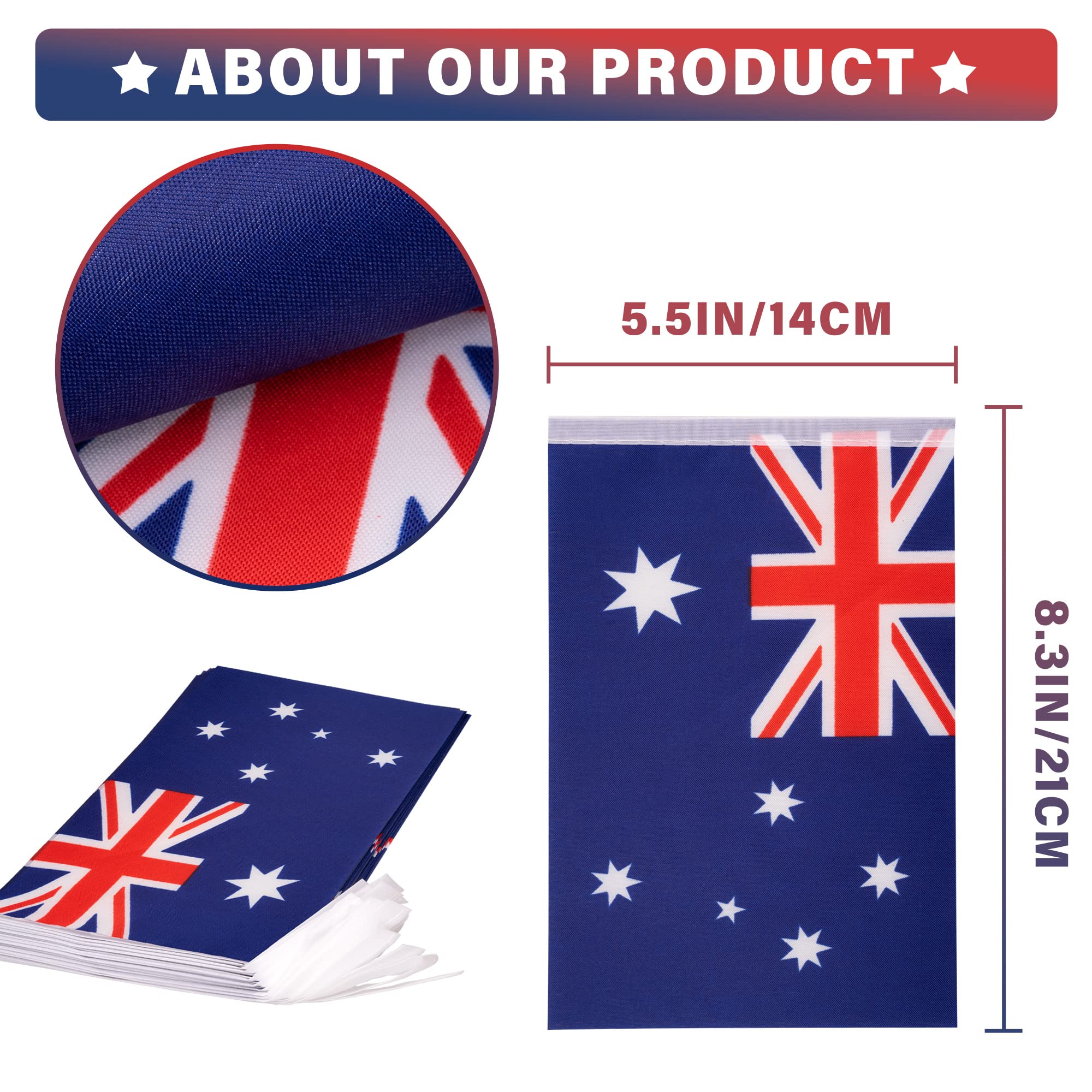 【Specifications】Each string is approximately 33 feet long. Includes 30 pcs Australian flags. Each flag is approximately 5.5 in wide and 8.2 in long.