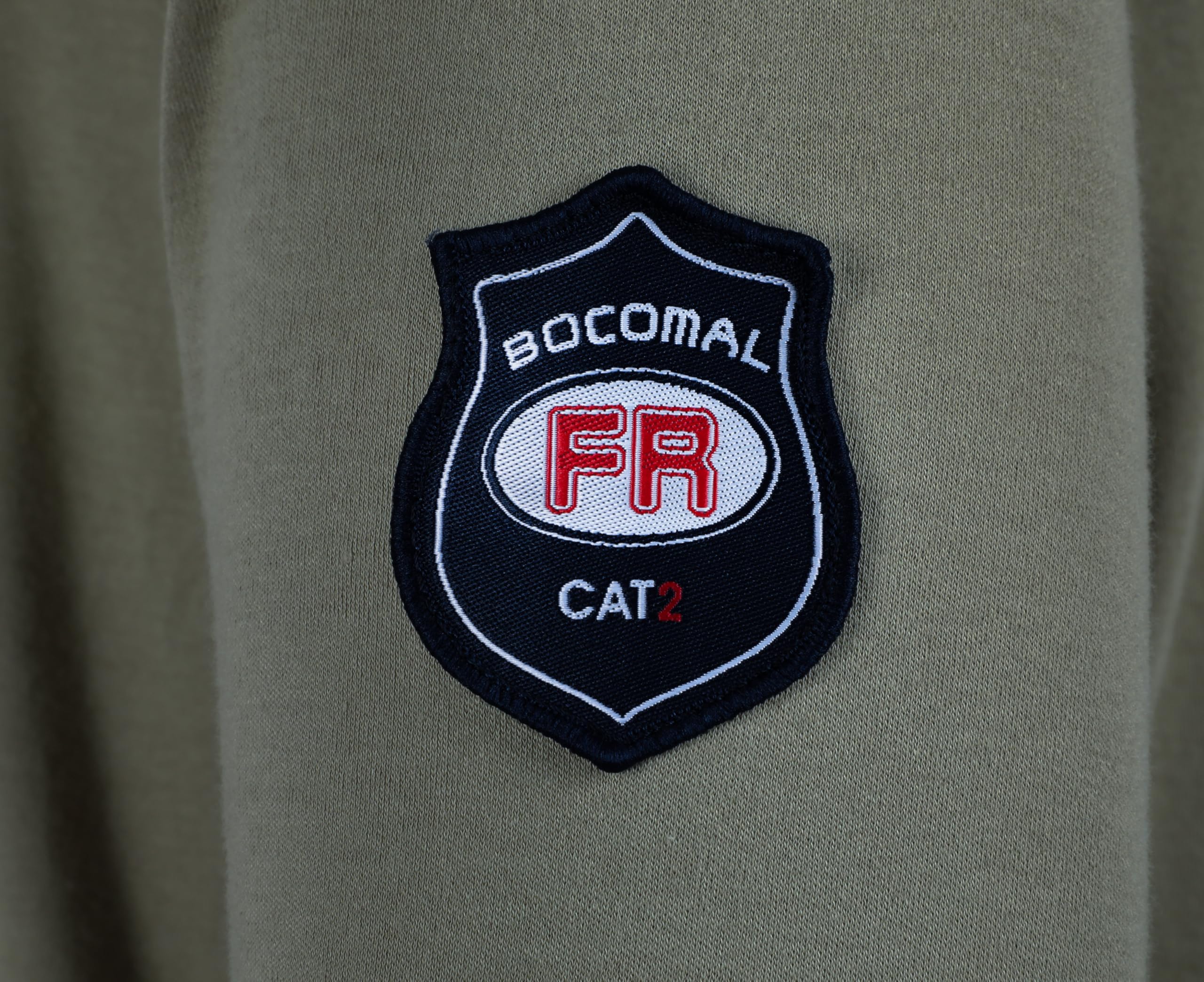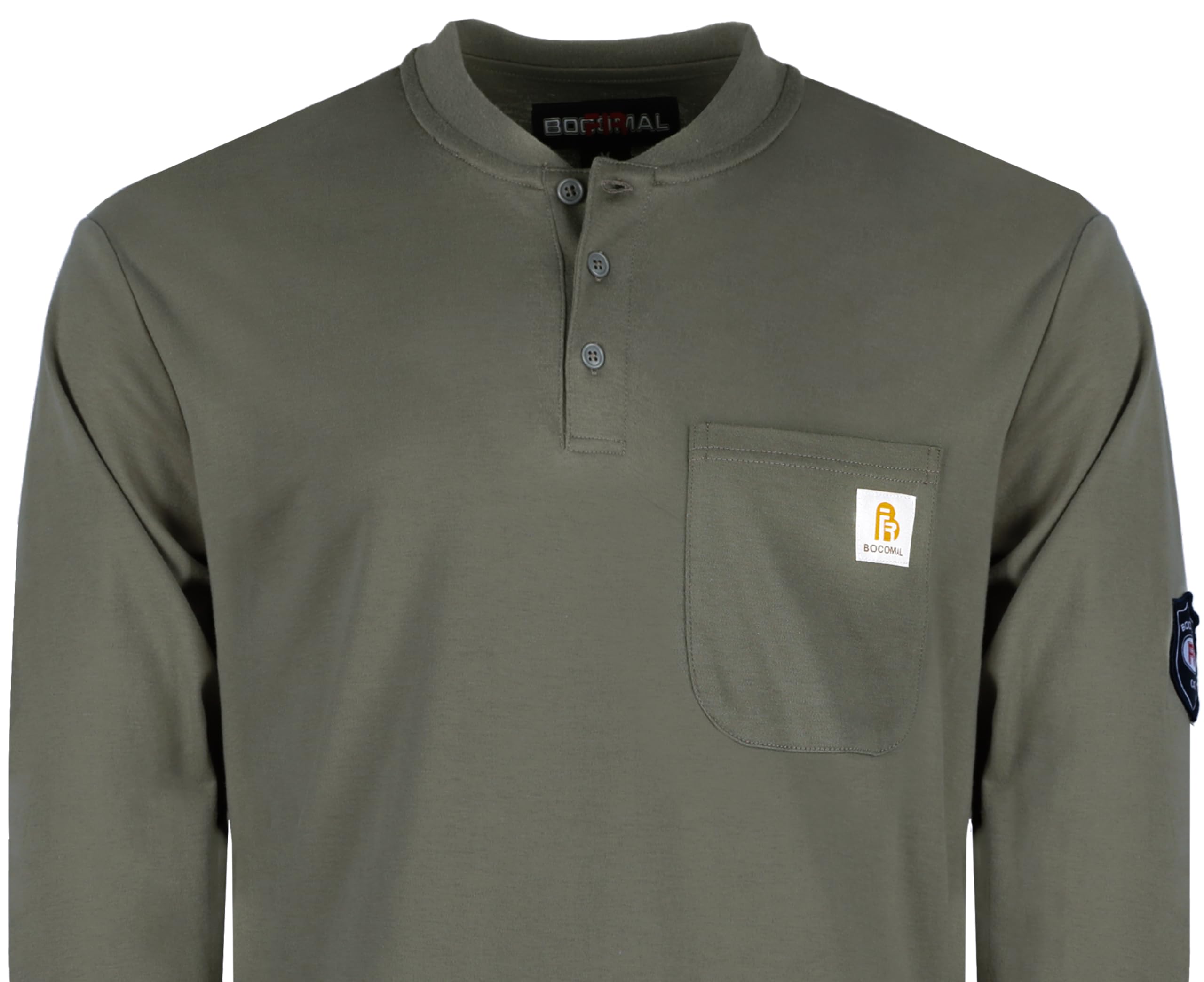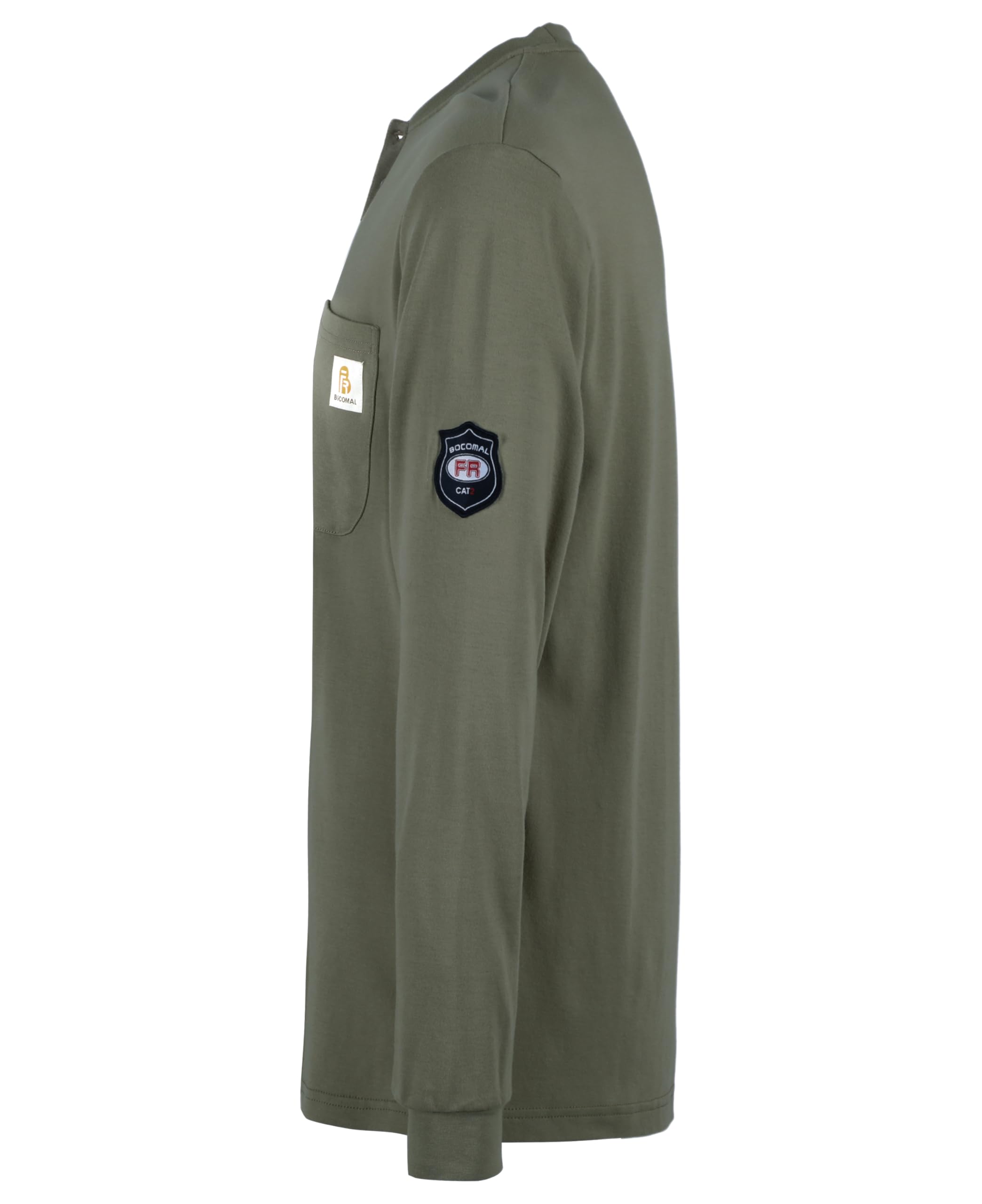 FR MATRIALS:5.5OZ Cotton Knit FR Treated,FR Buttons,FR Sewing Threads!Clear FR Tag on arms and bottom front.More FR info On Neck Tag About UL Certification.We Attached A Small Sample Inside Package For Cunstomers Simple FR Try