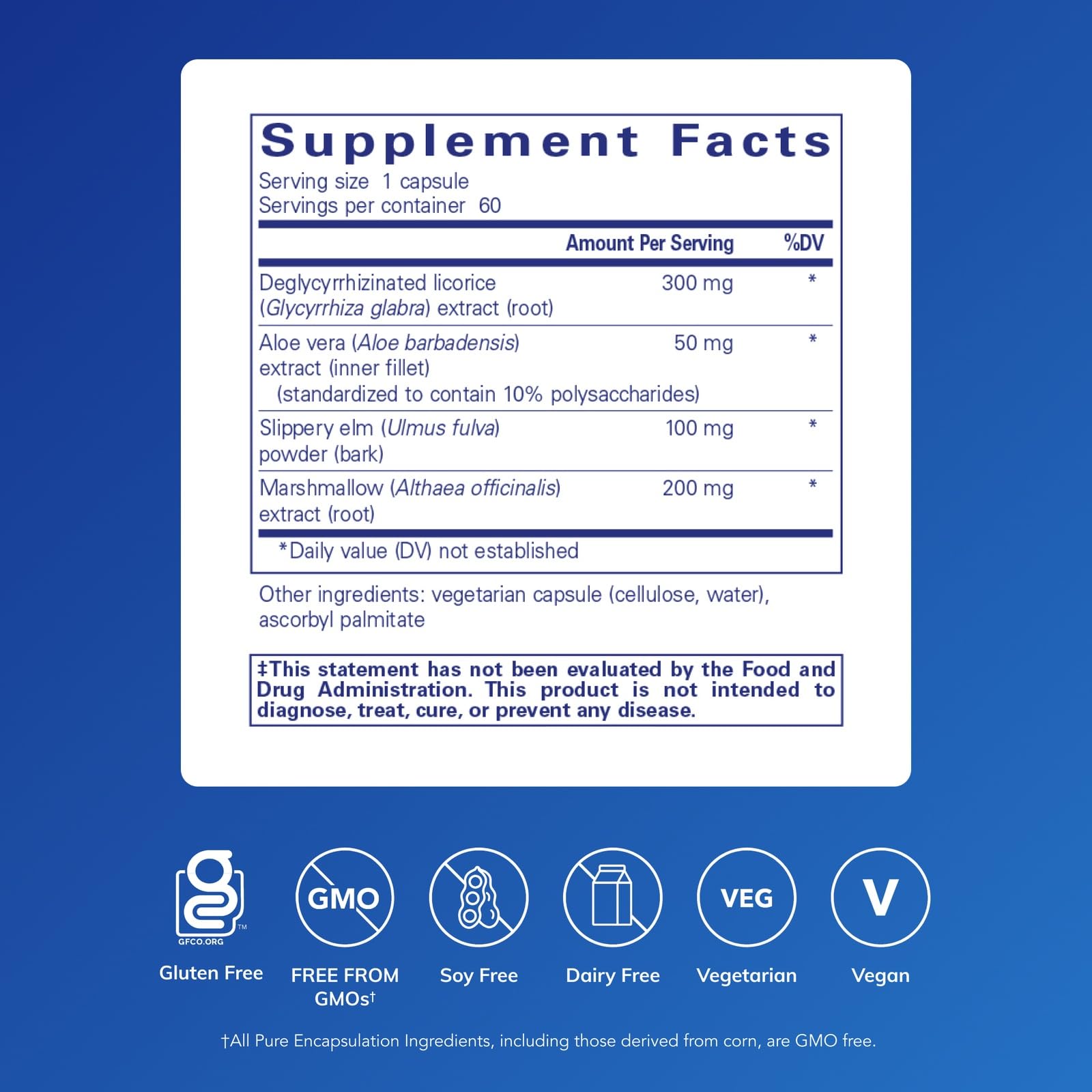 Herbal Blend: Our formula combines deglycyrrhizinated licorice (DGL) with herbal extracts like aloe vera and marshmallow root as well as slippery elm bark