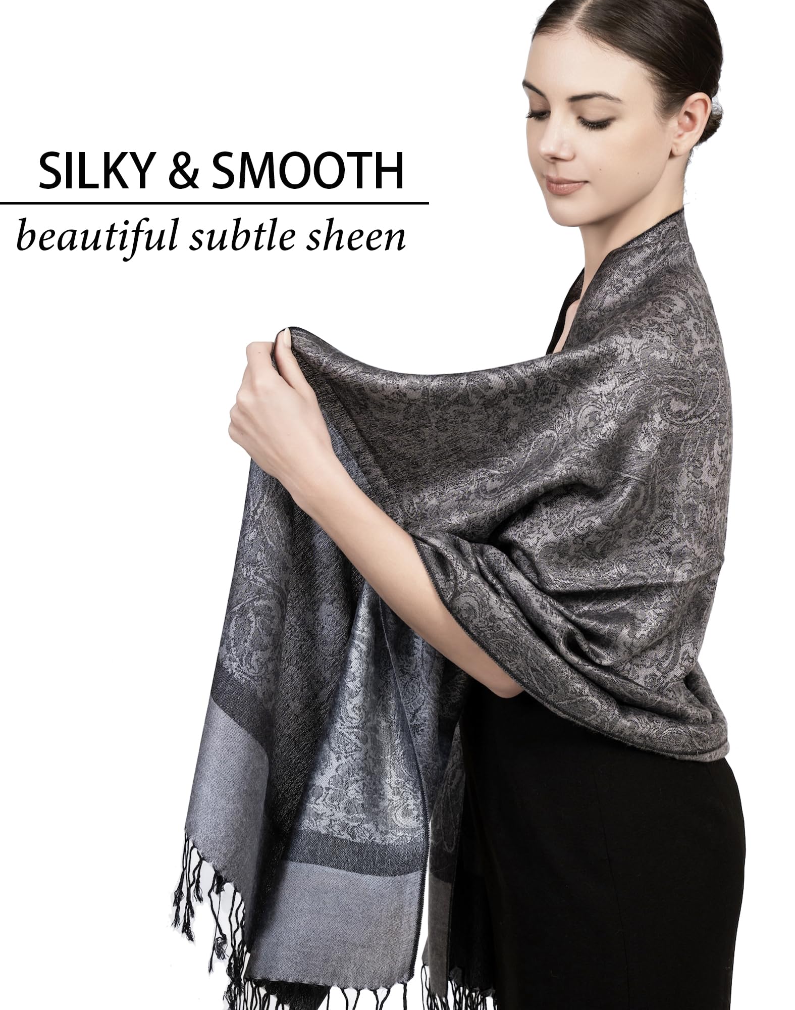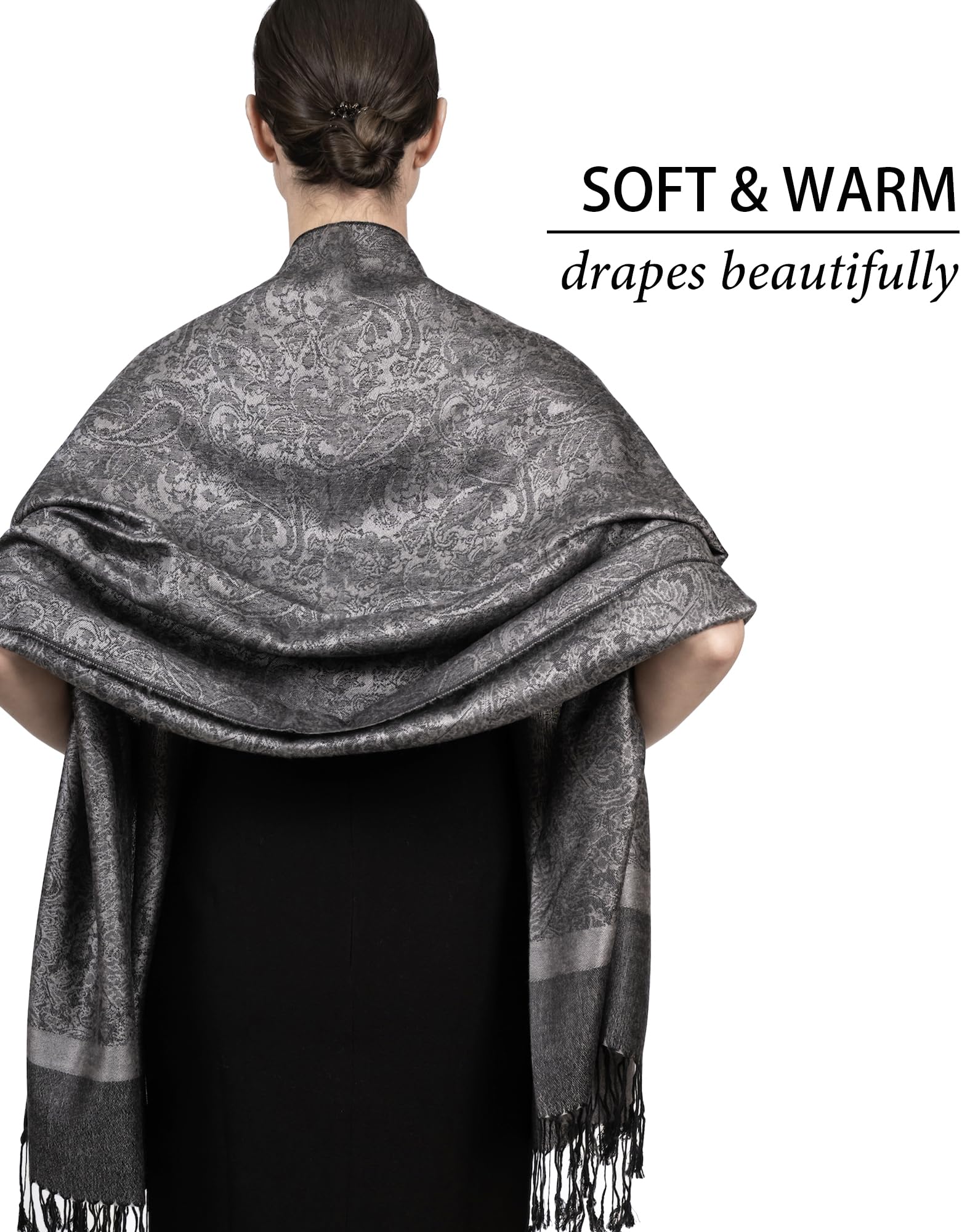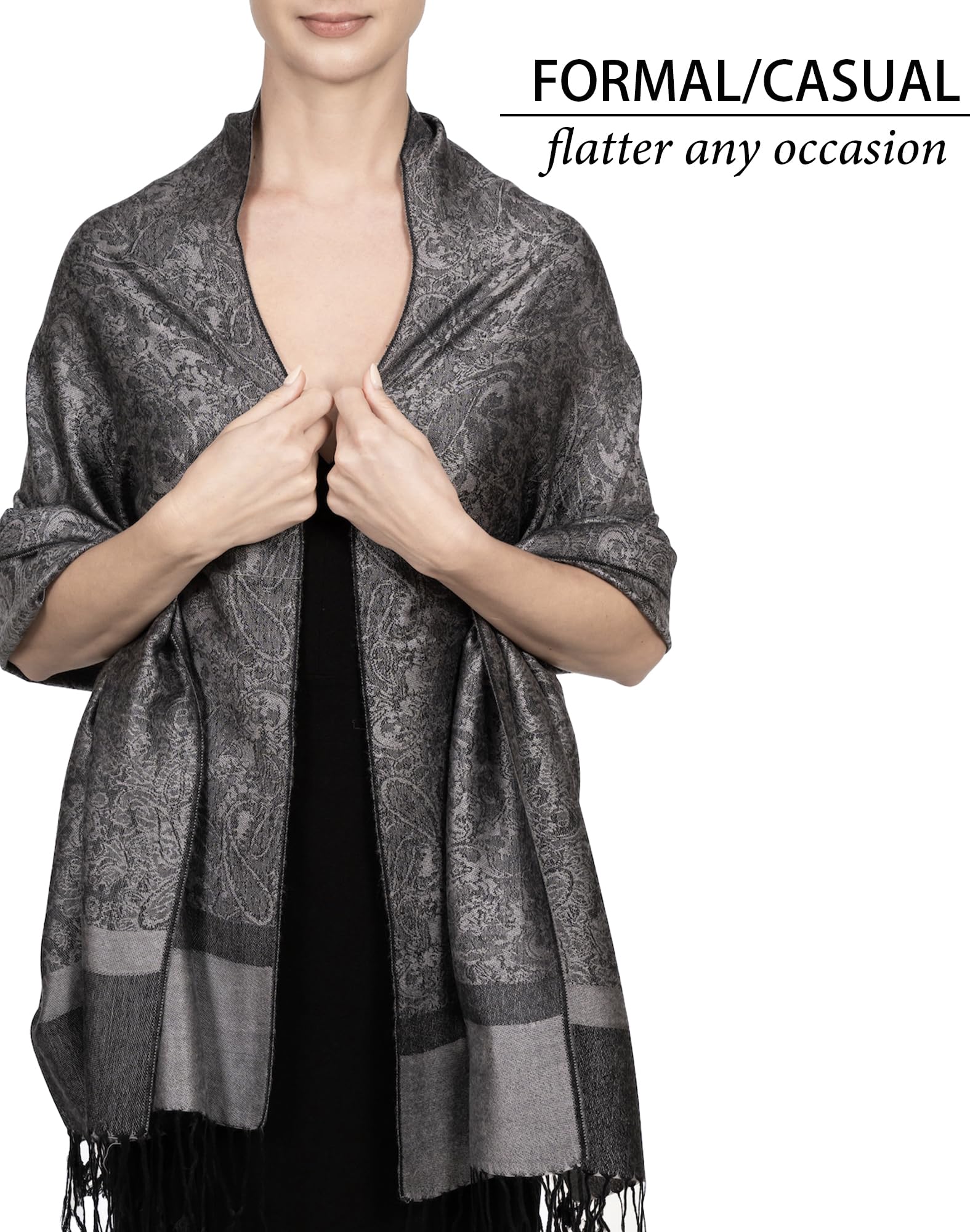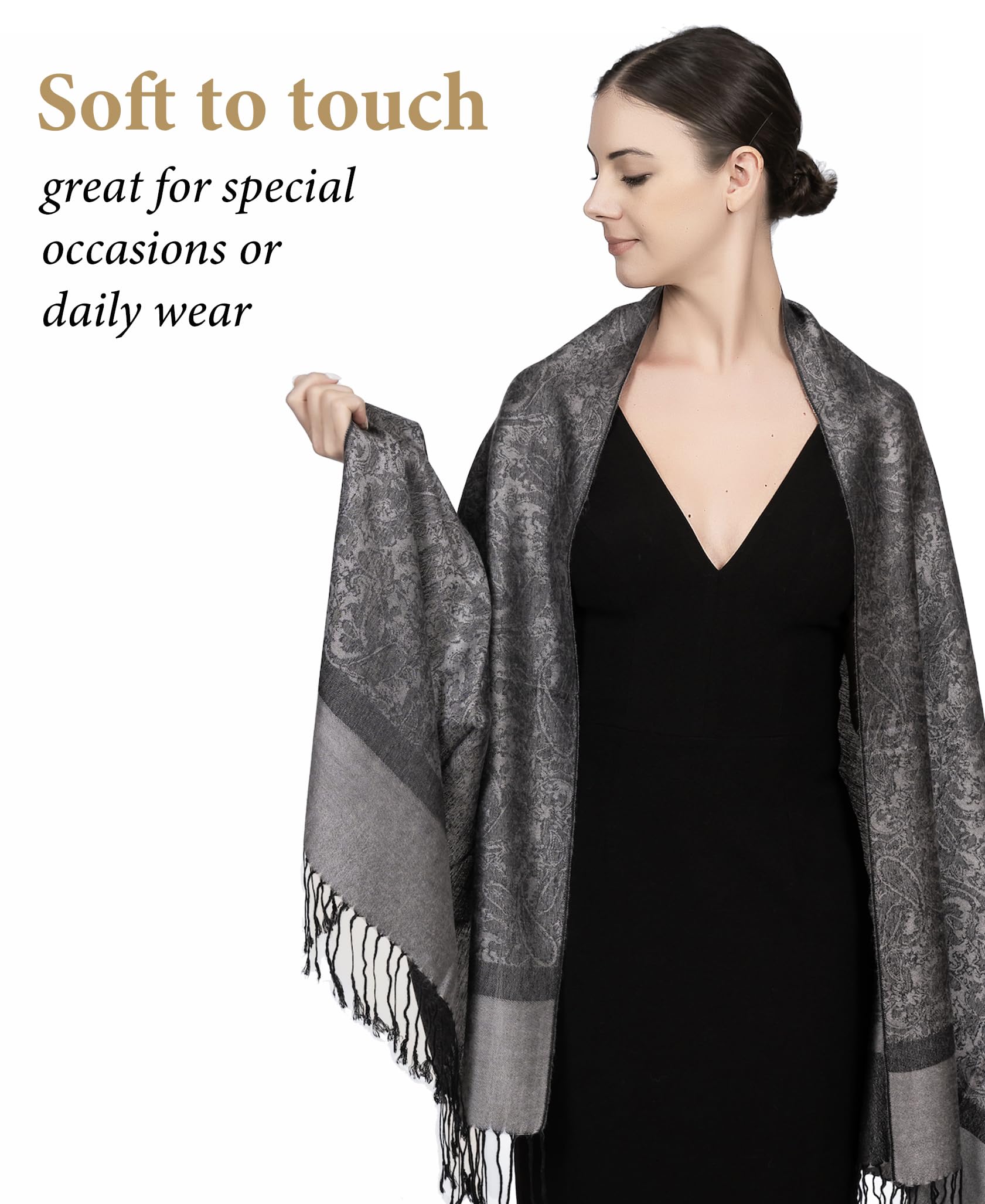 ✔️ Perfect for Events, Travel & Everyday Wear – Whether layered over evening wear, tossed on for travel, or added to daily outfits, this pashmina wrap works year-round. It’s ideal for chilly flights, churches, restaurants, and air-conditioned spaces — a cozy rave scarf or lightweight layer with a luxurious feel.