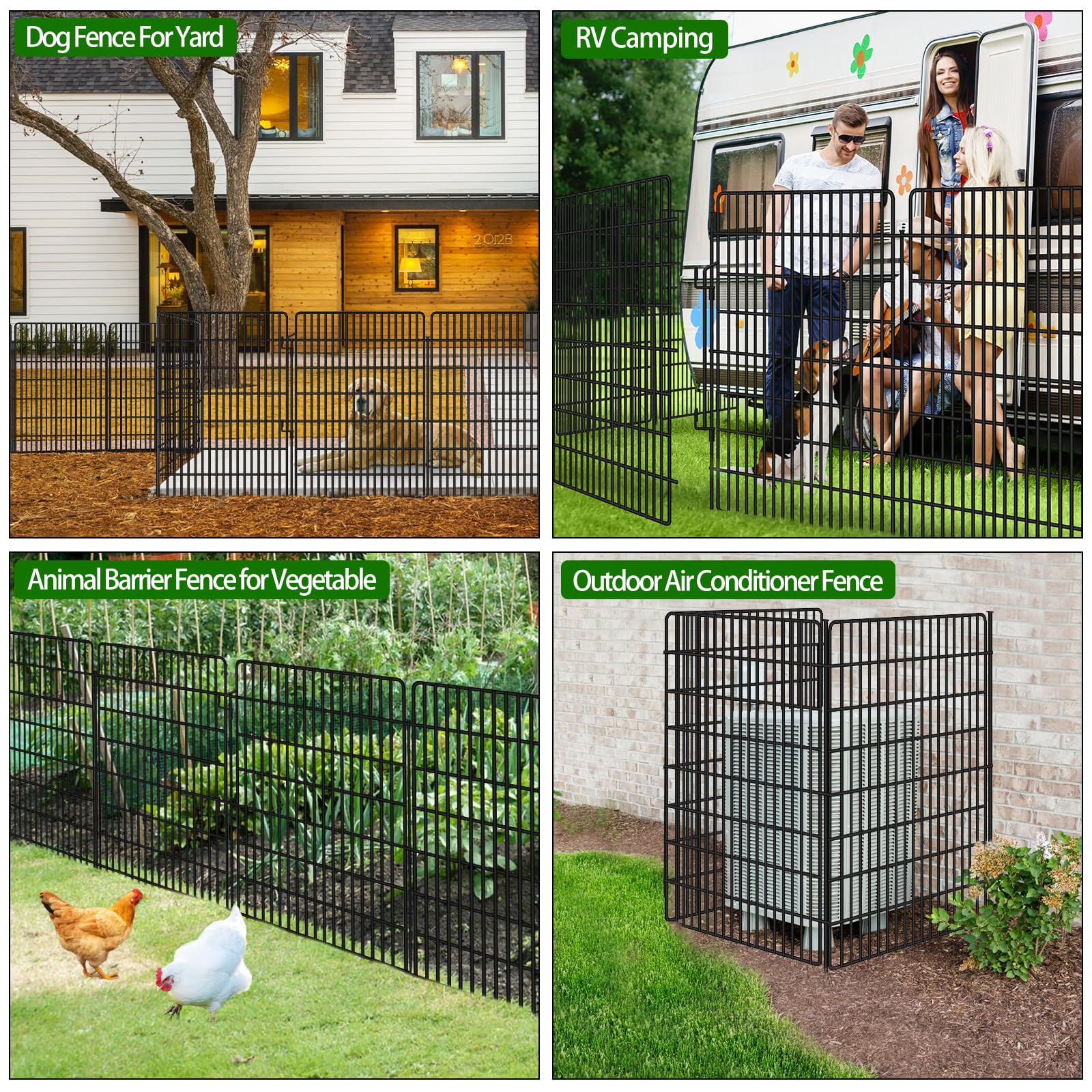 Multipurpose Decorative Fence --- The metal dog fence panels features a classic black design that perfectly complements any garden or patio style. This type of fencing is ideal for defining garden boundaries, creating safe play areas and confining your pets in a stylish and practical way. It can also be used decoratively to enhance the look of walkways, backyard decorations and garden borders.