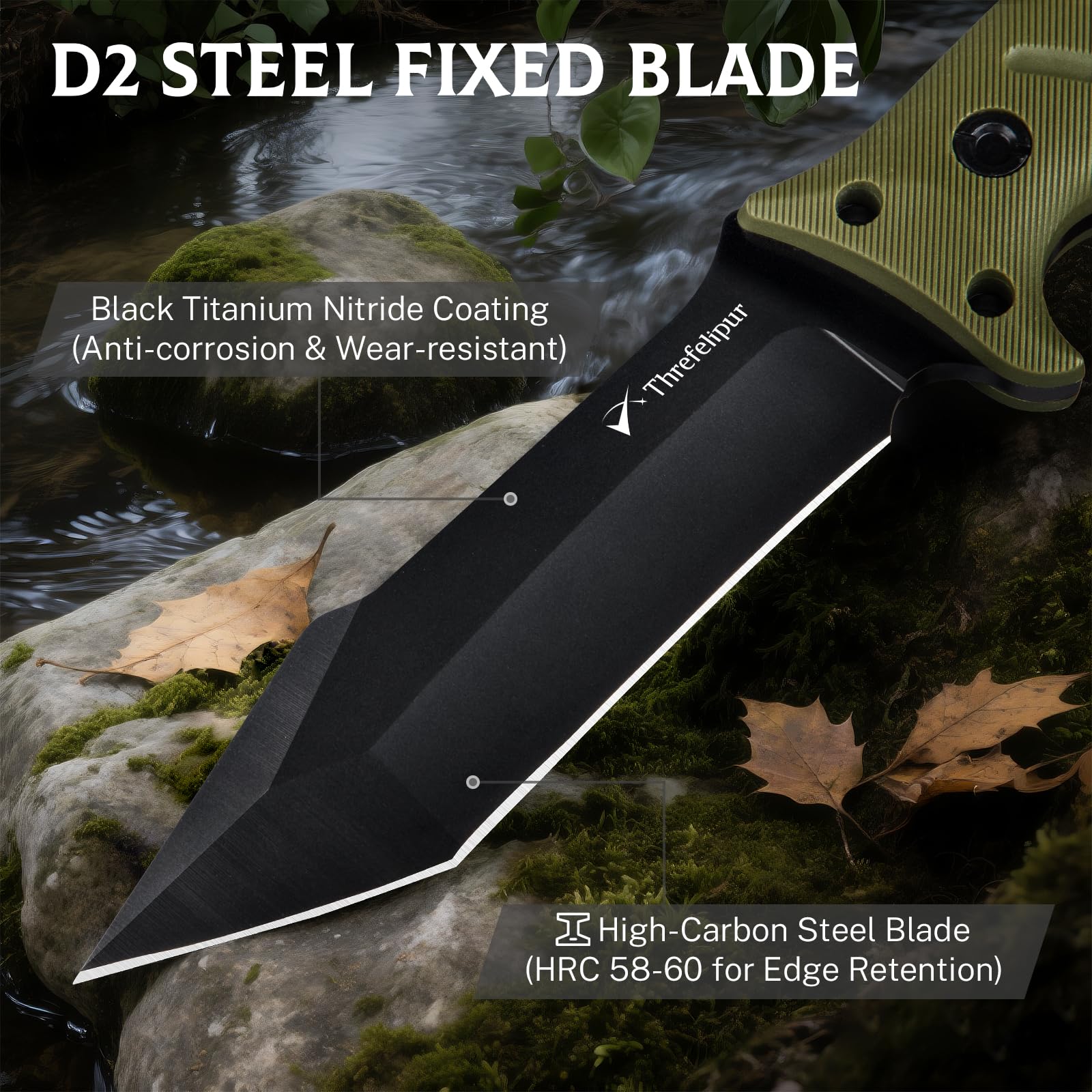 D2 Steel Fixed Blade: Crafted from D2 steel (58-60 HRC), the blade offers exceptional edge retention and wear resistance. The precision Tanto tip ensures powerful penetration, while full-tang construction supports heavy-duty use without compromise