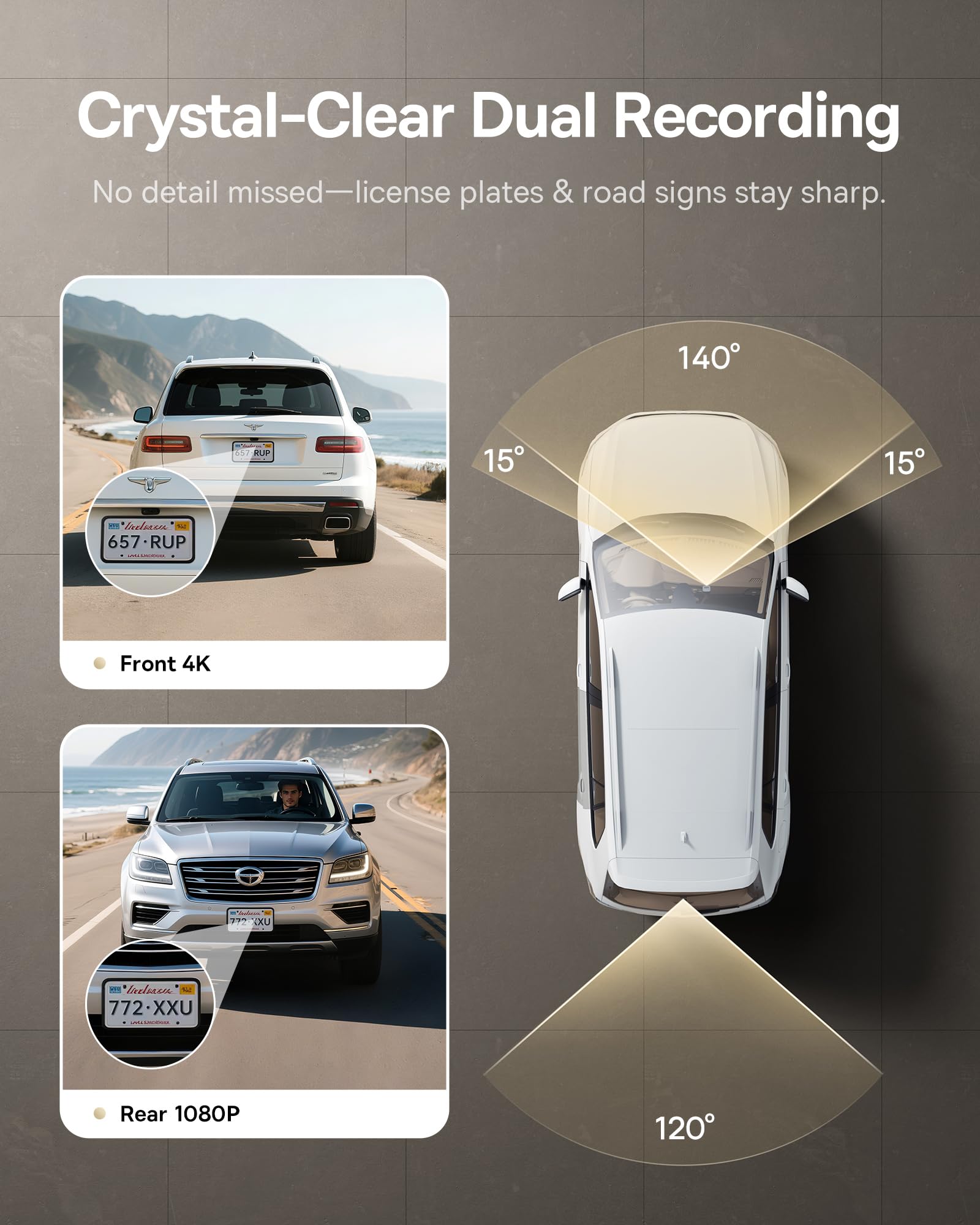 Crystal Clear 4K + 1080P Dual Recording: Capture ultra-sharp 4K UHD HDR front and 1080P rear footage, making license plates and road signs easily readable day and night. The 170° front and 120° rear lenses deliver comprehensive coverage around your vehicle.