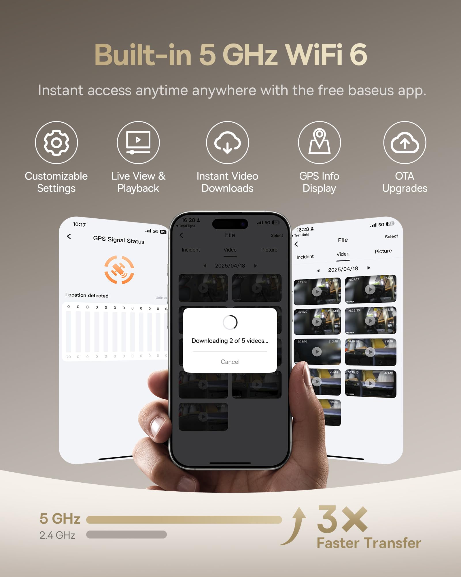 5GHz WiFi 6 & Easy App Control: Download videos 3x faster with the built-in 5GHz WiFi6 module. The free Baseus App lets you stream, save recordings, view GPS data, and receive OTA updates. Please note: App-to-dash cam connection works only in-car, not remotely.