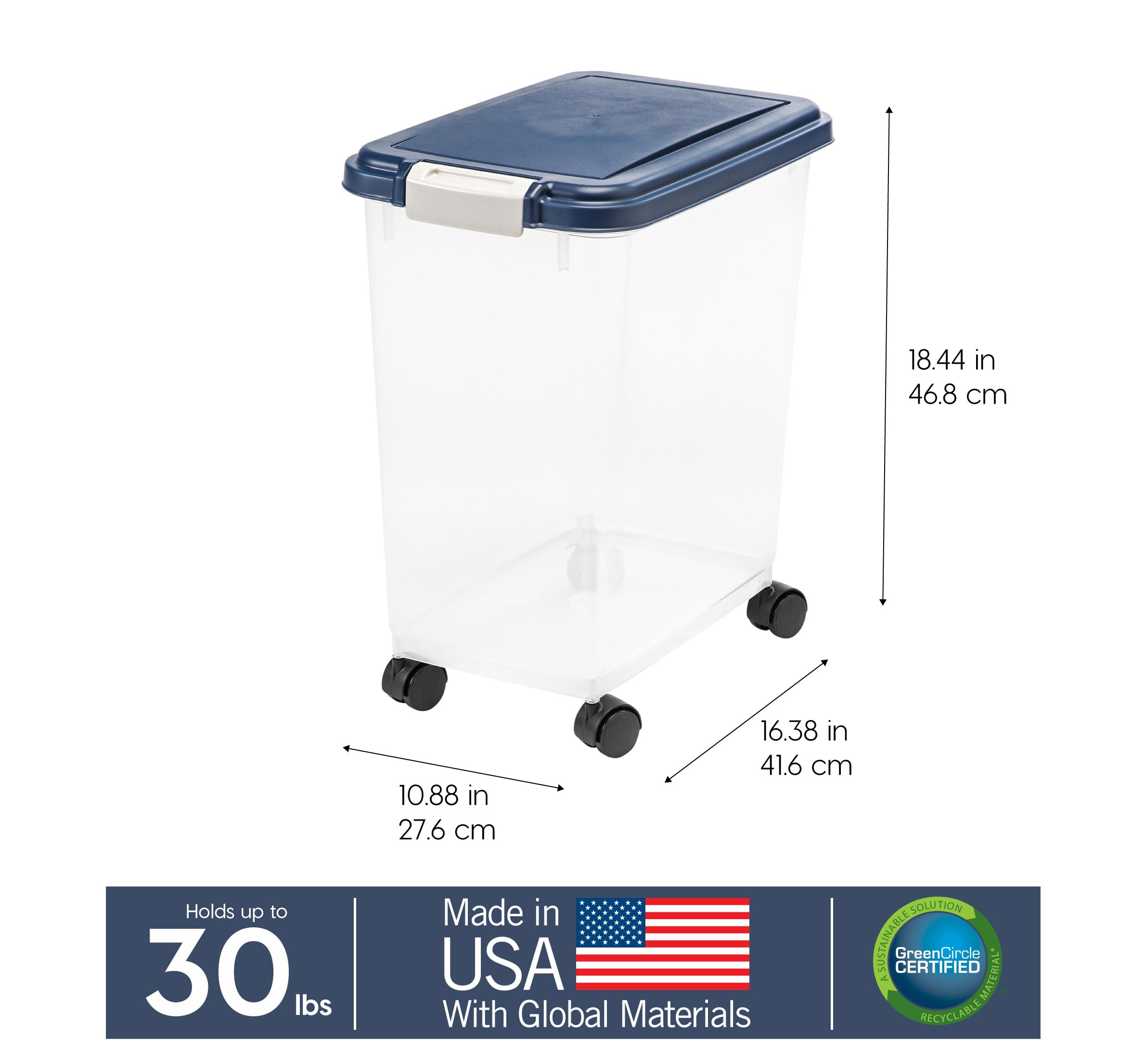 Meet the airtight container designed with your pet in mind. This 33 quart plastic airtight container is perfect for storing dog food, cat food, or any other pet food you wish to store. The sealed storage container features a foam seal and snap lock latches to keep contents fresh. Designed as pet food bins, these BPA free rolling storage bins offer many other uses as well such as leash and toy storage, pellet storage, grain storage, birdseed storage, cat litter storage, or even as a charcoal container. This IRIS airtight pet food container is translucent, versatile, functional, and the casters allow for easy mobility in any area of the house. Made in the USA.