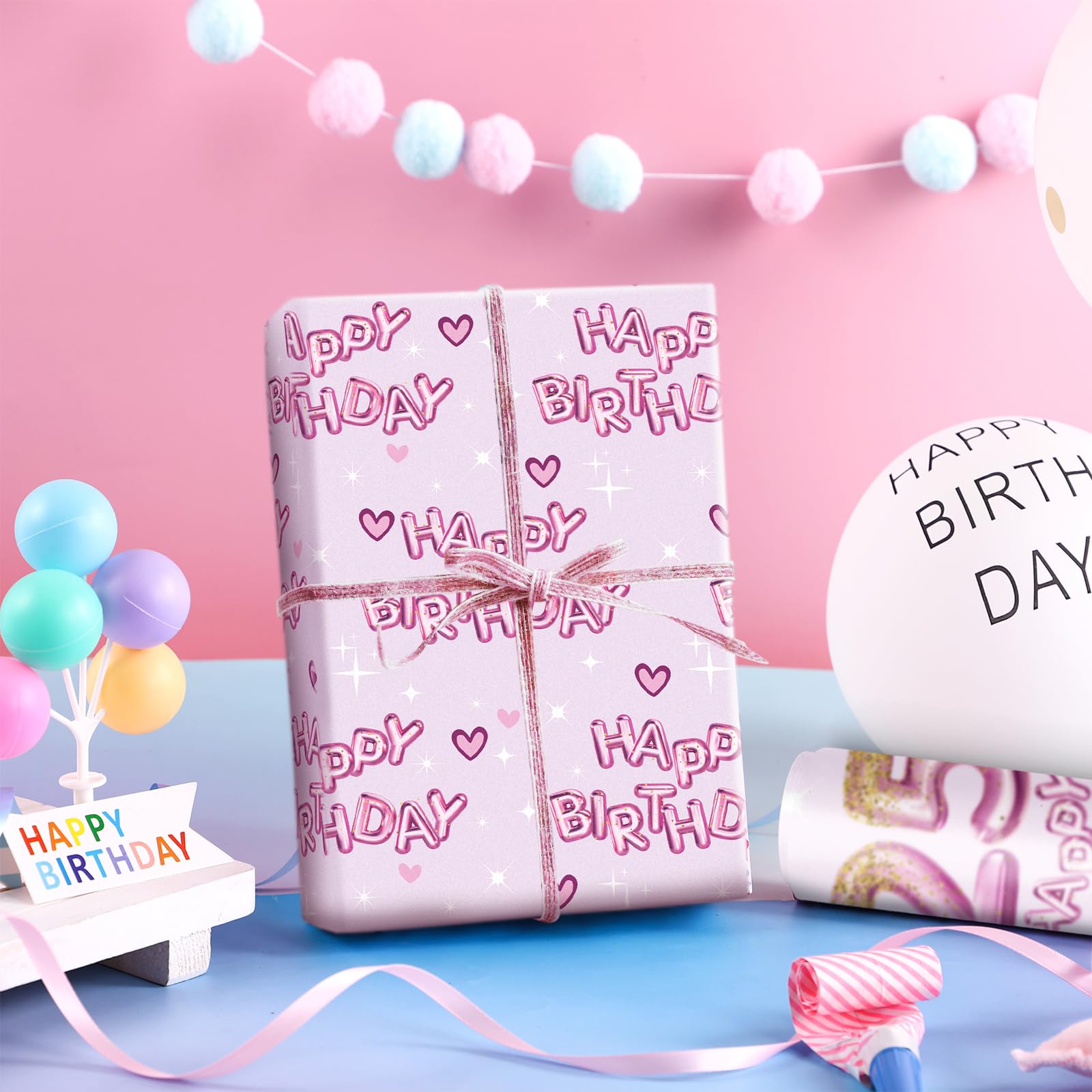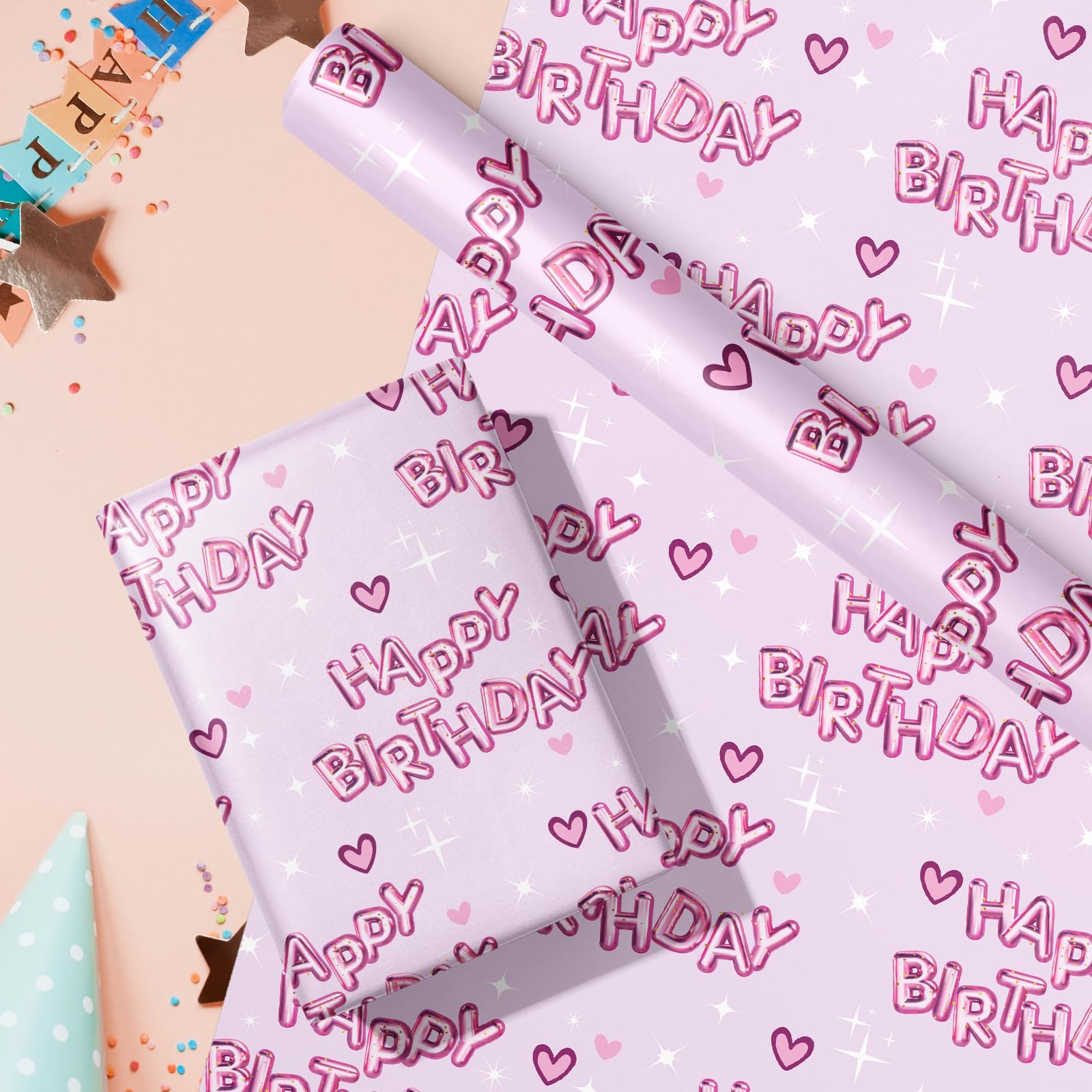 Enhance your gift-giving with this birthday wrapping paper roll. Made from strong and tear-resistant coated material, this wrapping paper keeps gifts secure and well-presented. This wrapping paper features adorable pink "HAPPY BIRTHDAY" text balloons and hearts that girls will love. Each mini roll measures 17 inches wide by 16.4 feet long, providing ample paper for wrapping multiple gifts. With its bright colors and engaging patterns, this wrapping paper is ideal for girls' birthday celebrations. Make every gift memorable with this colorful wrapping paper that's perfect for birthday parties and special occasions.