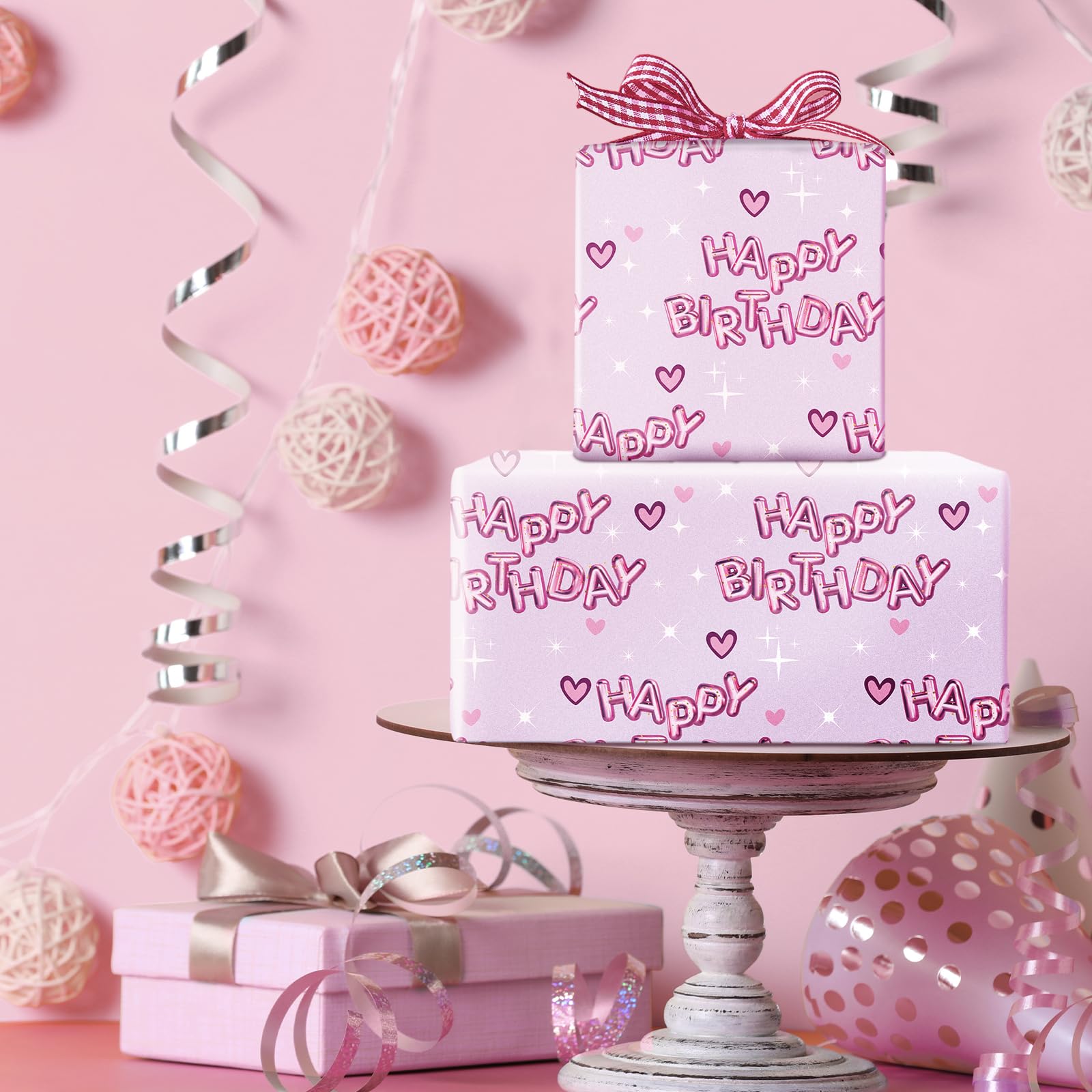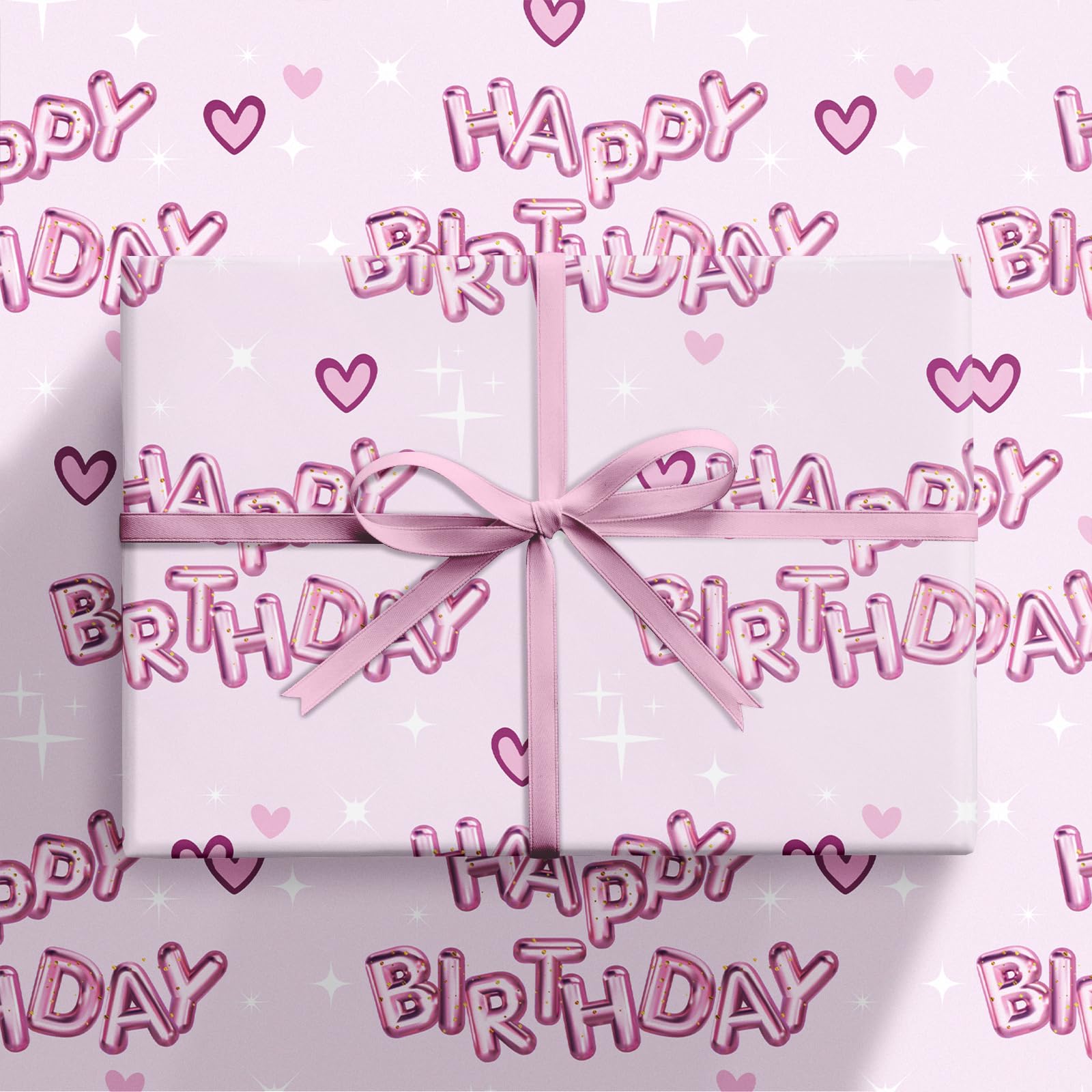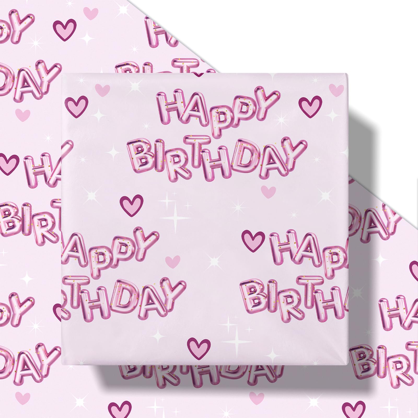 Vibrant Design: Wrapping paper printed pink "HAPPY BIRTHDAY" text balloons and hearts patterns on pink background that adds excitement to any gift, making it perfect for girls' birthday parties