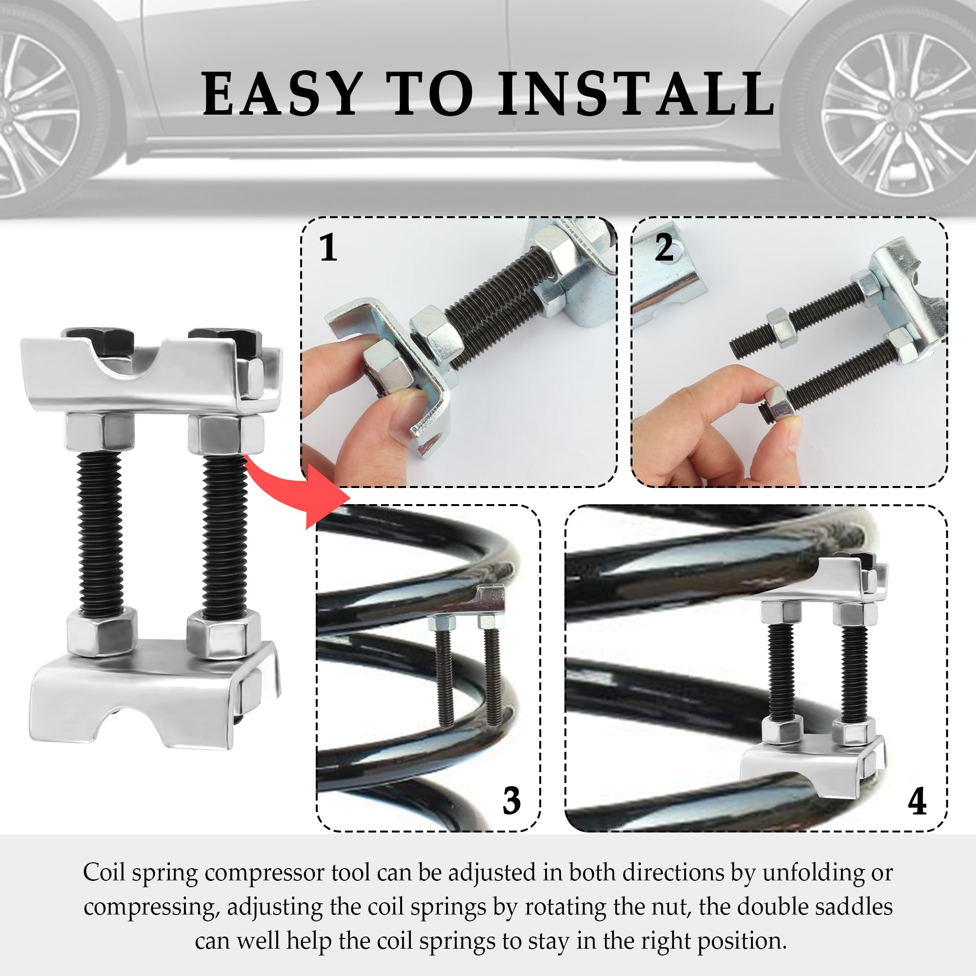 【Easy to Install】 Coil spring compressor tool can be adjusted in both directions by unfolding or compressing, adjusting the coil springs by rotating the nut, the double saddles can well help the coil springs to stay in the right position, which can provide extra gap for larger tires, easy to install.