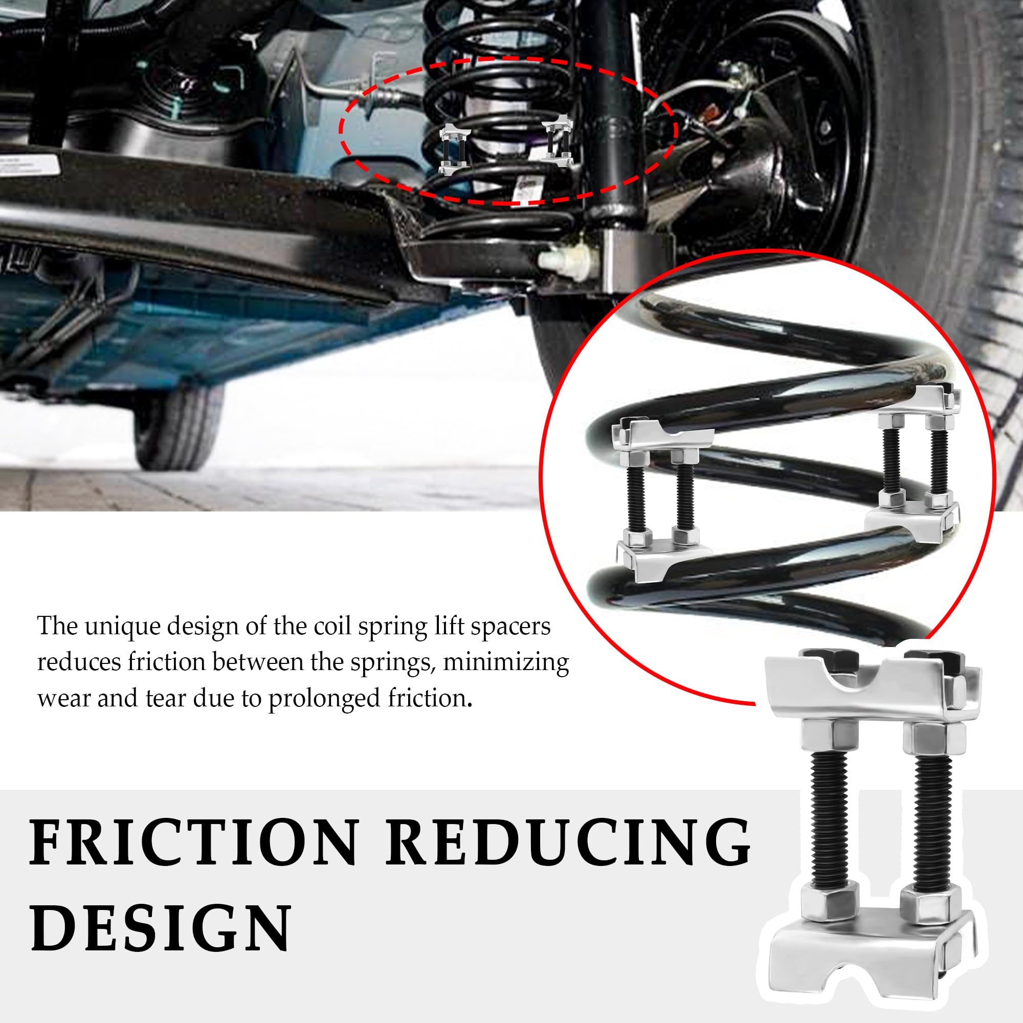 【Friction Reducing Design】 The unique design of the coil spring lift spacers reduces friction between the springs, minimizing wear and tear due to prolonged friction and prolonging the service life of the springs. At the same time, the shims provide an additional layer of protection for the springs in harsh road conditions.