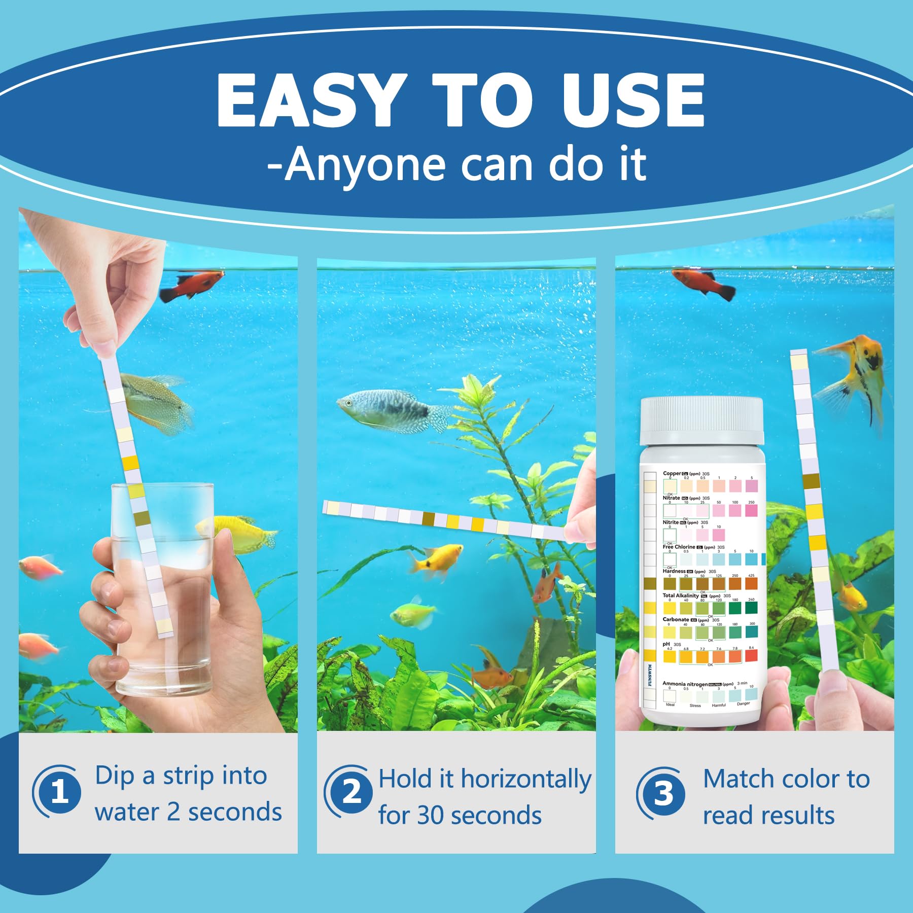 Comprehensive 9-in-1 Test Strips: FUNSWTM aquarium test strips accurately test 9 essential water parameters including Ammonia, pH, Nitrate, Chlorine, Nitrite, Hardness, Alkalinity, and Copper for both freshwater and saltwater aquariums.